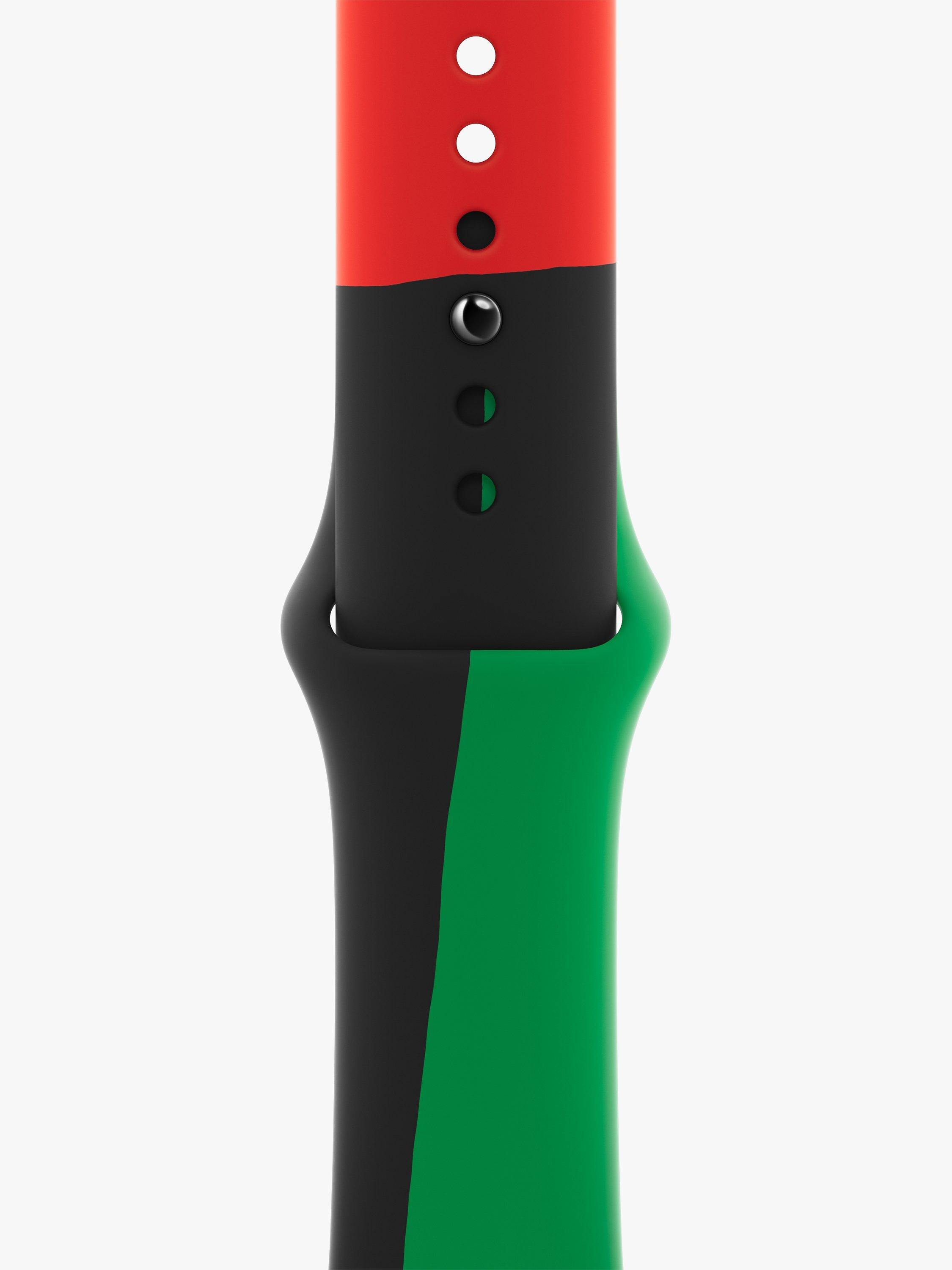 Designed by Black creatives and allies throughout Apple to celebrate and acknowledge Black history and culture, the Black Unity Sport Band is inspired by the colours of the Pan-African flag and pays homage to the rich tradition and craft of quilt-making.