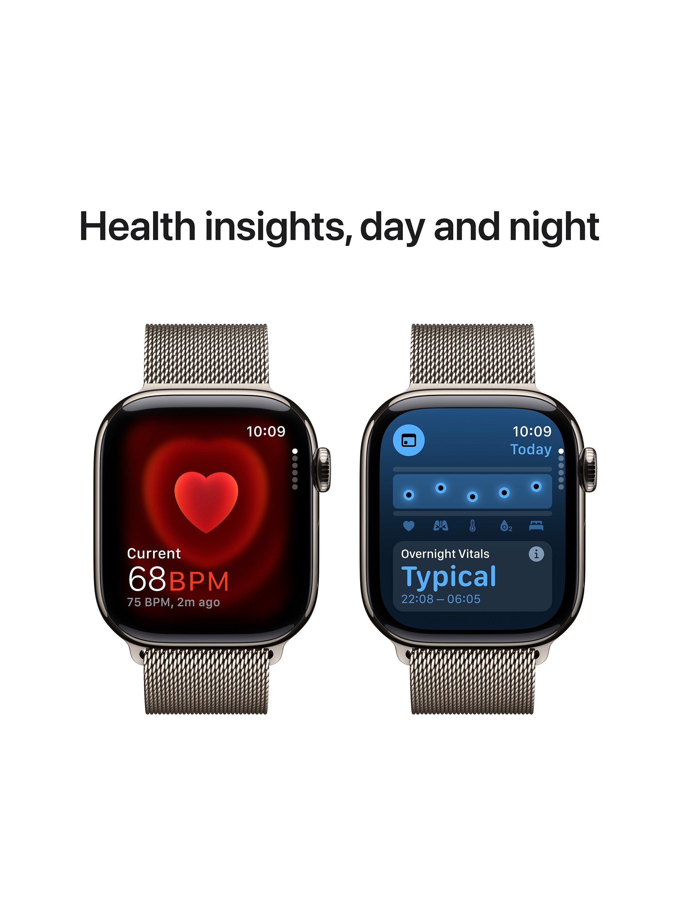Take an ECG anytime(6). Get notifications if you have high or low heart rate or an irregular heart rhythm(7). Understand your menstrual cycle and get retrospective ovulation estimates(8). See overnight health metrics like heart rate, respiratory rate and more with the Vitals app(9). Track sleep and get notifications if signs of sleep apnoea are detected(1).
