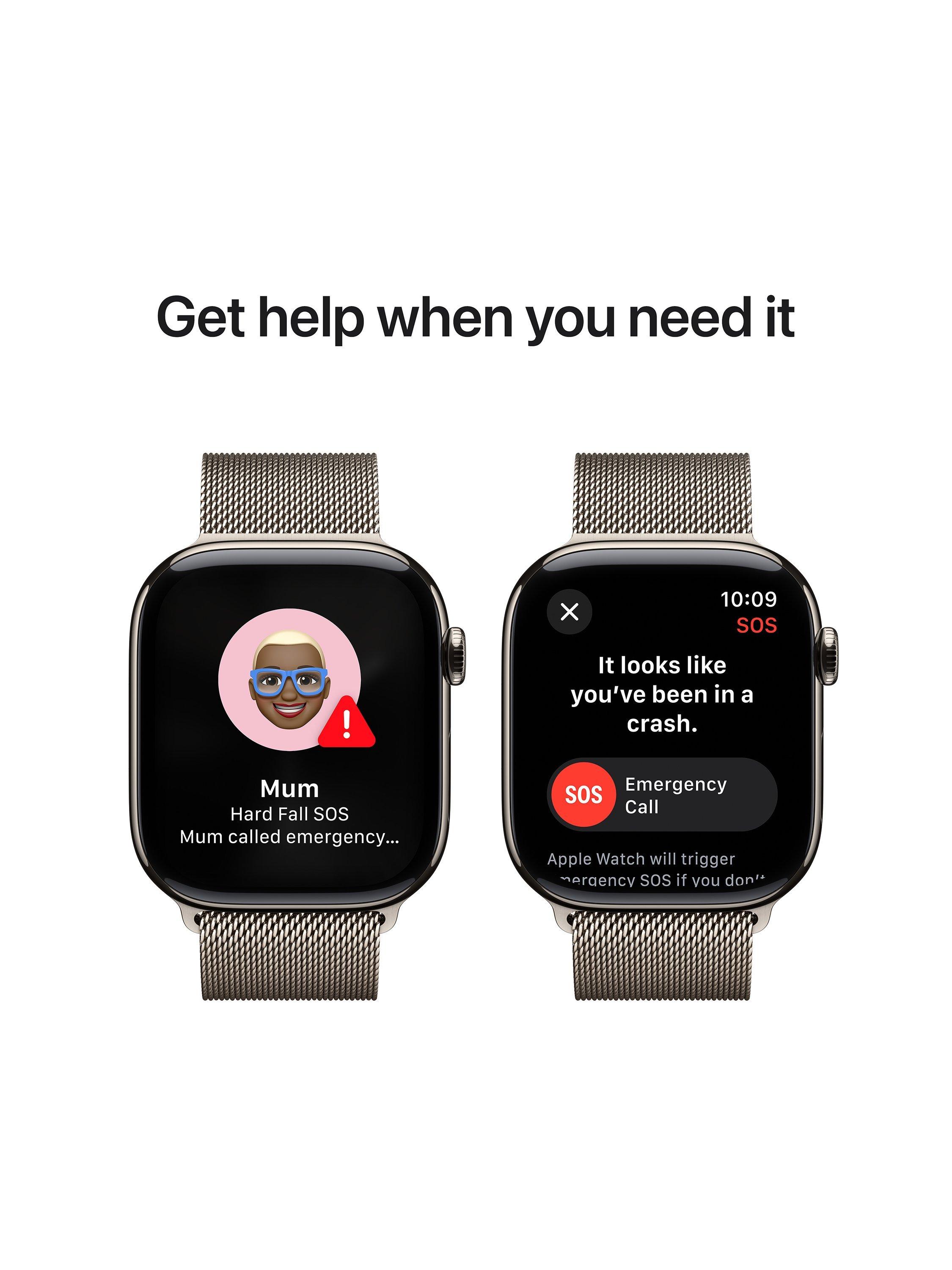 Fall Detection(11) and Crash Detection can connect you to emergency services in the event of a hard fall or a serious car crash. Emergency SOS lets you call for help with the press of a button(4). Check In automatically notifies a loved one when you’ve arrived at a your