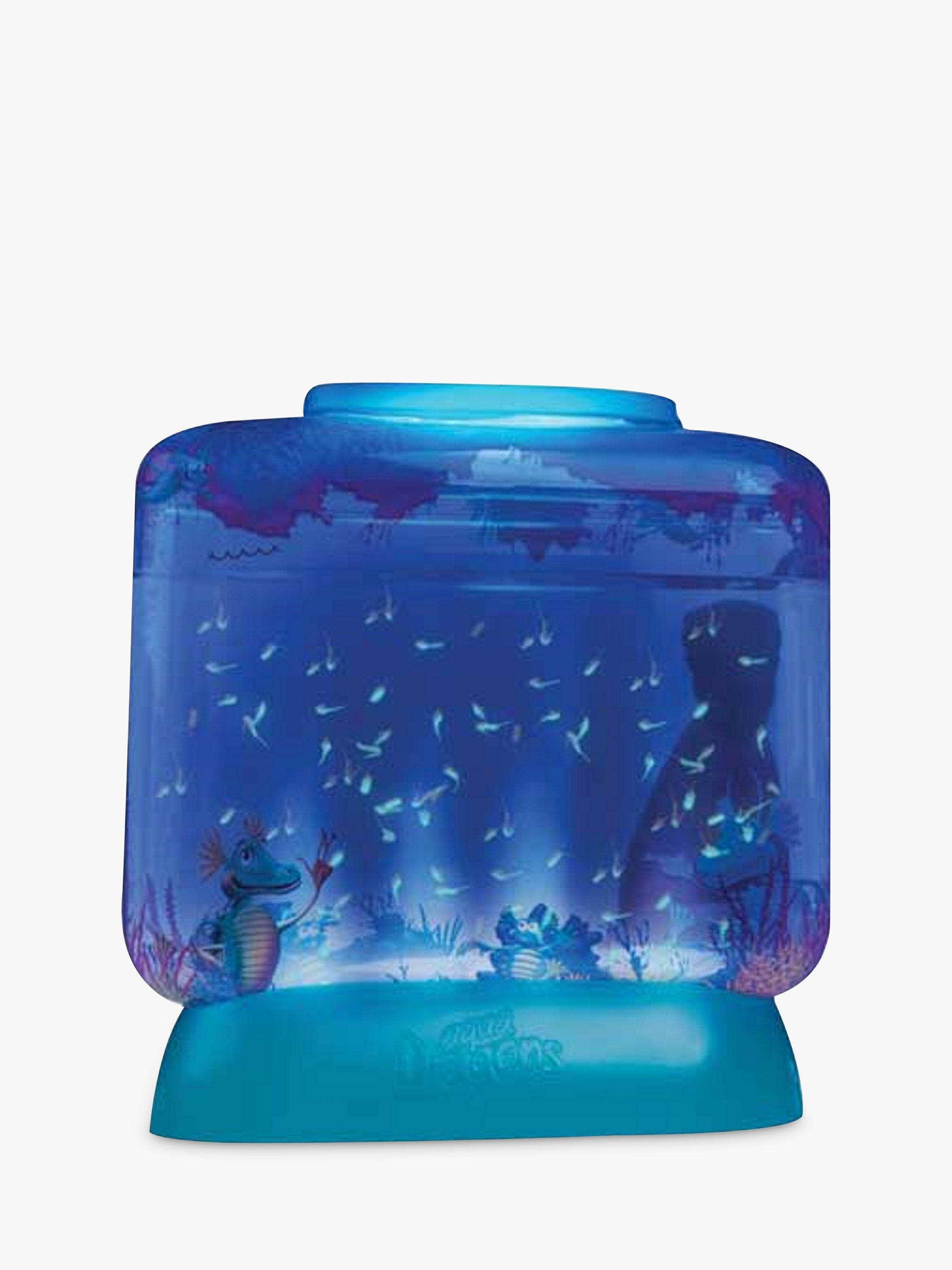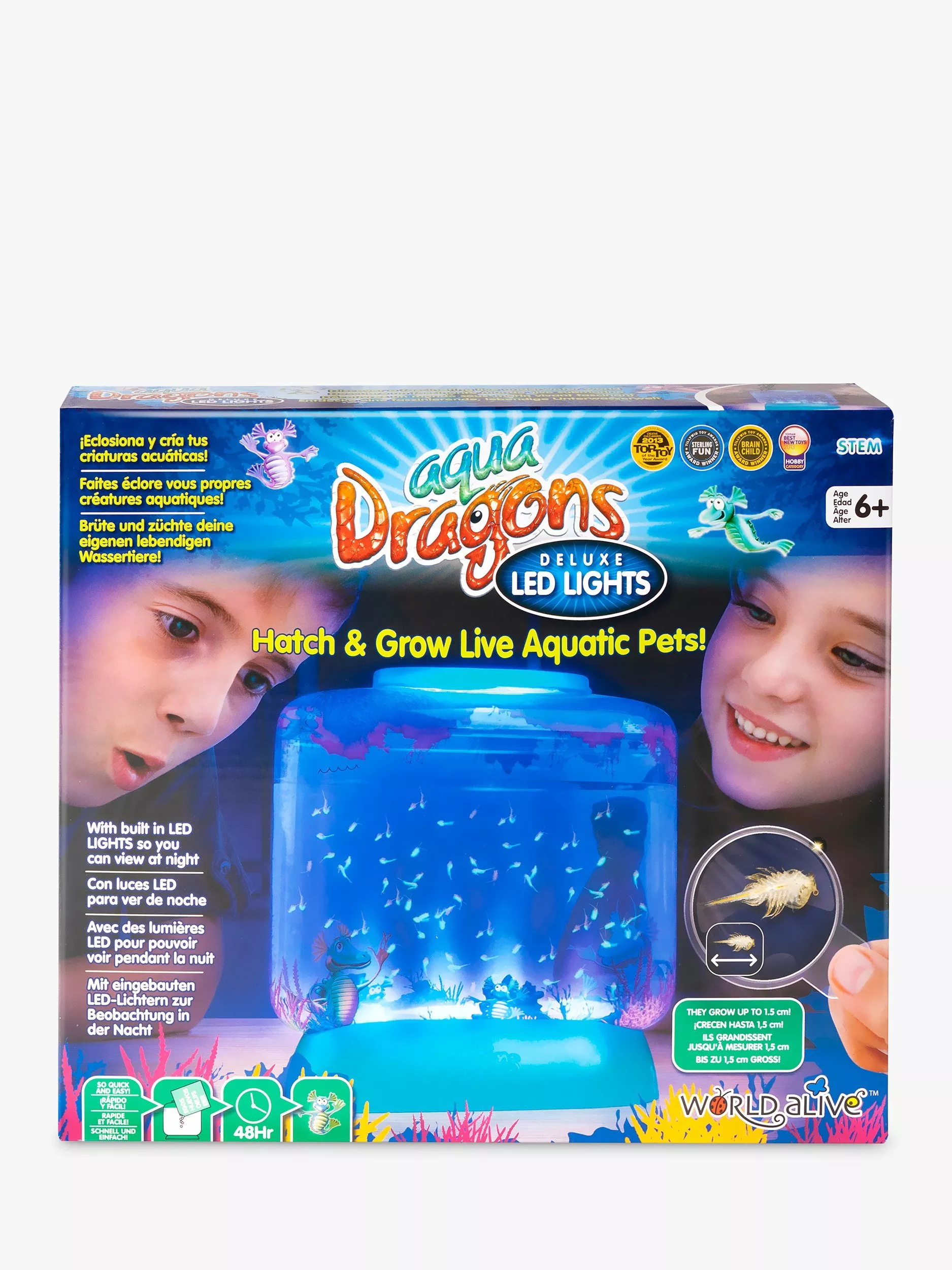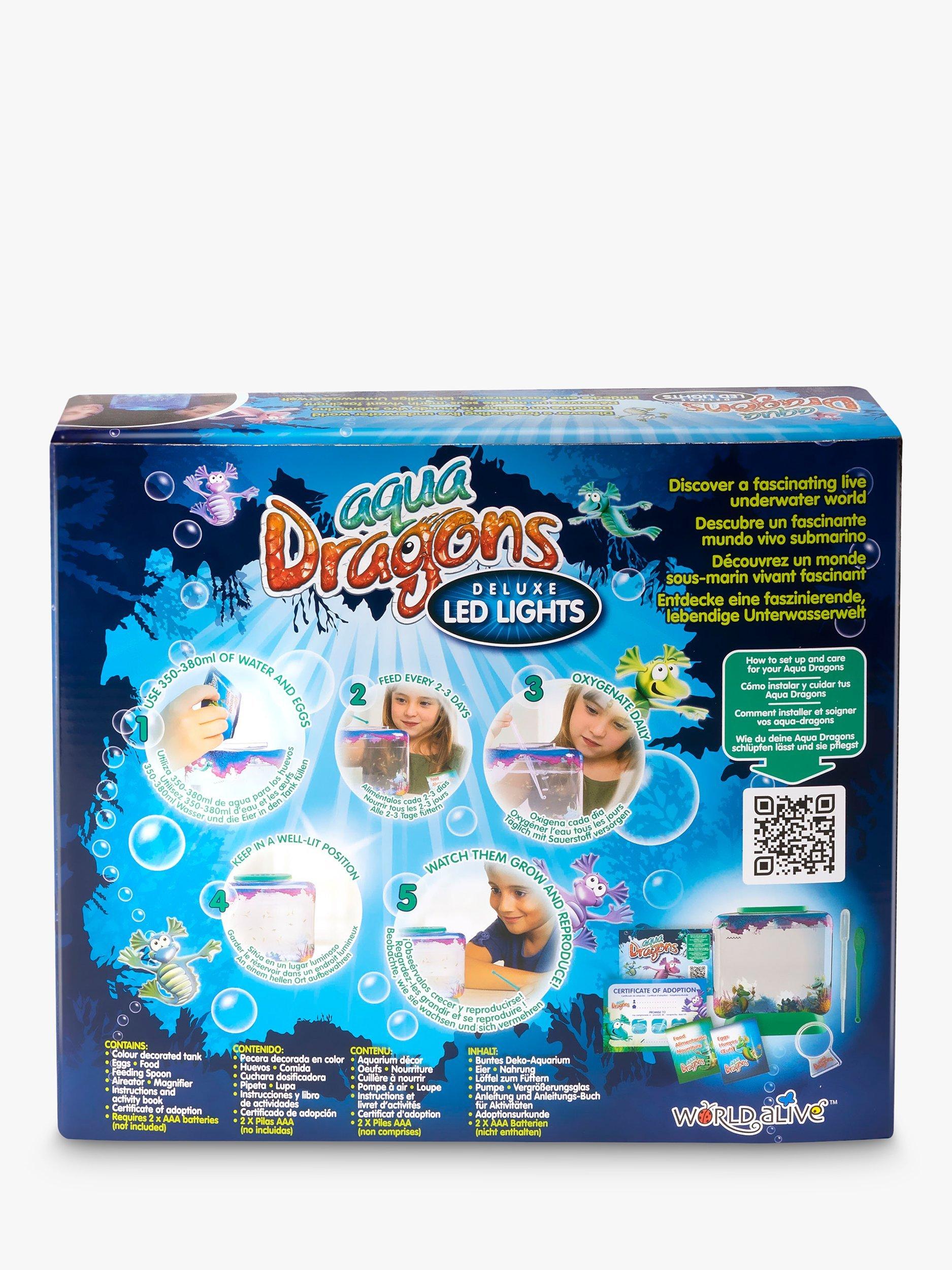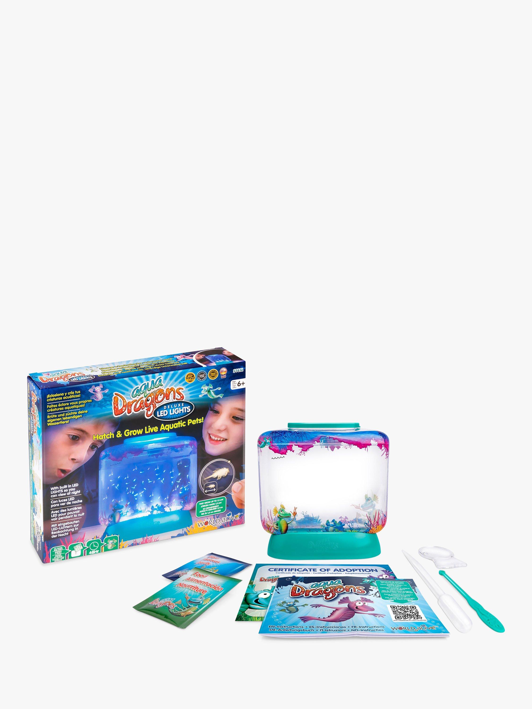 The Aqua Dragons Deluxe Set contains everything needed to get started, including the LED Illuminated aquarium (aquarium size 15cm w x 16cm h x 4cm depth), preserved eggs, food, pipette, magnifier, feeding spoon and full instructions. Just add water and they will miraculously hatch within just 2-3 days. Initially, the hatchlings will be microscopic but they will be seen within 5-7 days. They are fascinating to watch as they swim and play graciously in their aquatic underwater world. This deluxe kit has the added bonus of beautiful blue LED lights in the base of the tank and a magnifier to observe your hatchlings. The set also includes a responsible Aqua Dragons ownership certificate.