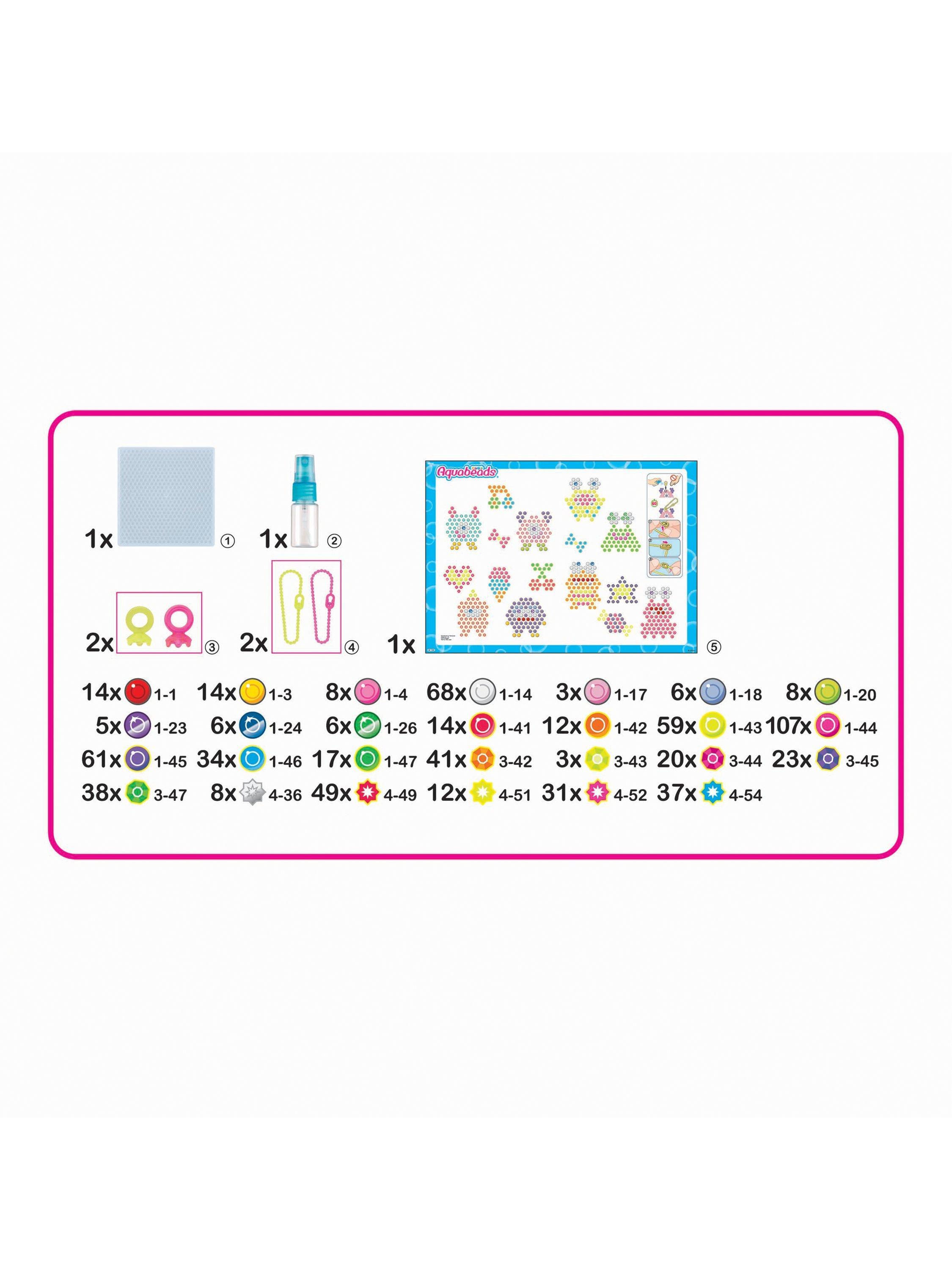 Includes 700 Classic beads, Polygon beads and Star beads of 27 kinds, including the vibrant neon colours, a layout tray, a sprayer, four sets of keychain attachments with keychain strap, and a template sheet with instructions.