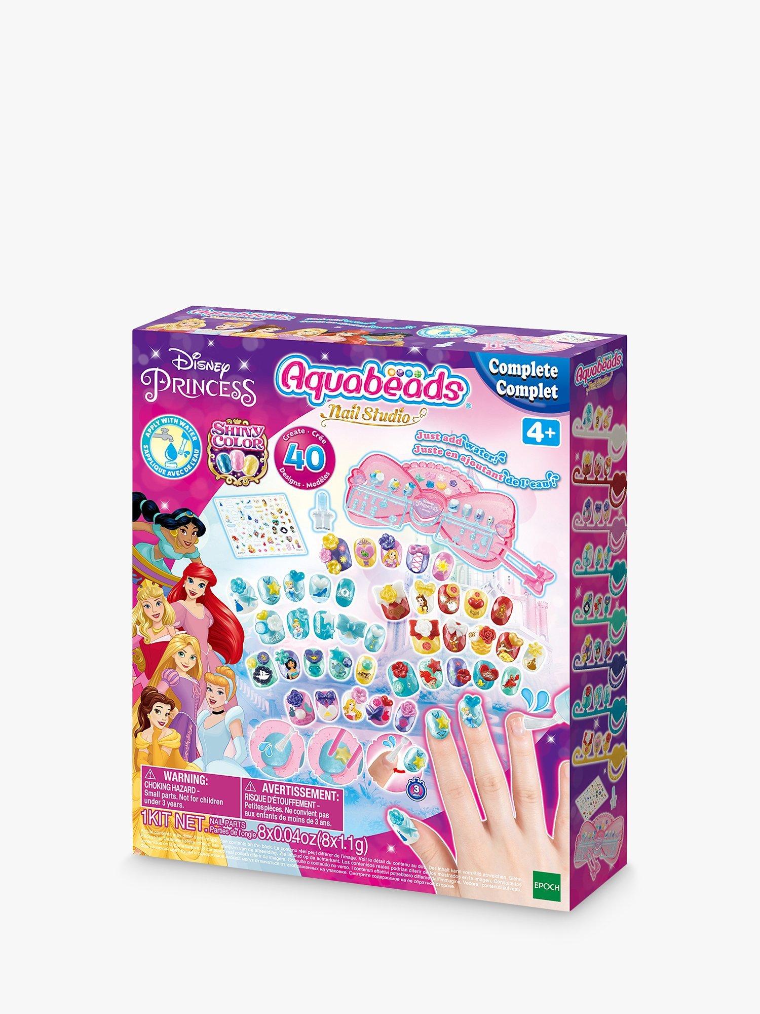The Aquabeads Nail Studio - Disney Princess includes Aquabeads nails and decorations for over 40 nail designs, worktable, plastic tweezers, water applicator with brush, stickers, and instructions. The shiny colour Aquabeads nails and decorations add glittery and shimmering feel to your Aquabeads nails creations!