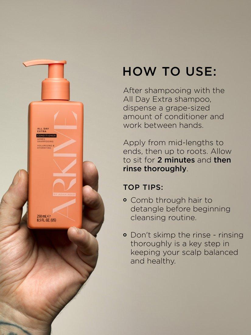 After shampooing your hair, pump out a grape-sized amount of conditioner and work into your hands ahead of applying to hair. Work through mid-lengths to ends, and then up to roots. Leave to sit for 2 minutes and rinse thoroughly with cool water.