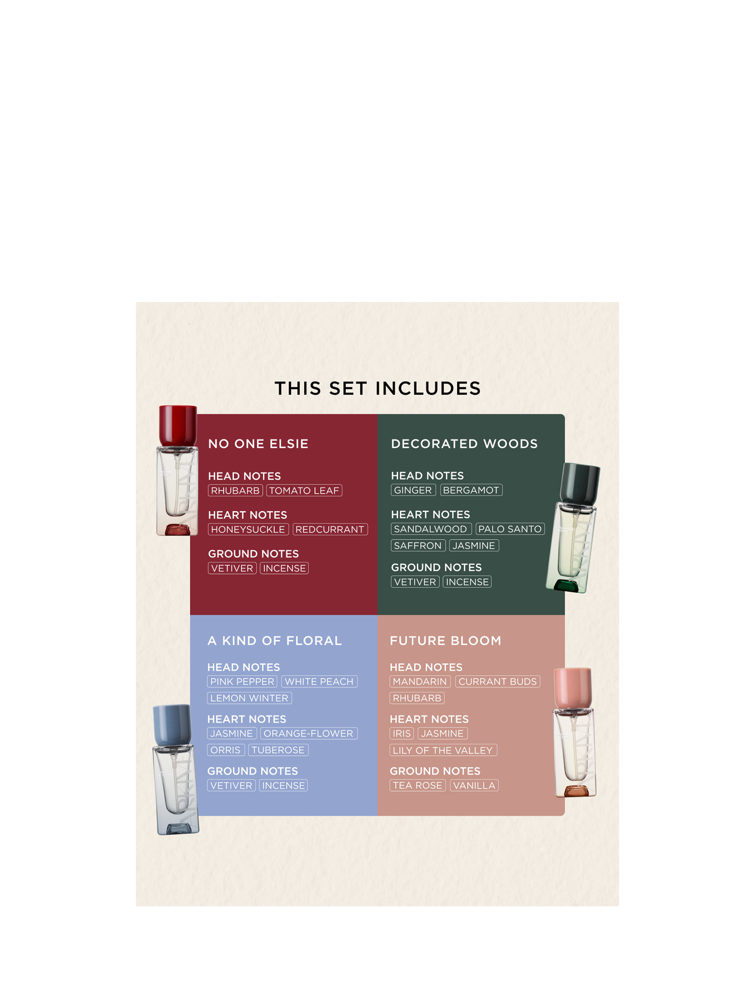 No One Elsie: Introducing No One Elsie, a fresh and elevated fragrance inspired by Adam’s grandmother’s English greenhouse. Opening with the crisp tartness of rhubarb, complemented by the green earthiness of tomato leaf. As the fragrance evolves, delicate notes of redcurrant and honeysuckle weave through, whilst grounding vetiver and hints of palo santo provide depth. Infused with Baobab Oil.