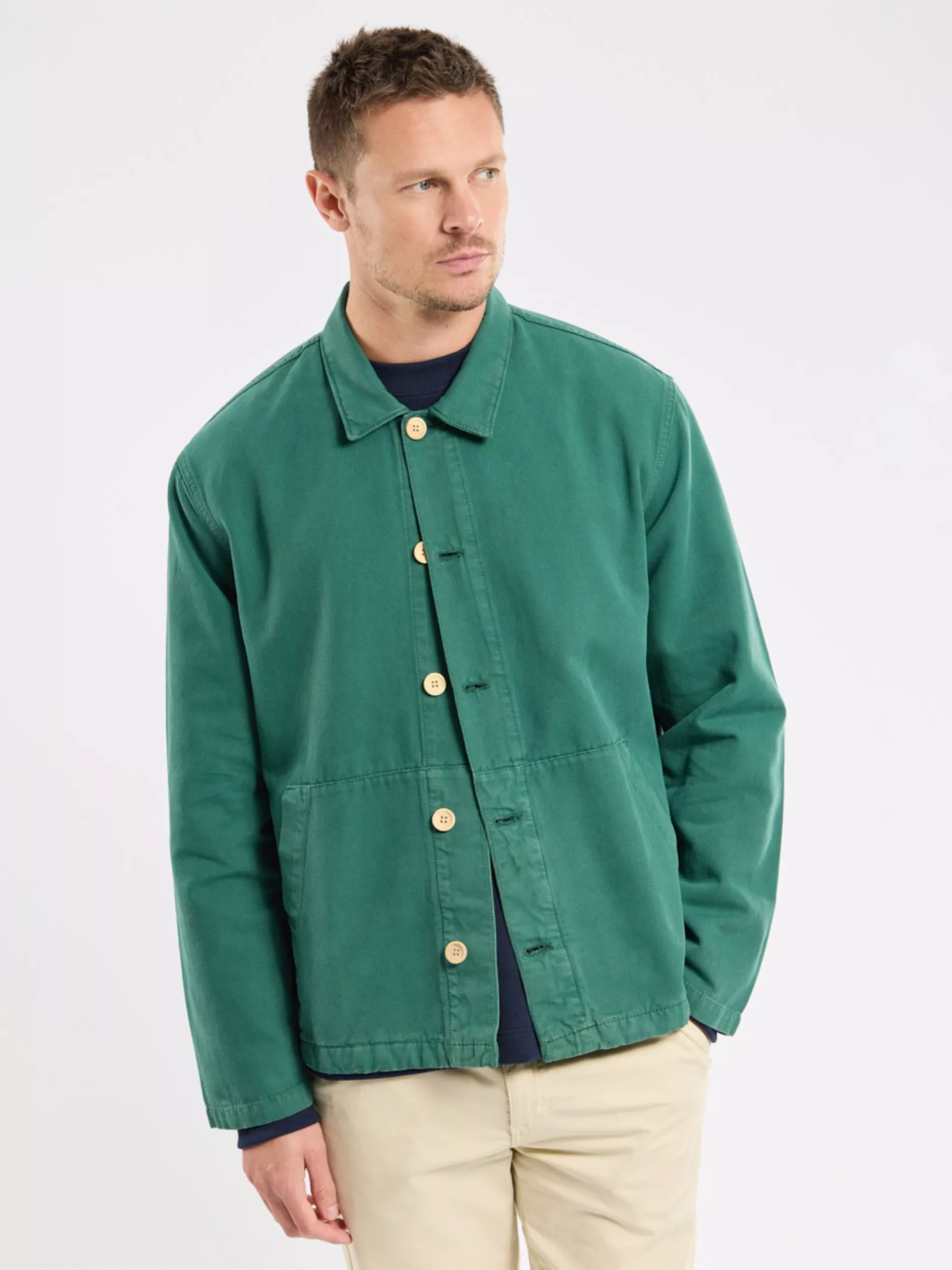 A pure cotton canvas jacket in a classic fisherman style. The perfect transitional piece with 2 front pockets, wooden buttons, full front buttoning, casual long sleeves, anchor badge detail and adjustable cuffs.