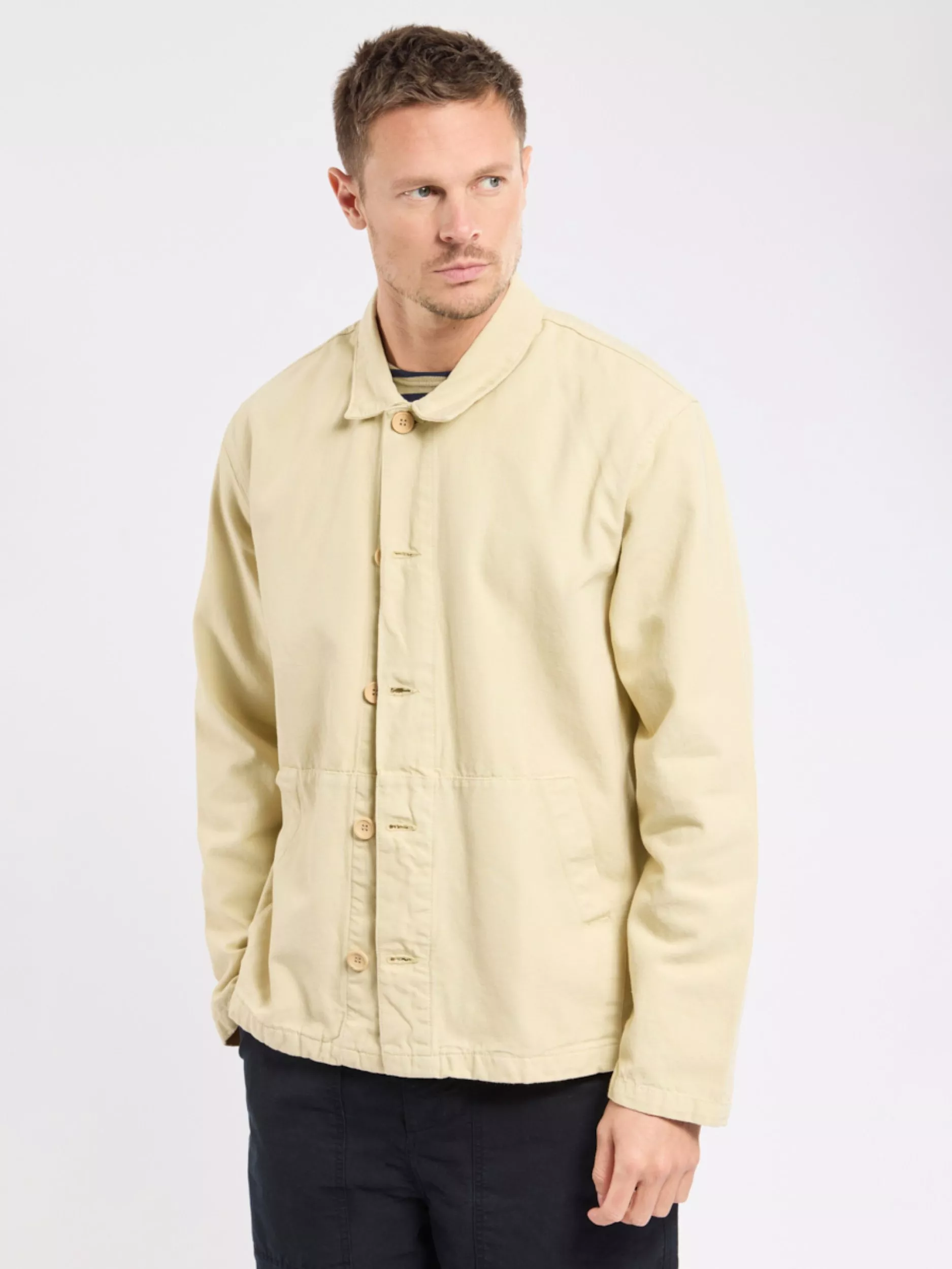 A pure cotton canvas jacket in a classic fisherman style. The perfect transitional piece with 2 front pockets, wooden buttons, full front buttoning, casual long sleeves, anchor badge detail and adjustable cuffs.