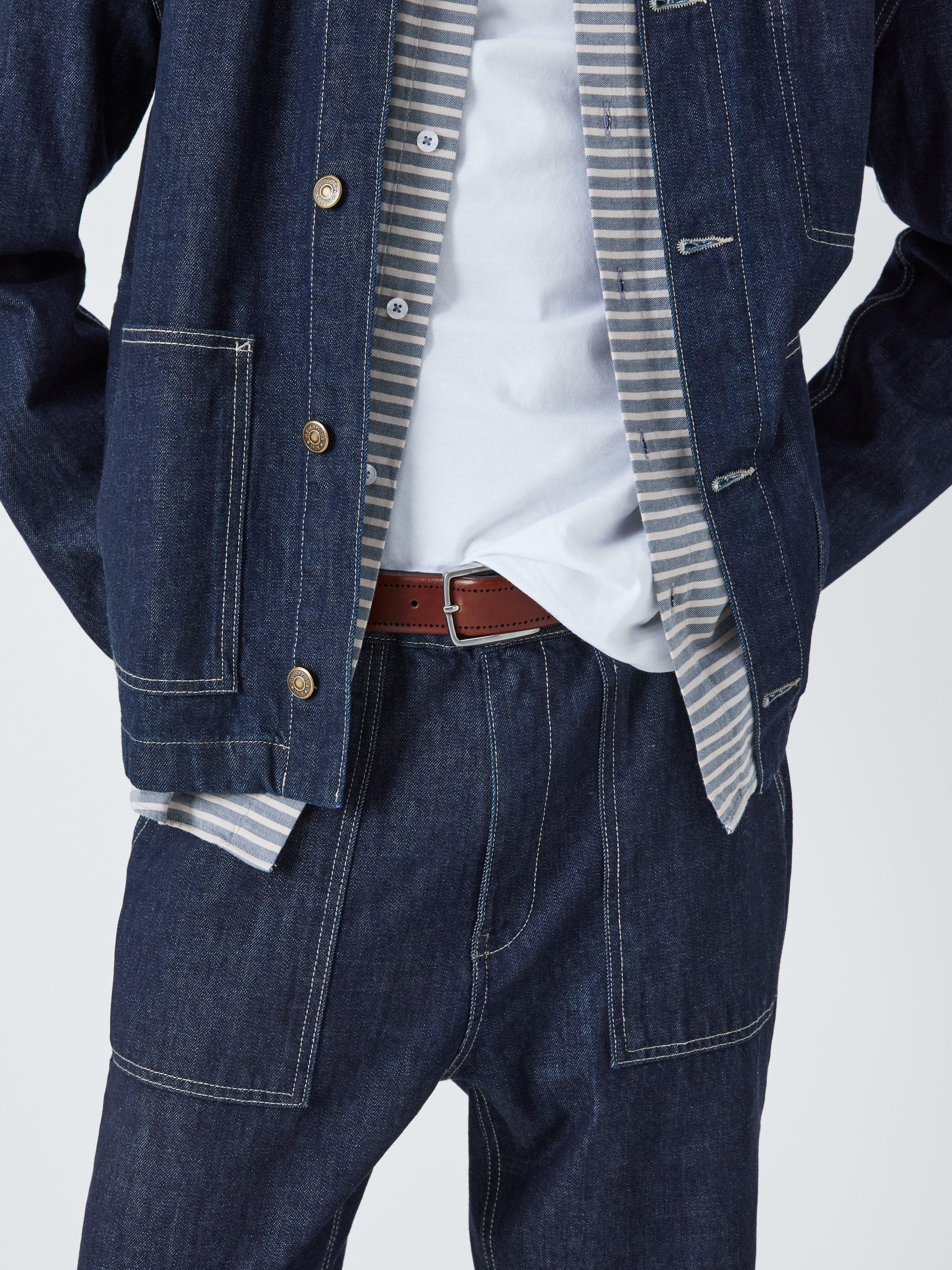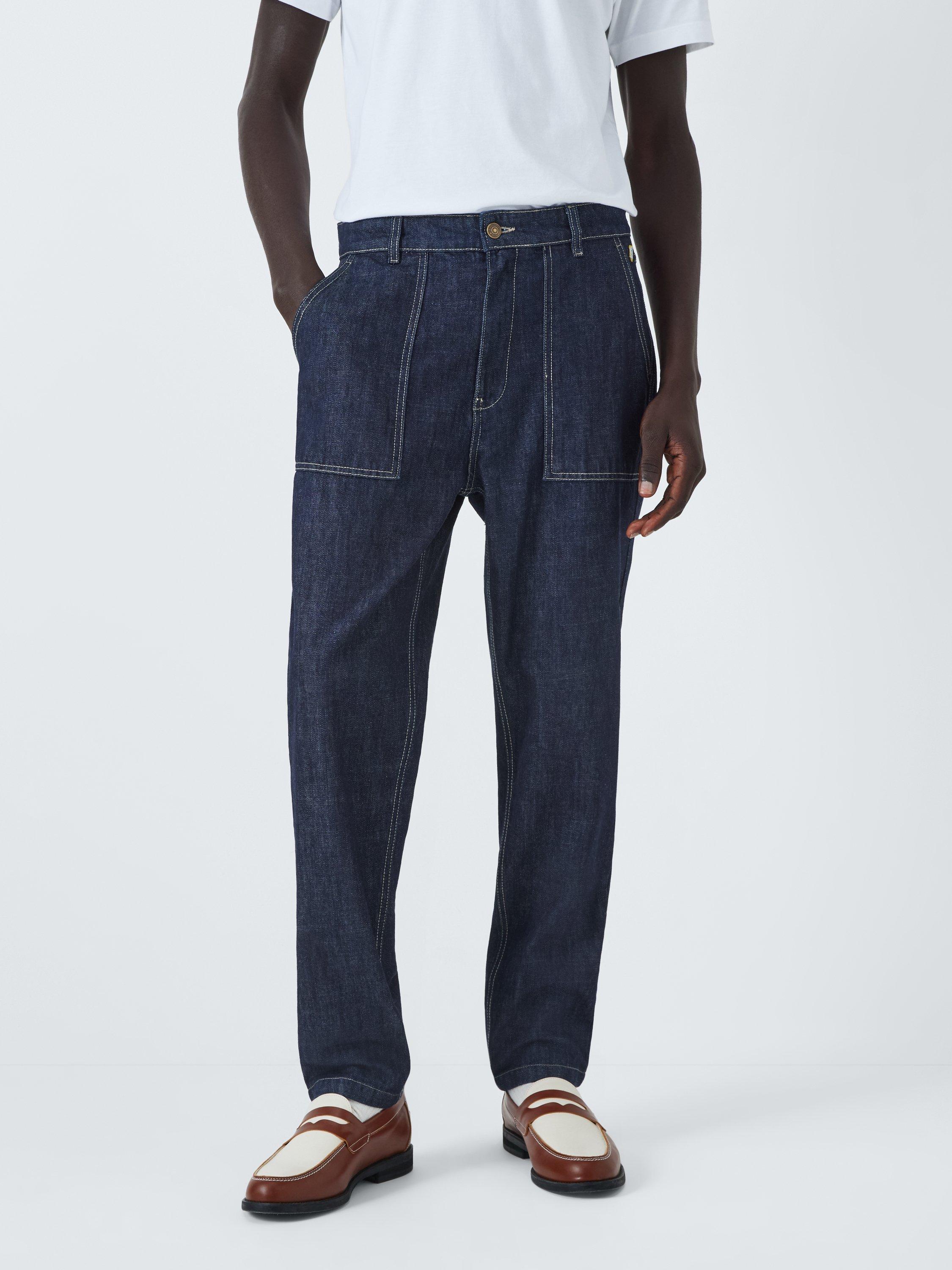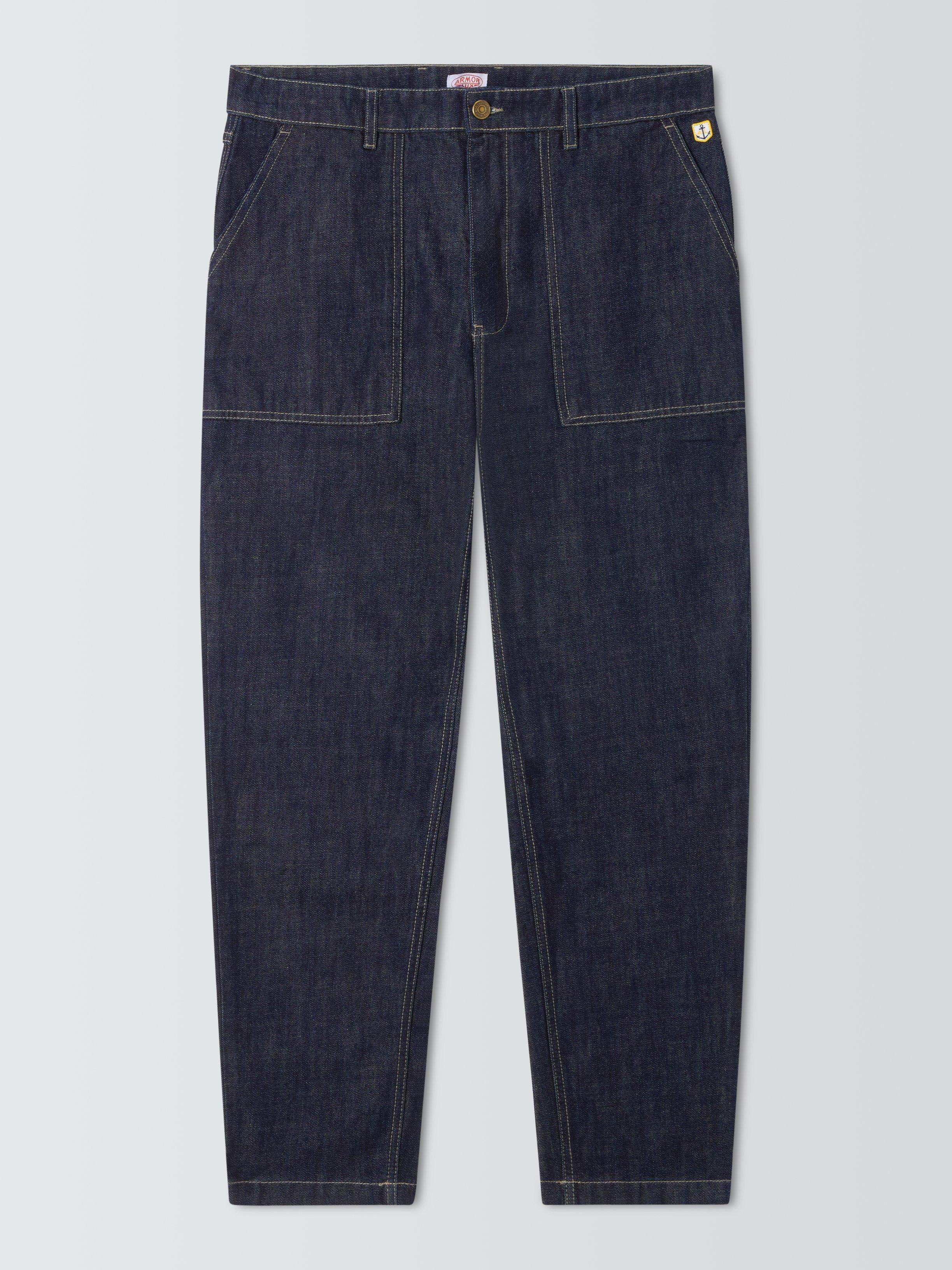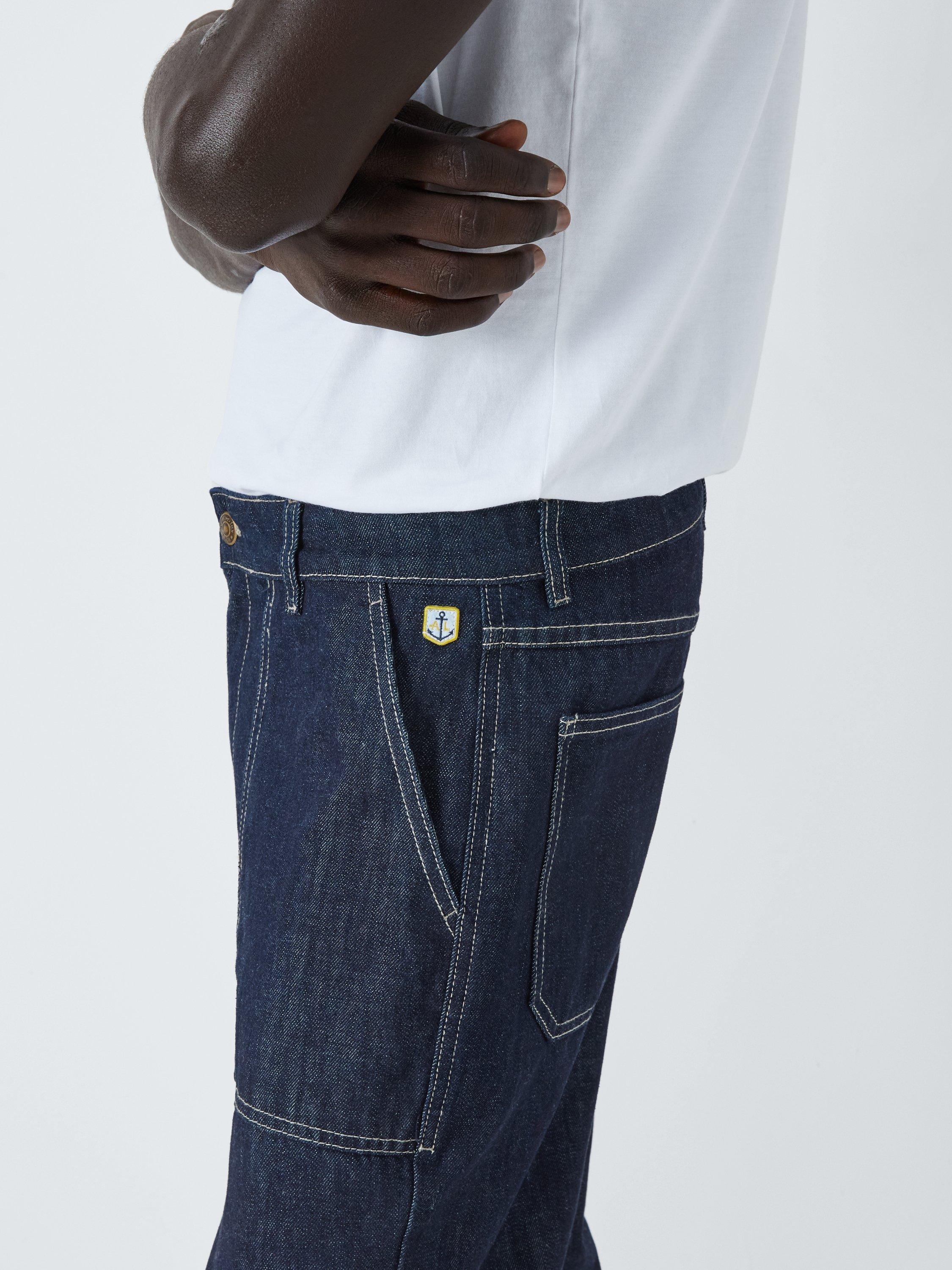 Denim Jeans in the fit of fisherman pants featuring; a zipper and button fly; 2 large front pockets; 2 back pockets and an anchor badge for an authentic edge.
