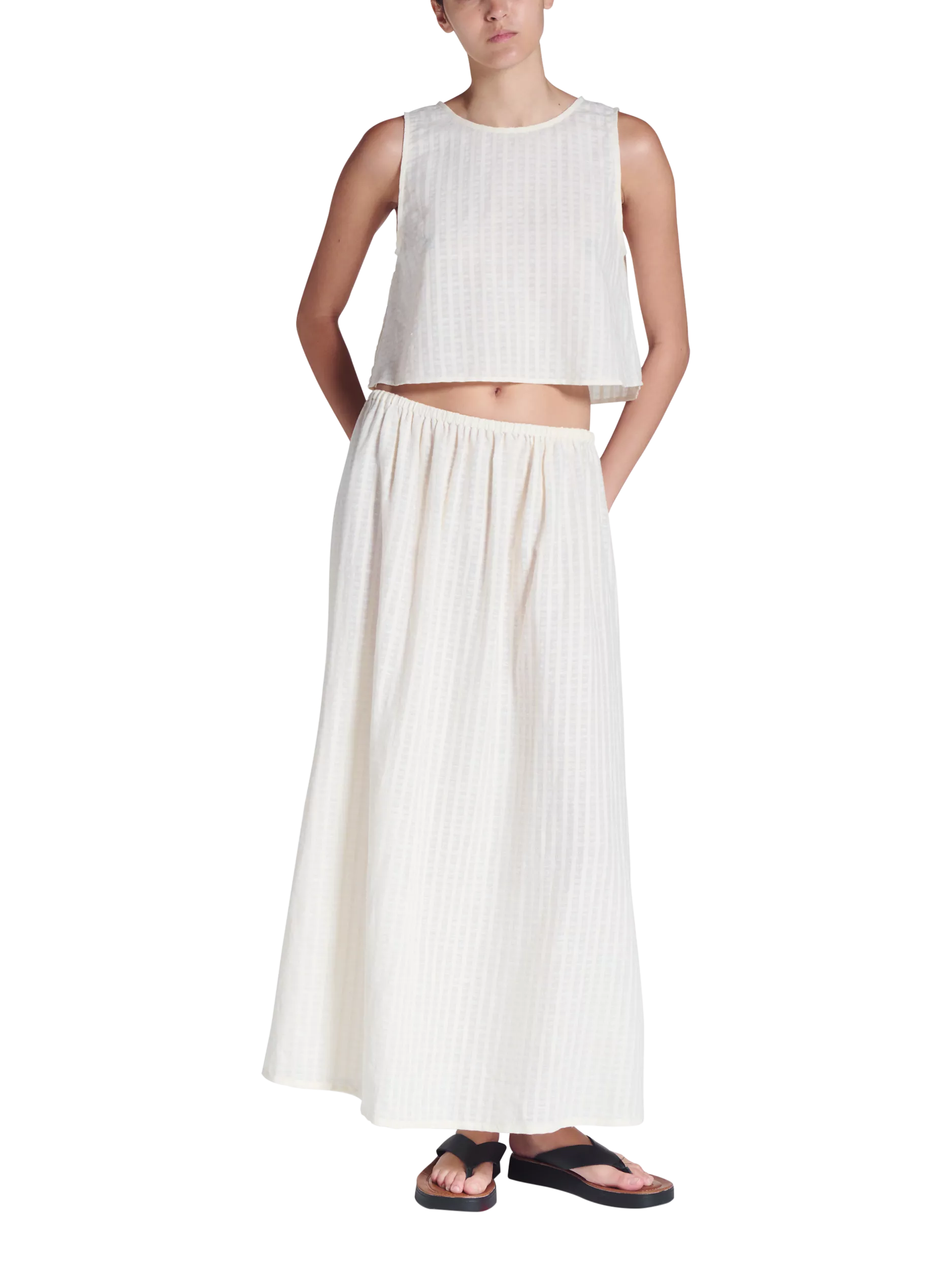The Kobe vest features a rounded neck and cropped hem. Made from a soft, lightweight cotton and linen blend for summer months, with an elevated sheer stripe for texture.