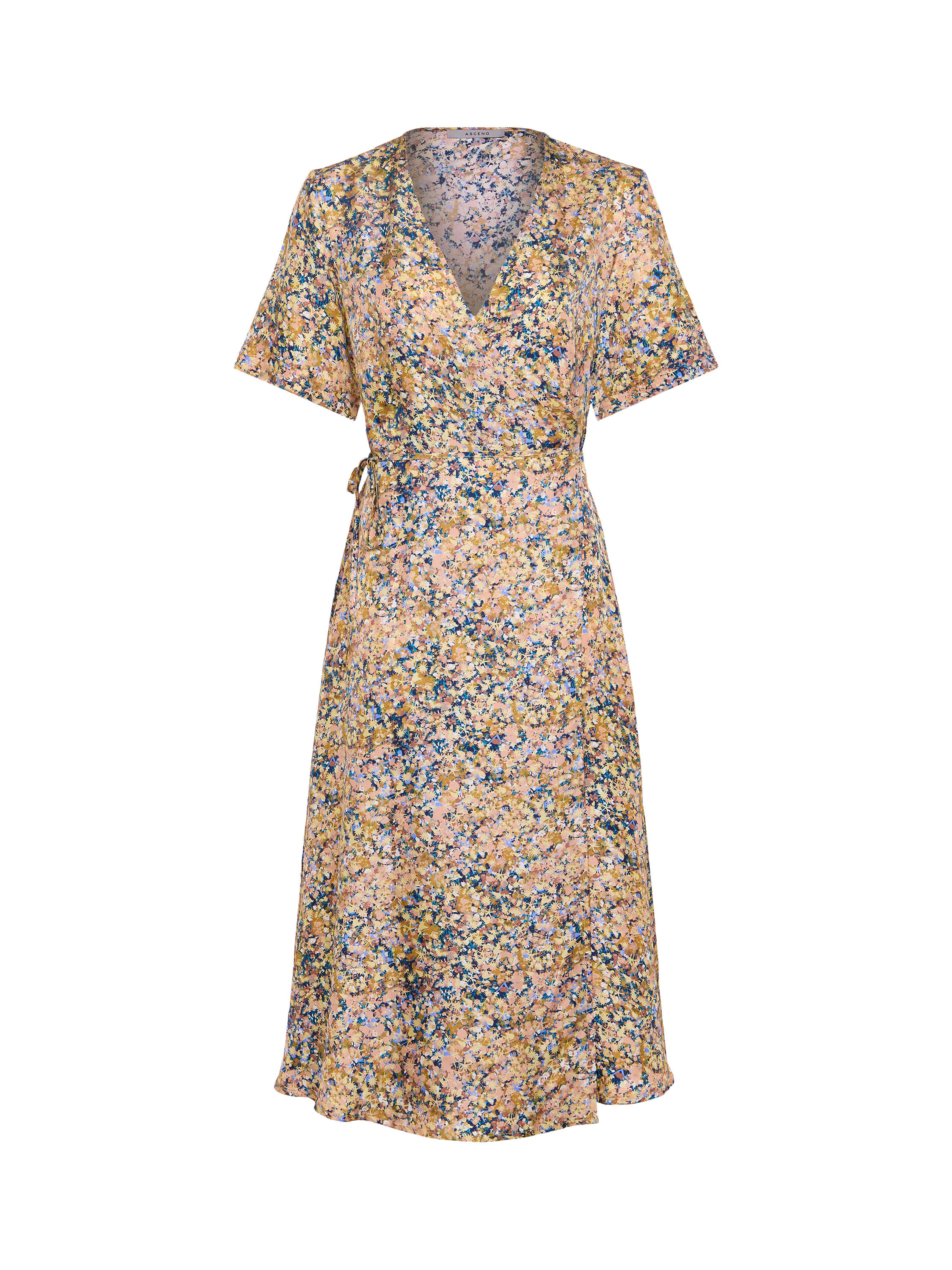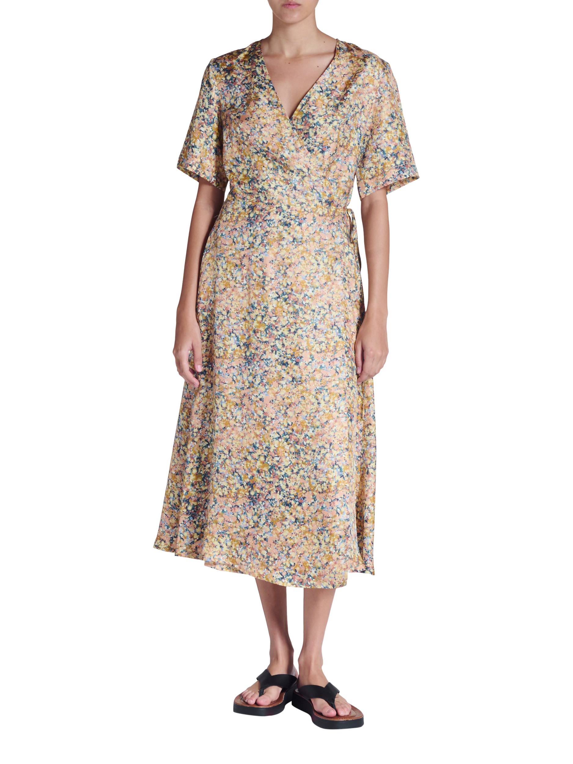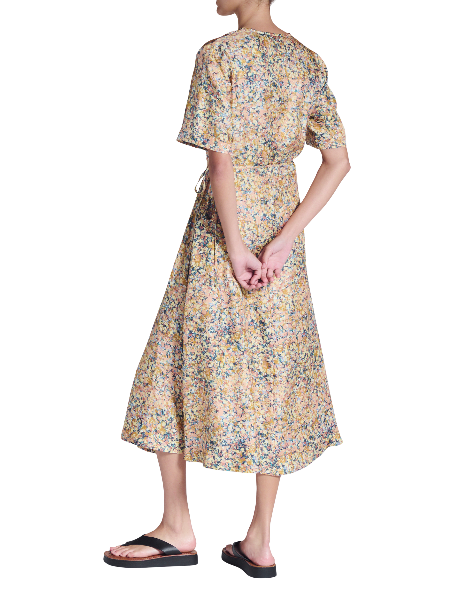 An elegant wrap silhouette, featuring a mid-calf length. Crafted from a lightweight silk twill, printed with ASCENO's Beachscape design. The relaxed fit and silk twill fabric make this a versatile dress for city days to summer evenings.