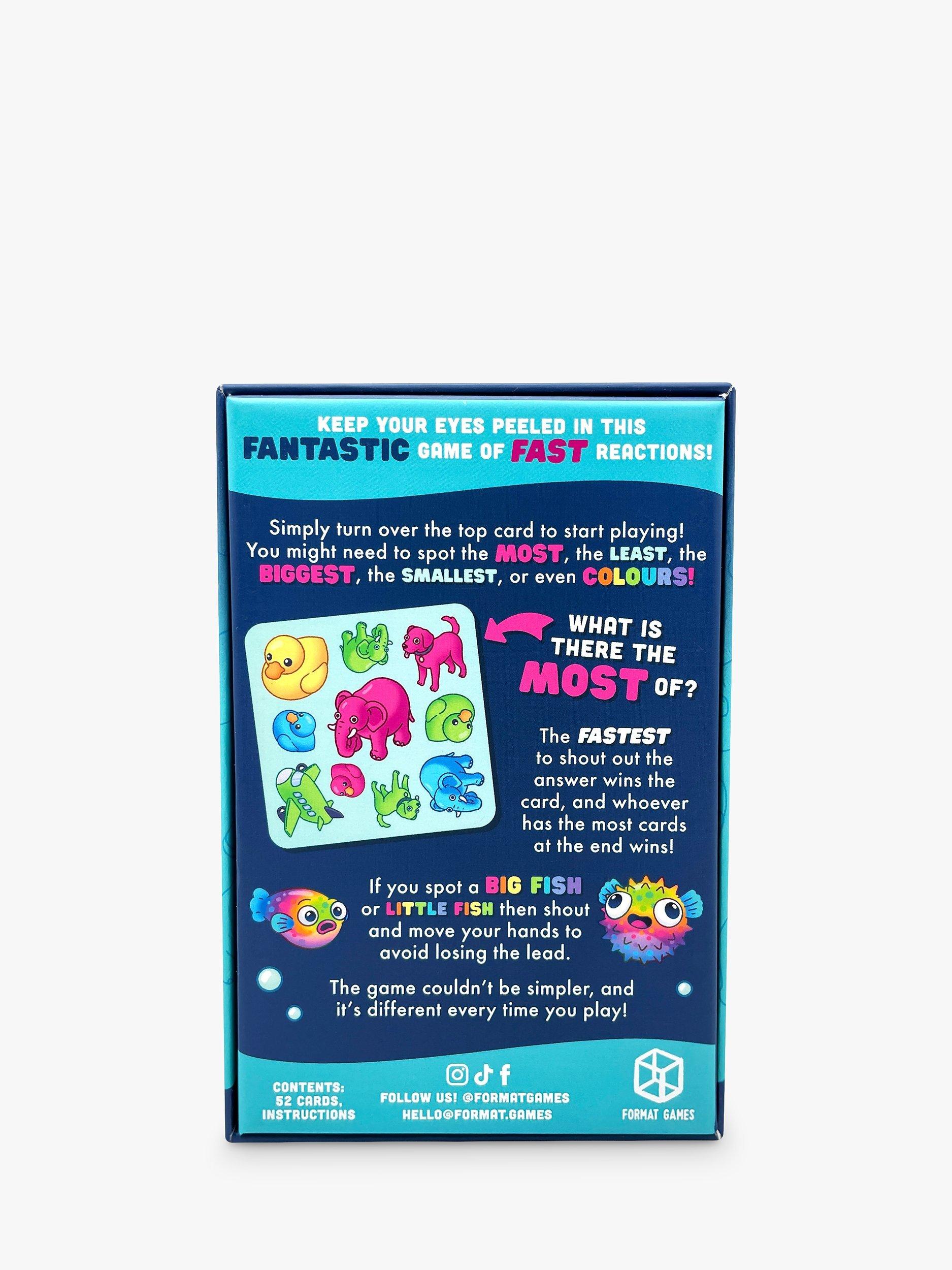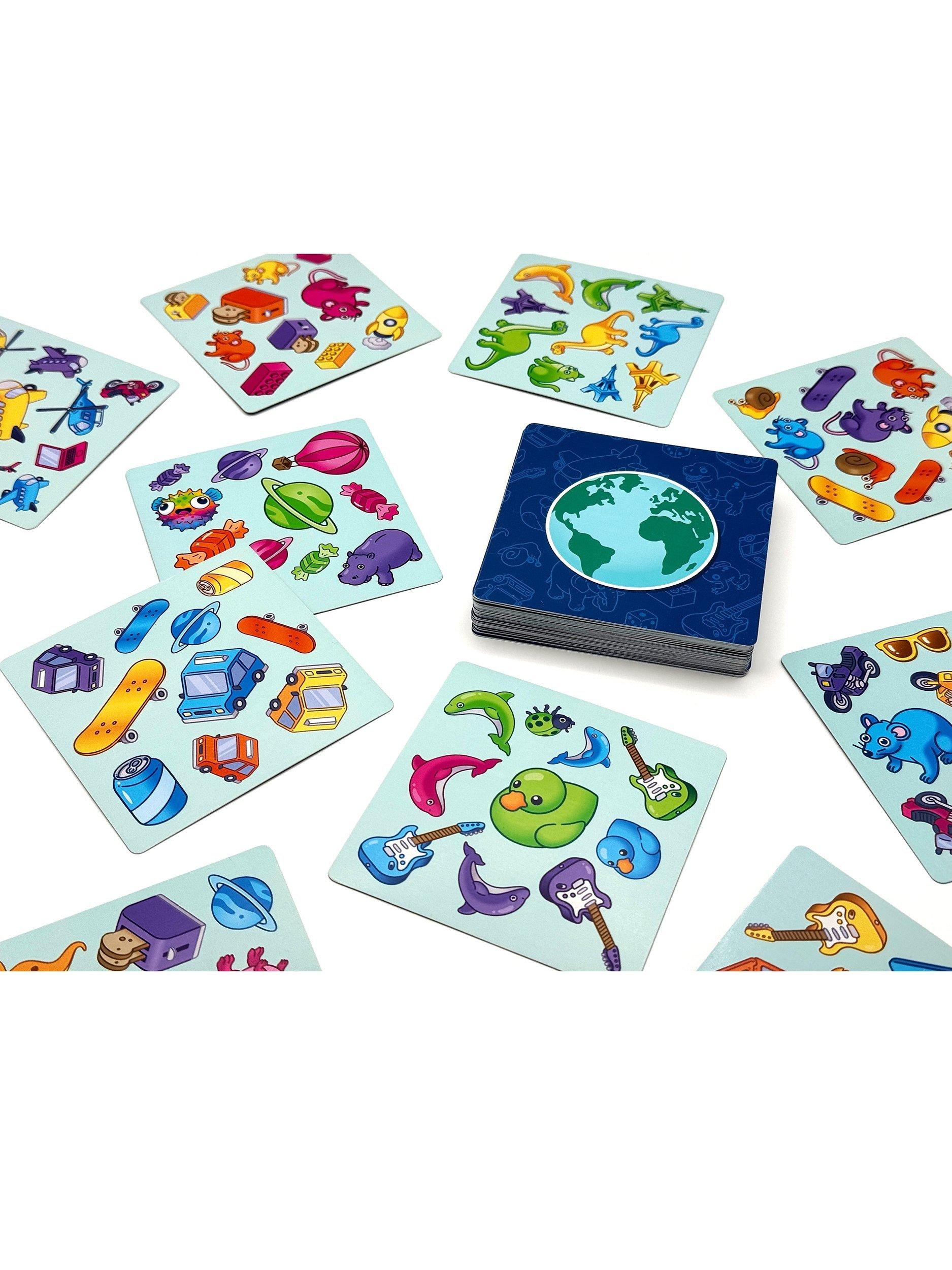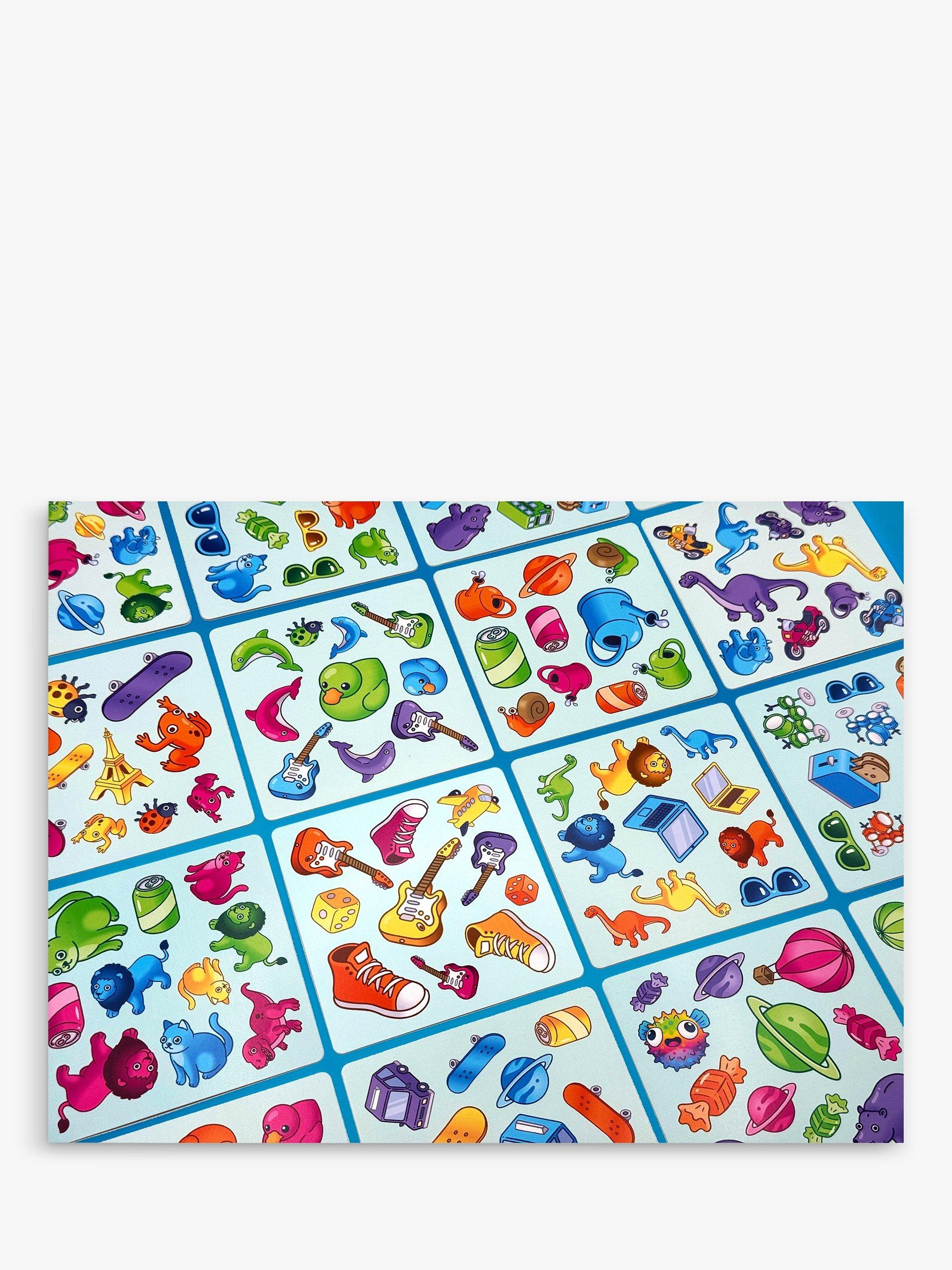 Keep your eyes peeled in this fantastic game of fast reactions. Simply turn over the top card and look at the back of the next card to see what you re looking for. The fastest to shout out the correct answer wins! With 32 objects each in 4 colours and thousands of card combos, this game will always keep you guessing!