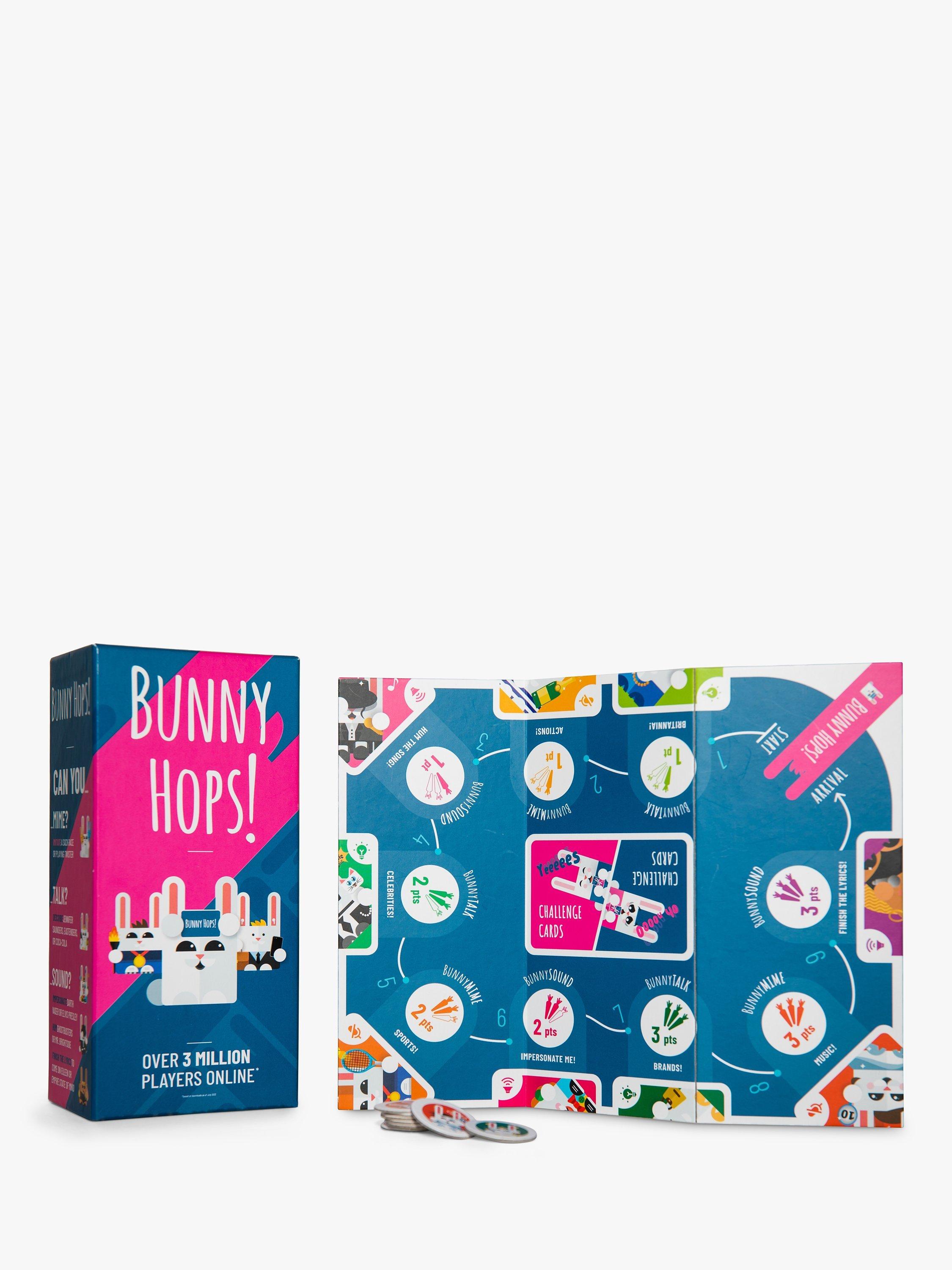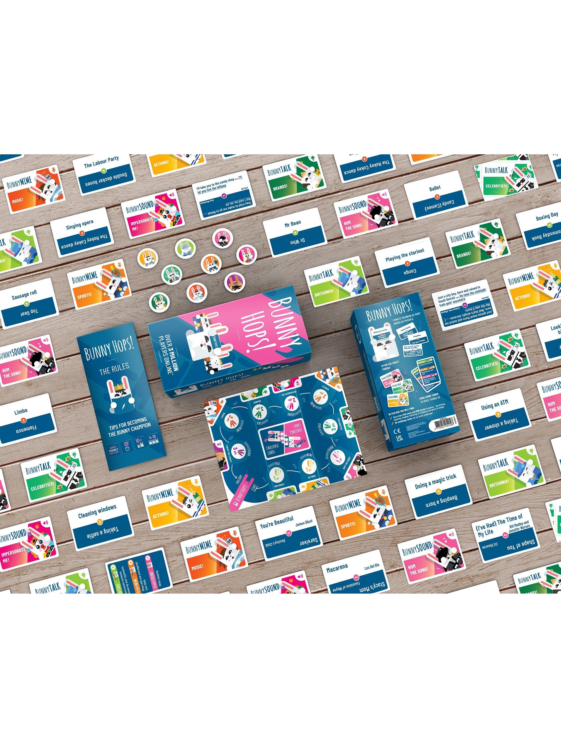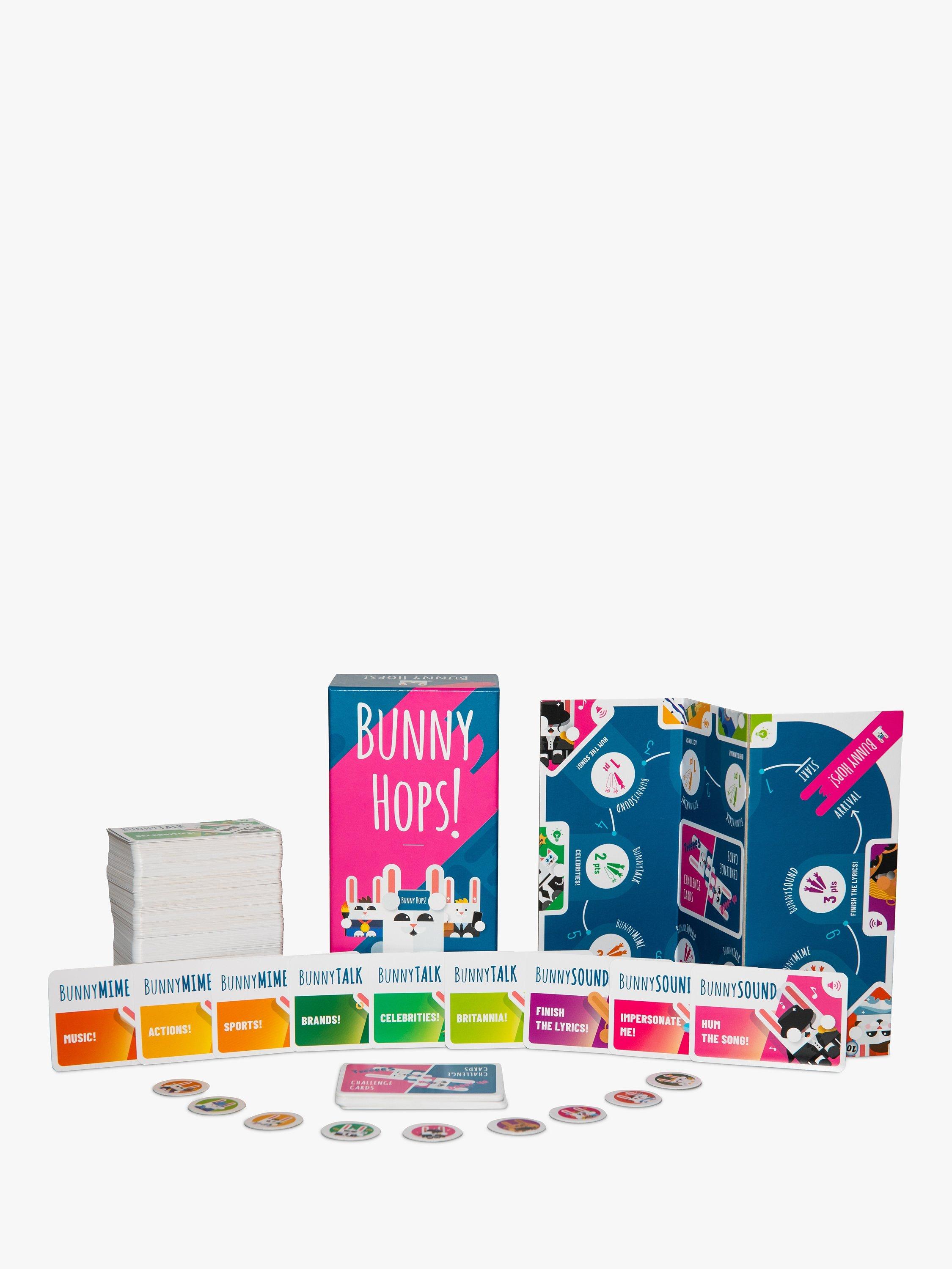 Need to liven up the party? It's time to get some Bunny Hops into your life! The perfect game to shake things up before a night out or for a games night with family or friends. Simply get into teams, place a card on your forehead and try to guess the word, celebrity or song which is on there. Your team mates will help to describe, mime or sing to help give you clues. The team who collects the most points after each round on the board wins.