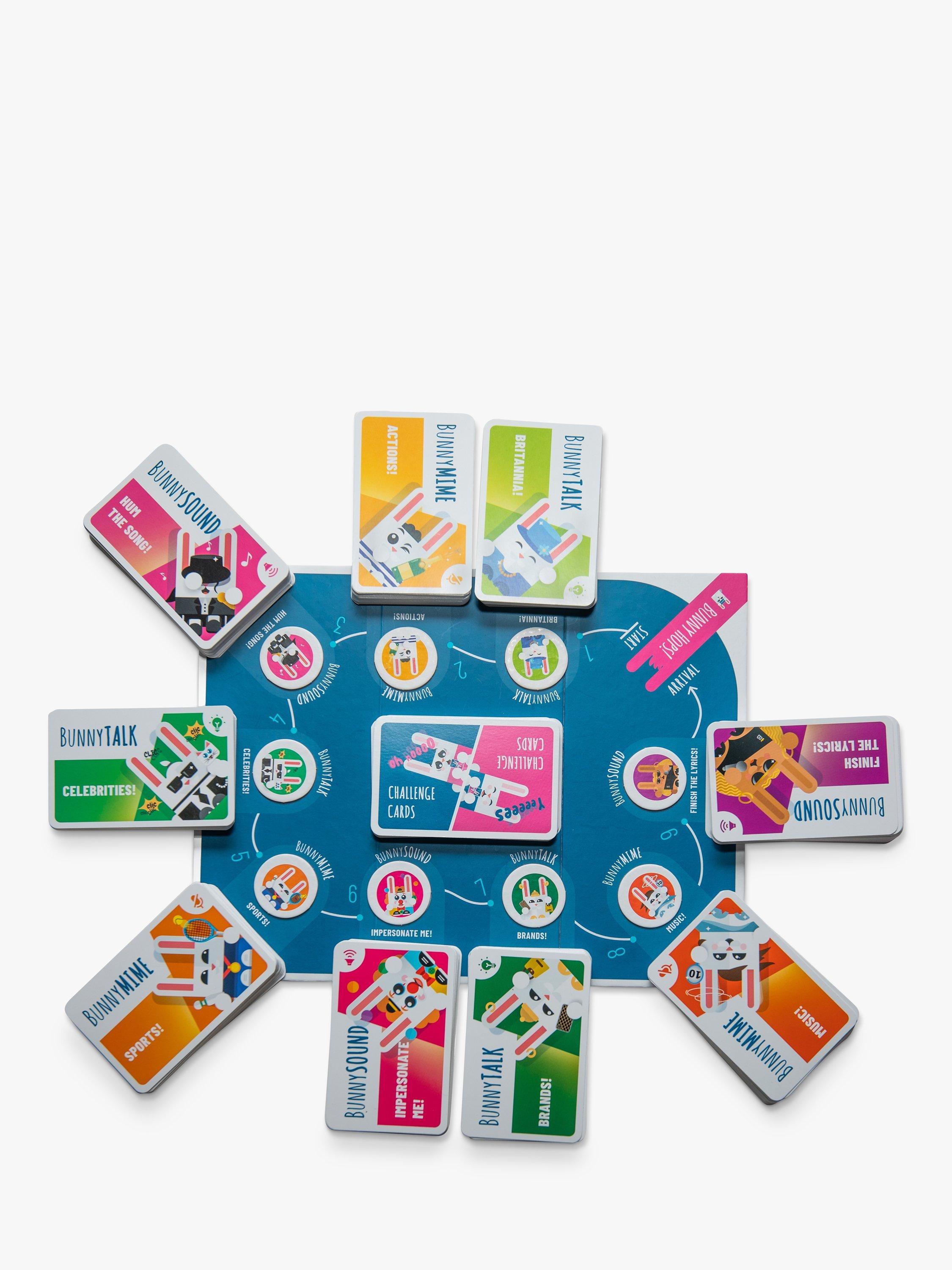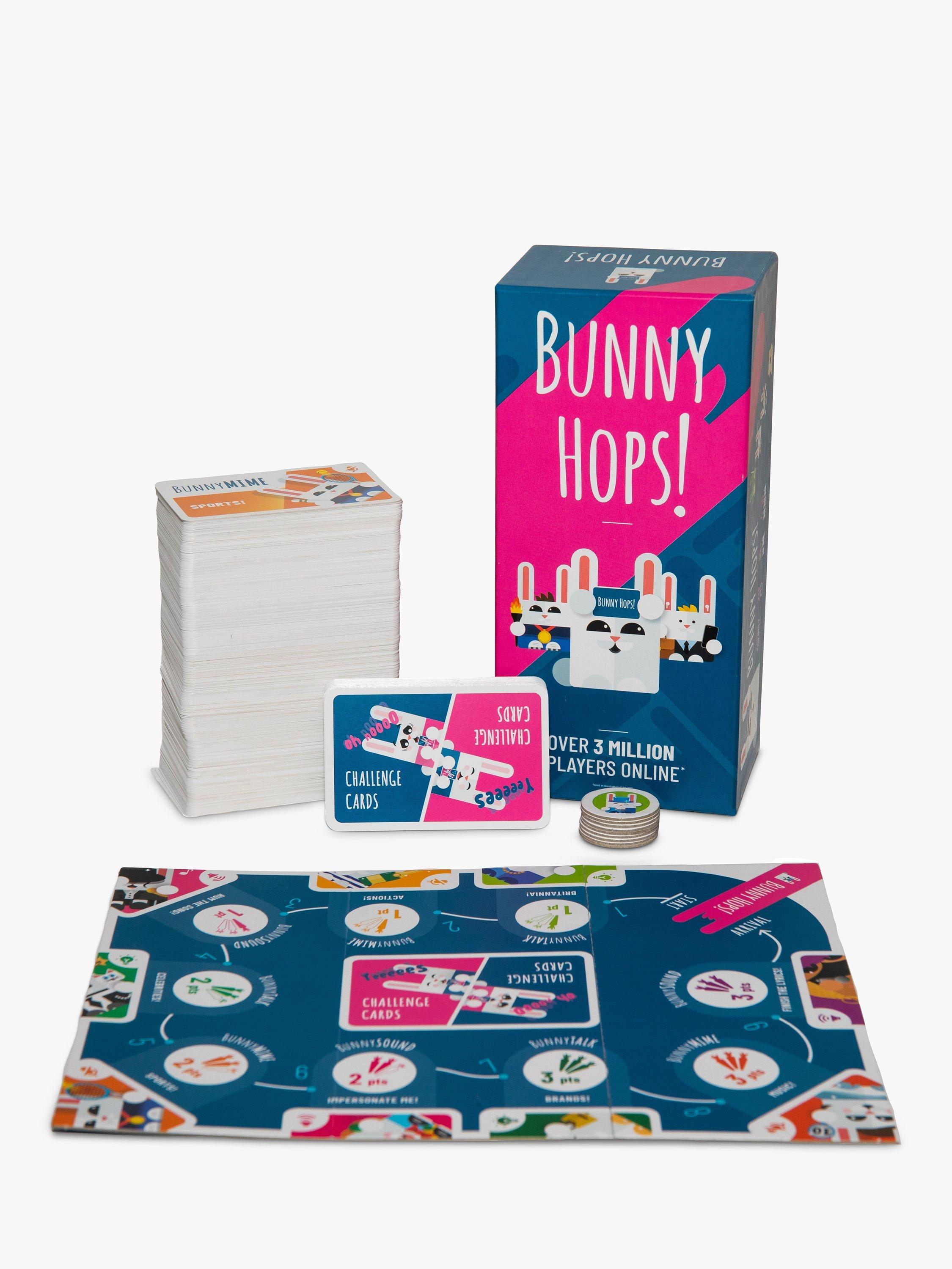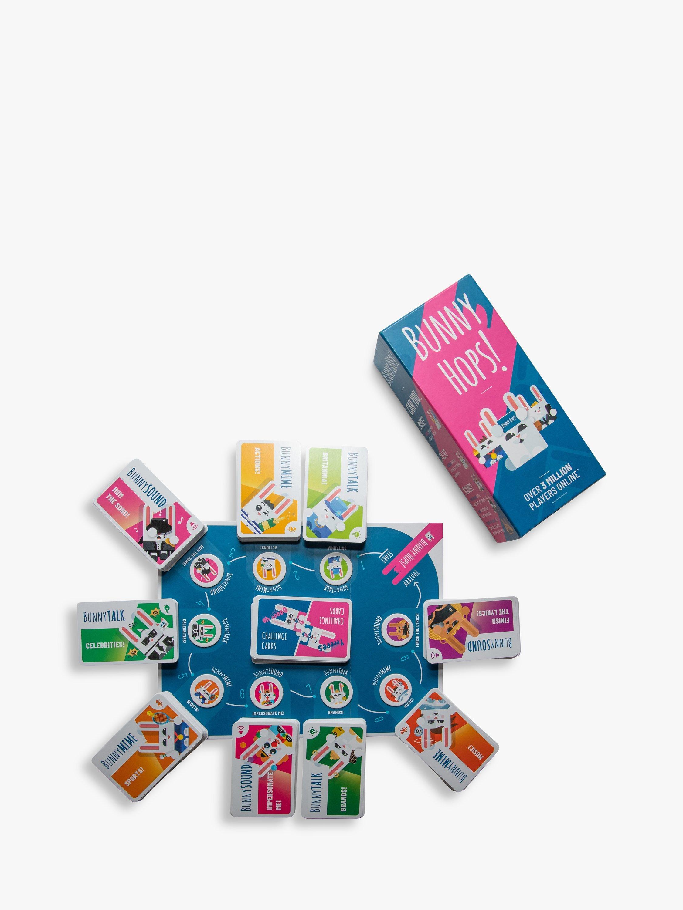 Need to liven up the party? It's time to get some Bunny Hops into your life! The perfect game to shake things up before a night out or for a games night with family or friends. Simply get into teams, place a card on your forehead and try to guess the word, celebrity or song which is on there. Your team mates will help to describe, mime or sing to help give you clues. The team who collects the most points after each round on the board wins.