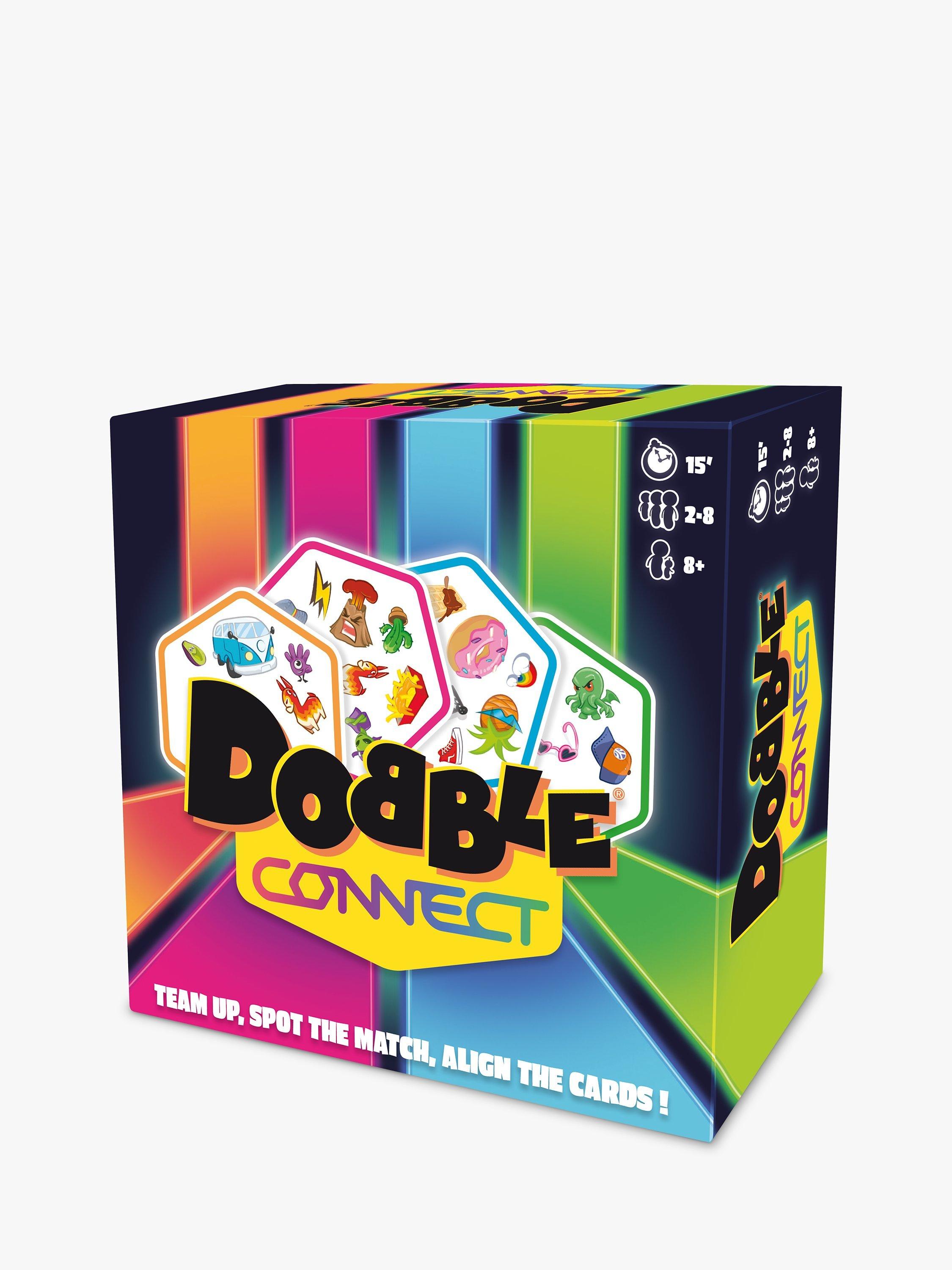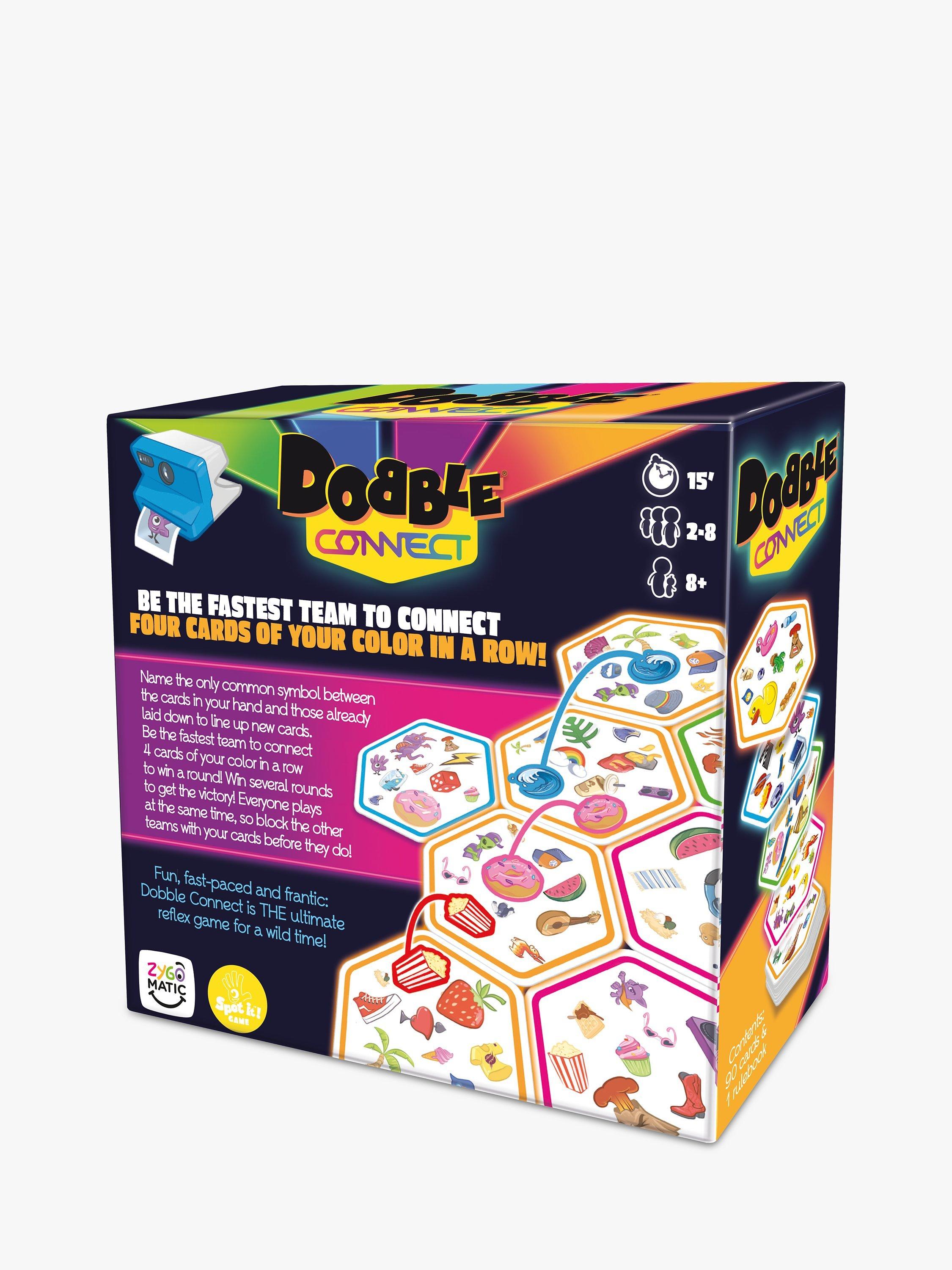 Fun, fast-paced and frantic: Dobble Connect is the ultimate reflex game! Be the fastest team to connect 4 cards in your colour, in a row. To line up new cards, name the only common symbol between the card in your hand and those already laid down. Everyone plays at the same time, so watch out for the other teams and block them with your cards before they do.
