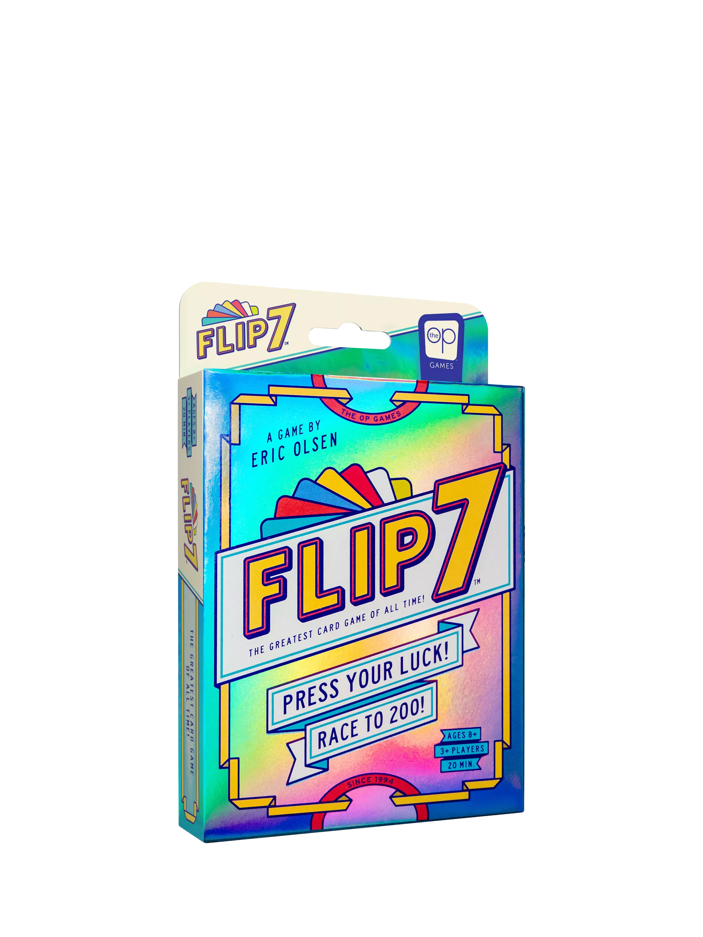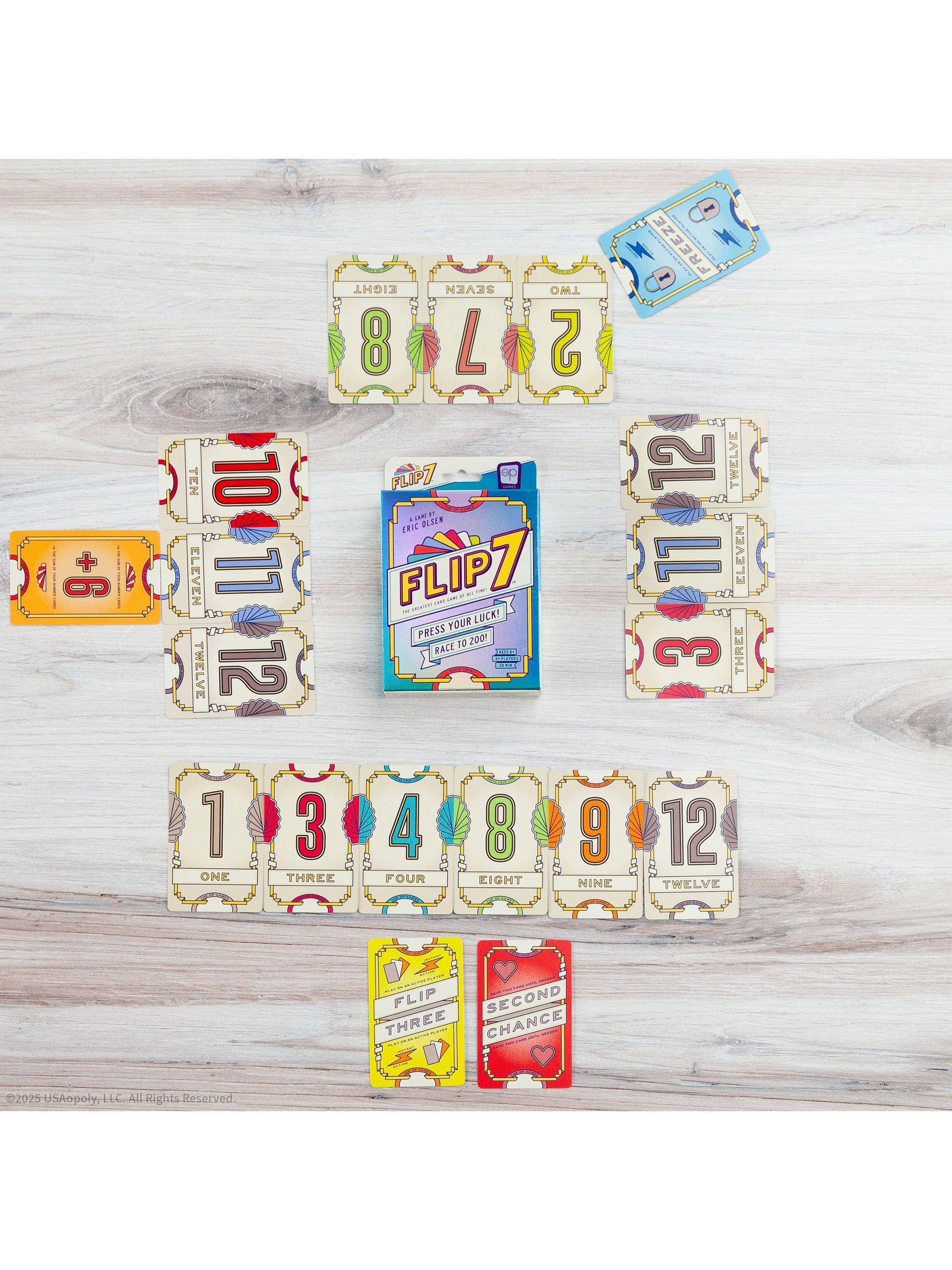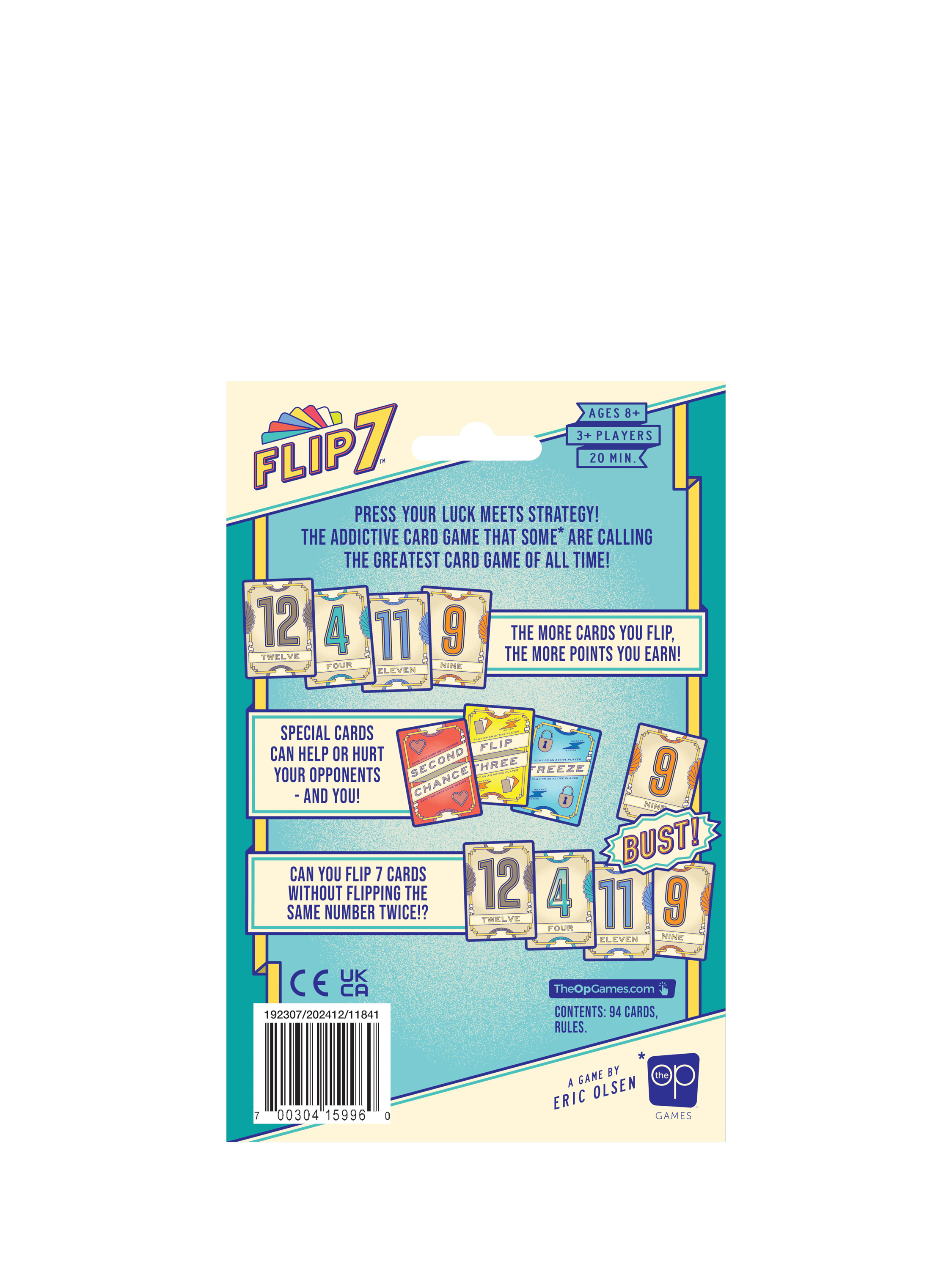 Flip over cards one by one without flipping the same number twice. Sound easy? Think again! This isn’t just any deck of cards. In Flip 7™ there’s only one 1 card, two 2’s, three 3’s, etc. plus a bunch of special cards that can score you extra points, give you a second chance, or freeze you or your opponents in your tracks. Are you the type of player to play it safe and bank points before you bust, or are you going to risk it all and go for the bonus points by flipping over seven in a row? Press your luck meets strategy in this addictive card game that’s sure to be the greatest card game you’ve ever played!