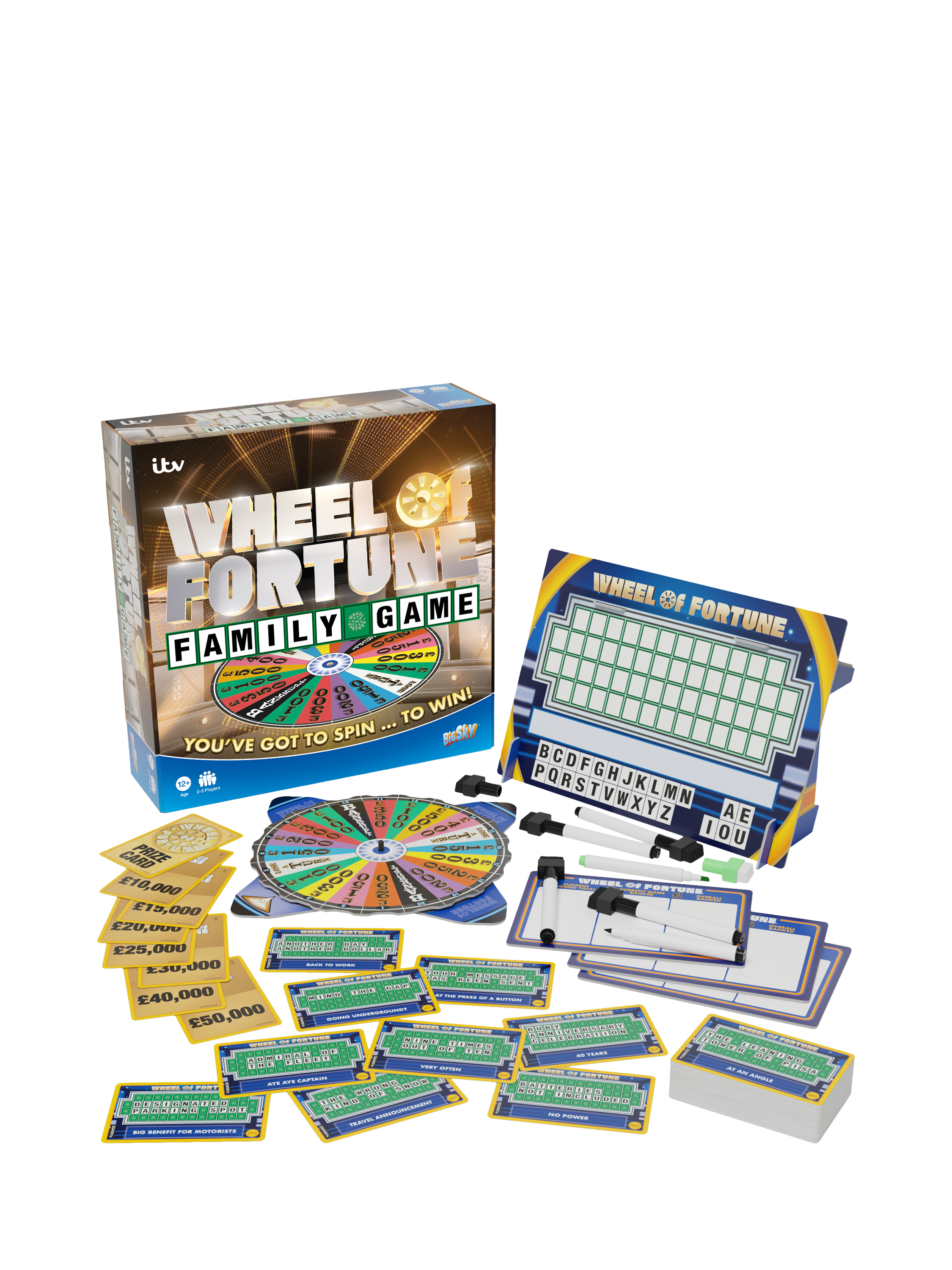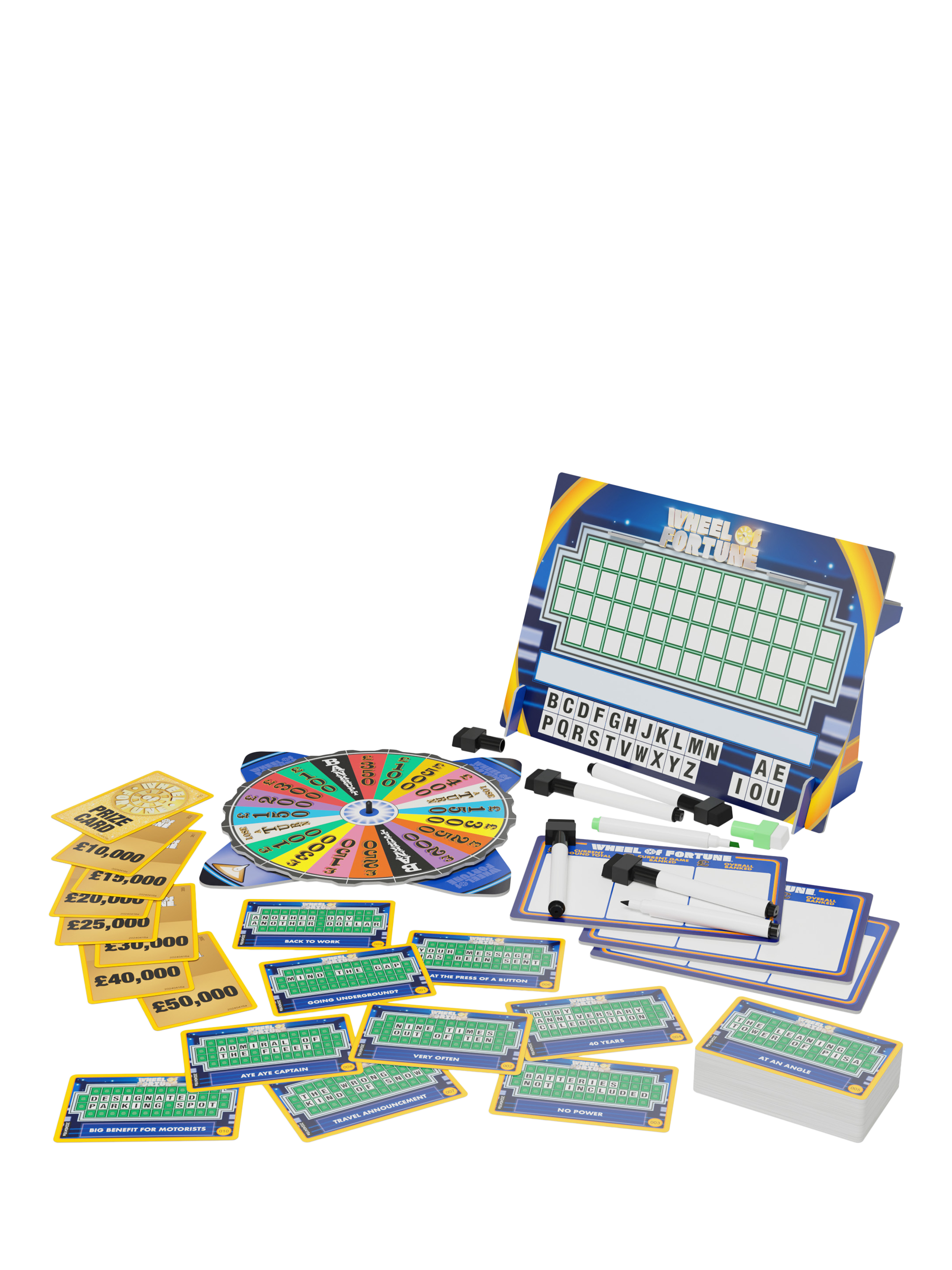 - Wheel with SpinnerSelf-standing dry wipe Puzzle Board (for Host)5 x dry wipe player Scoreboards5 x dry wipe black pens1 x dry wipe green pen200 cards (176 x Puzzle Cards, 24 x Prize Cards)