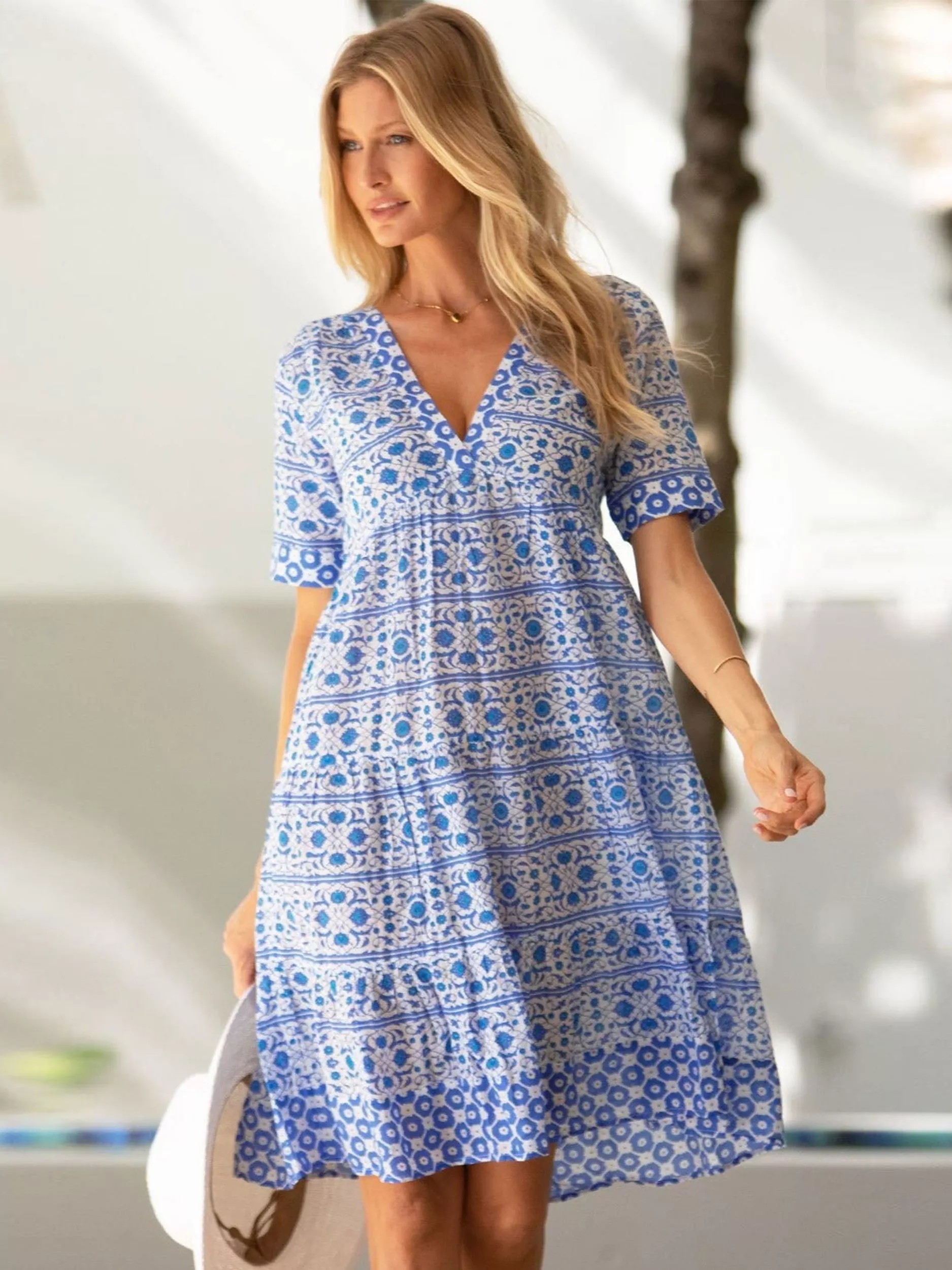Framed with a flattering v-neckline and short sleeves, it offers premium quality with its organic cotton fabric and evokes a carefree mood for balmy summer days.