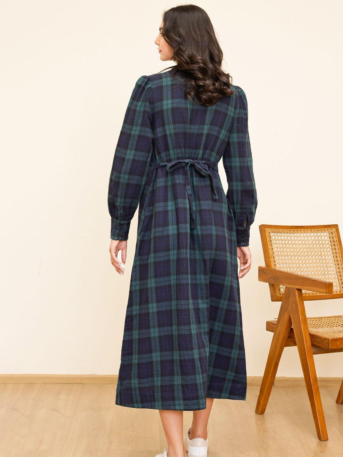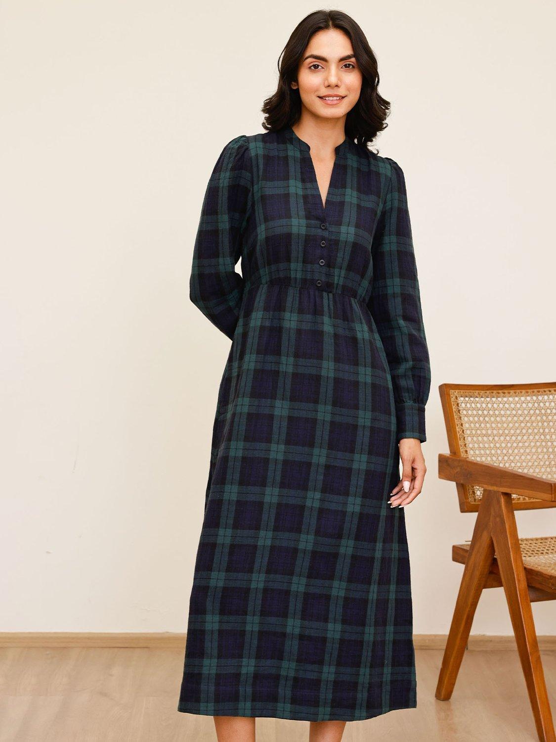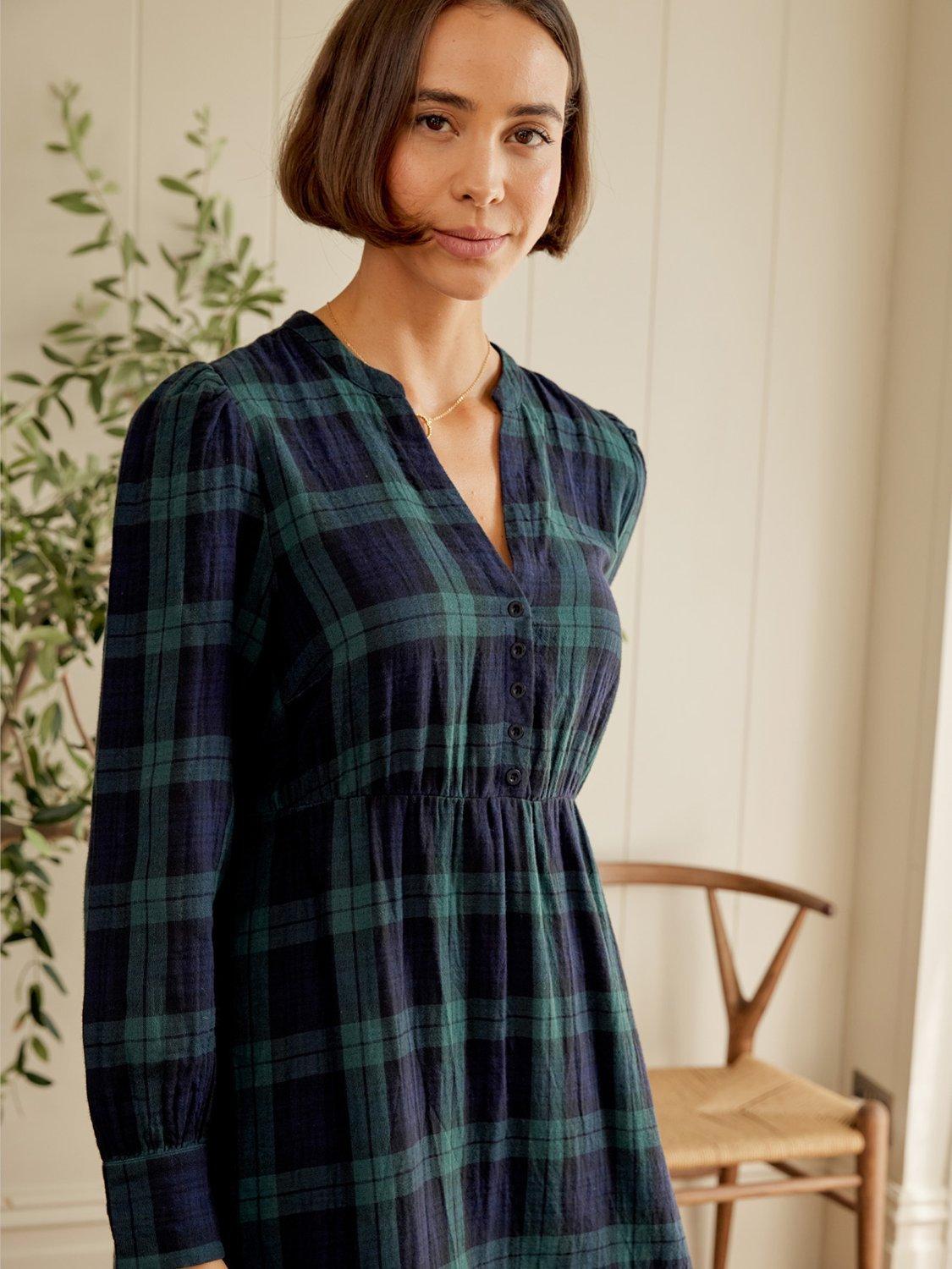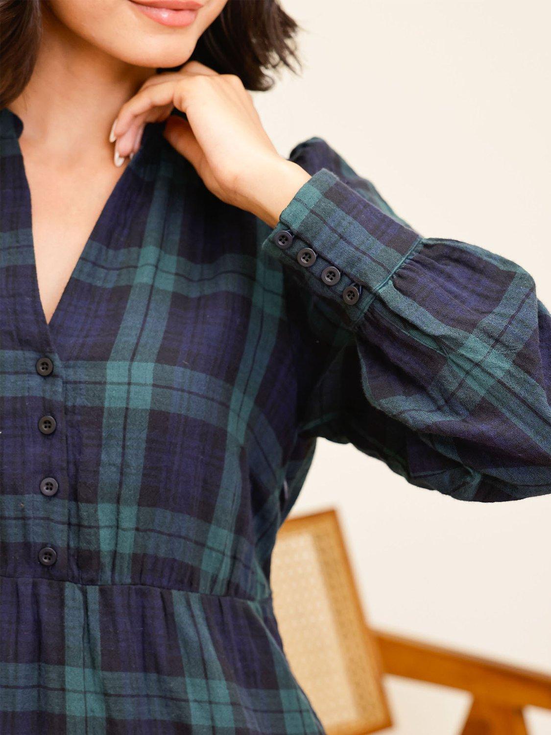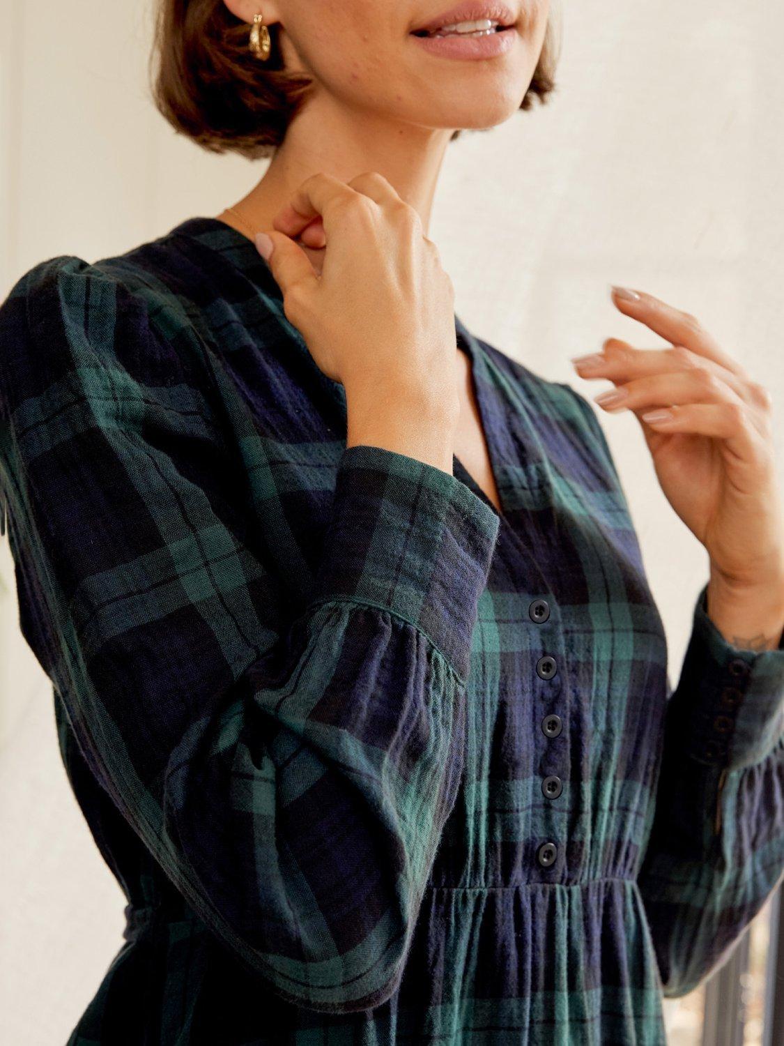 This midi A-line dress in check pattern offers day-long comfort in soft organic cotton. The V-neck and long sleeves give you a relaxed, smart look that fits in anywhere, making it easy to wear however you like.