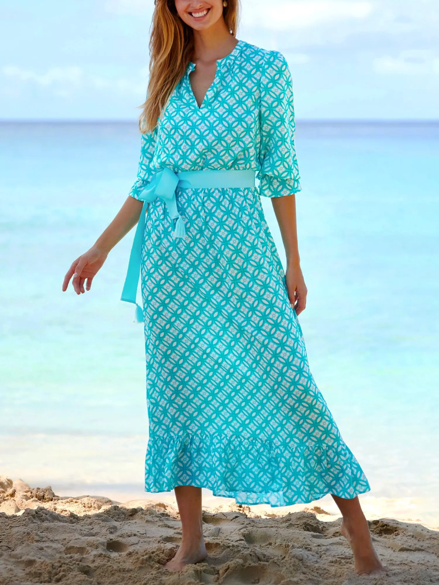 Framed with a flattering v-neckline and three-quarter length sleeves, this piece has you covered when the temperature starts to heat up.