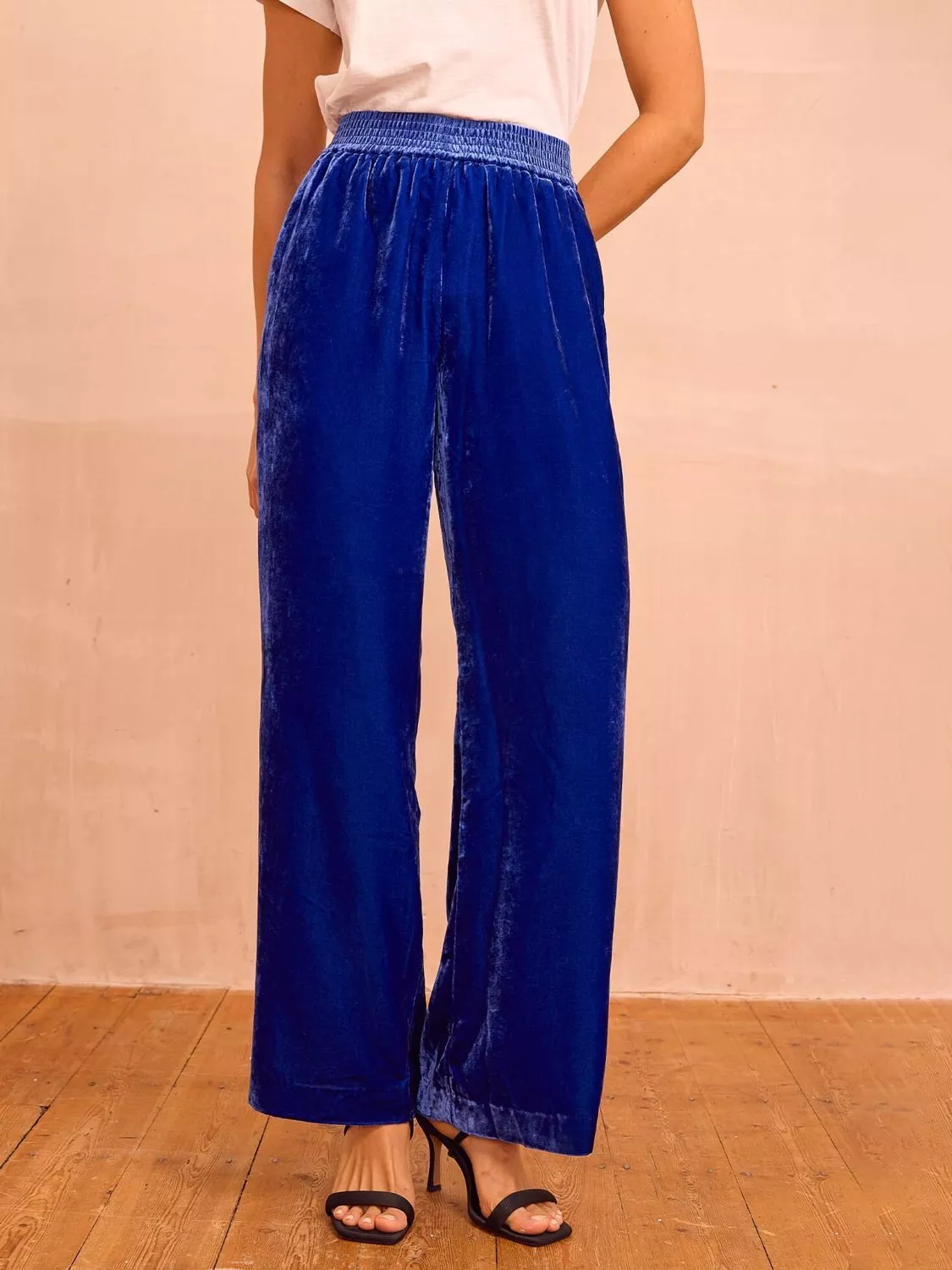 A pair of balanced straight leg trousers from Aspiga, elevated in soft velvet. They are designed to sit mid rise with a stretchy elasticated waist, tonal side stripes and regular length hems.