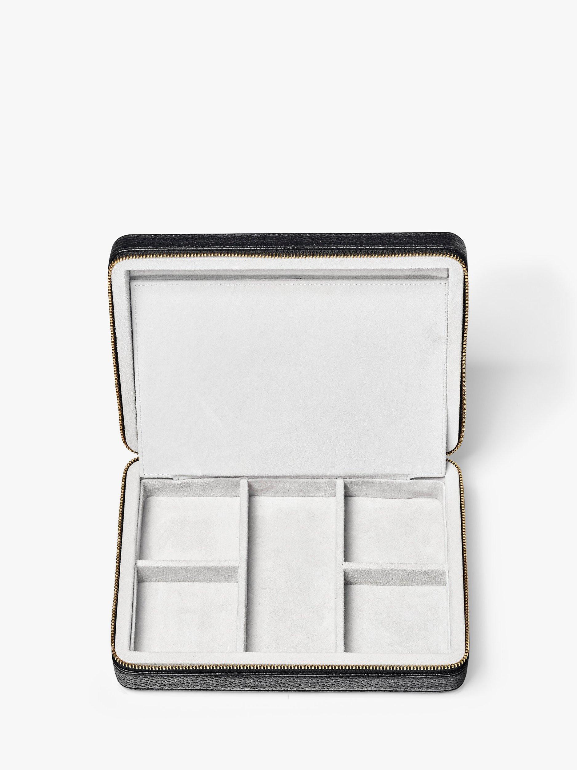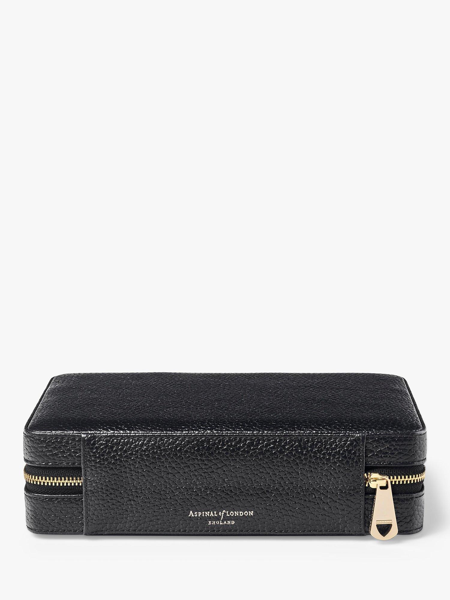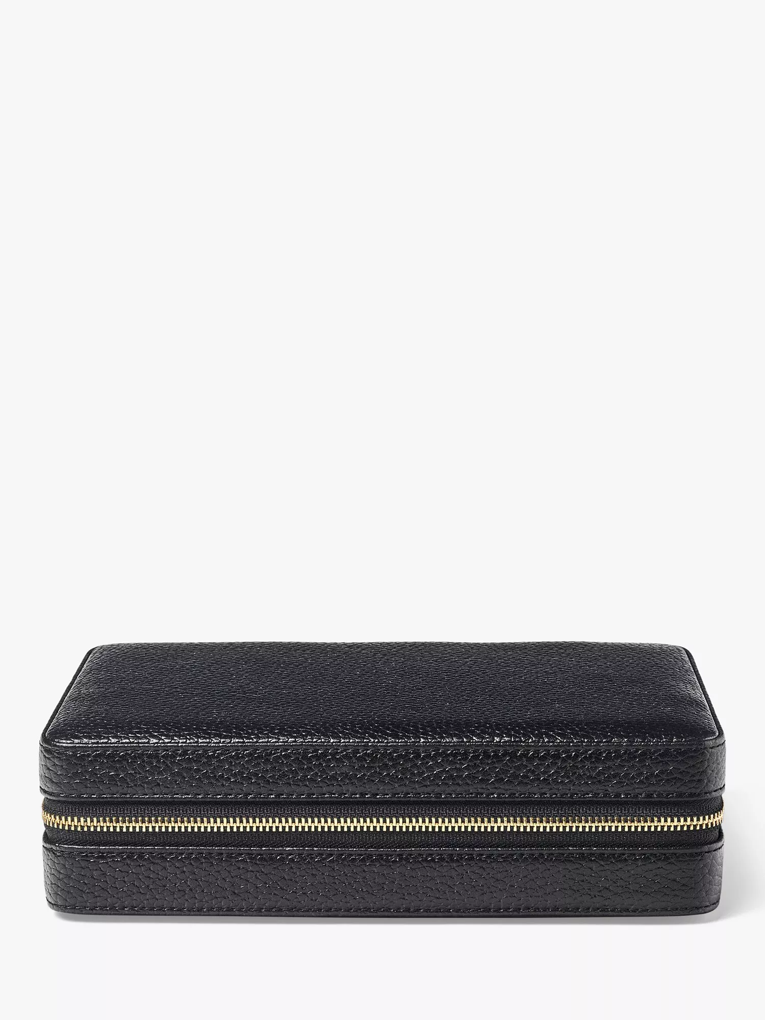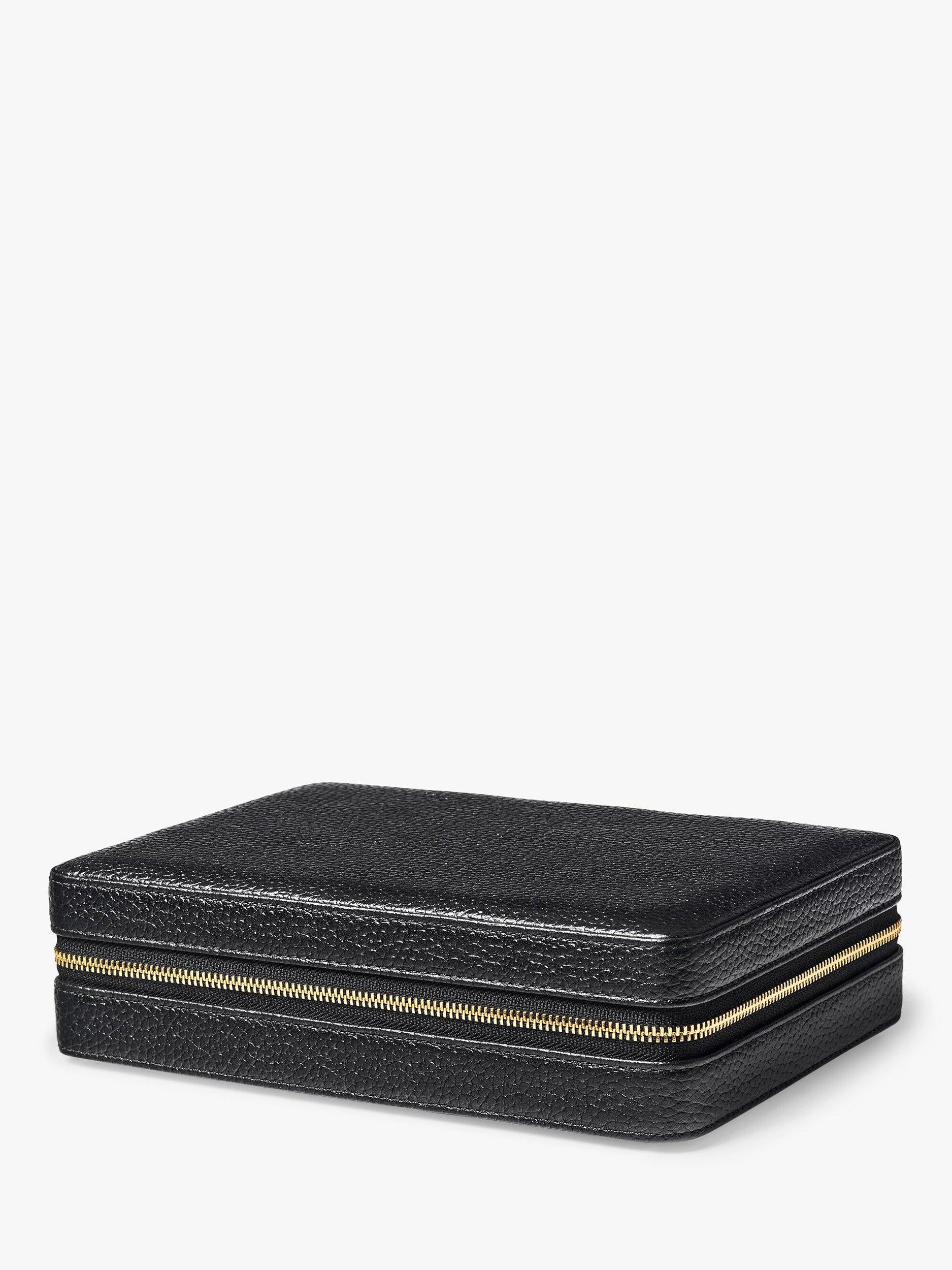 Practical and elegant, Aspinal of London's Large Travel Jewellery Case is perfect for smaller dressing tables and packing in your suitcase. Handcrafted from the finest full-grain leather, this compact piece is lightweight yet durable for keeping your treasured possessions safe on your travels. The three-quarter zip-around fastening opens to reveal the suede-lined compartment to store petite items of jewellery such as rings and earrings.