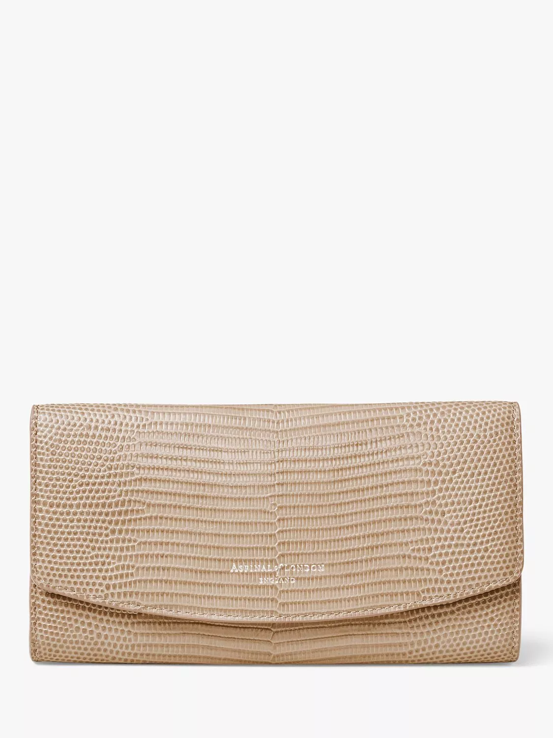 Crafted with premium textured leather, the Madison purse from Aspinal of London boasts a classic foldover design that fastens securely with a simple snap closure, opening to reveal multiple card slots and zipped pockets.