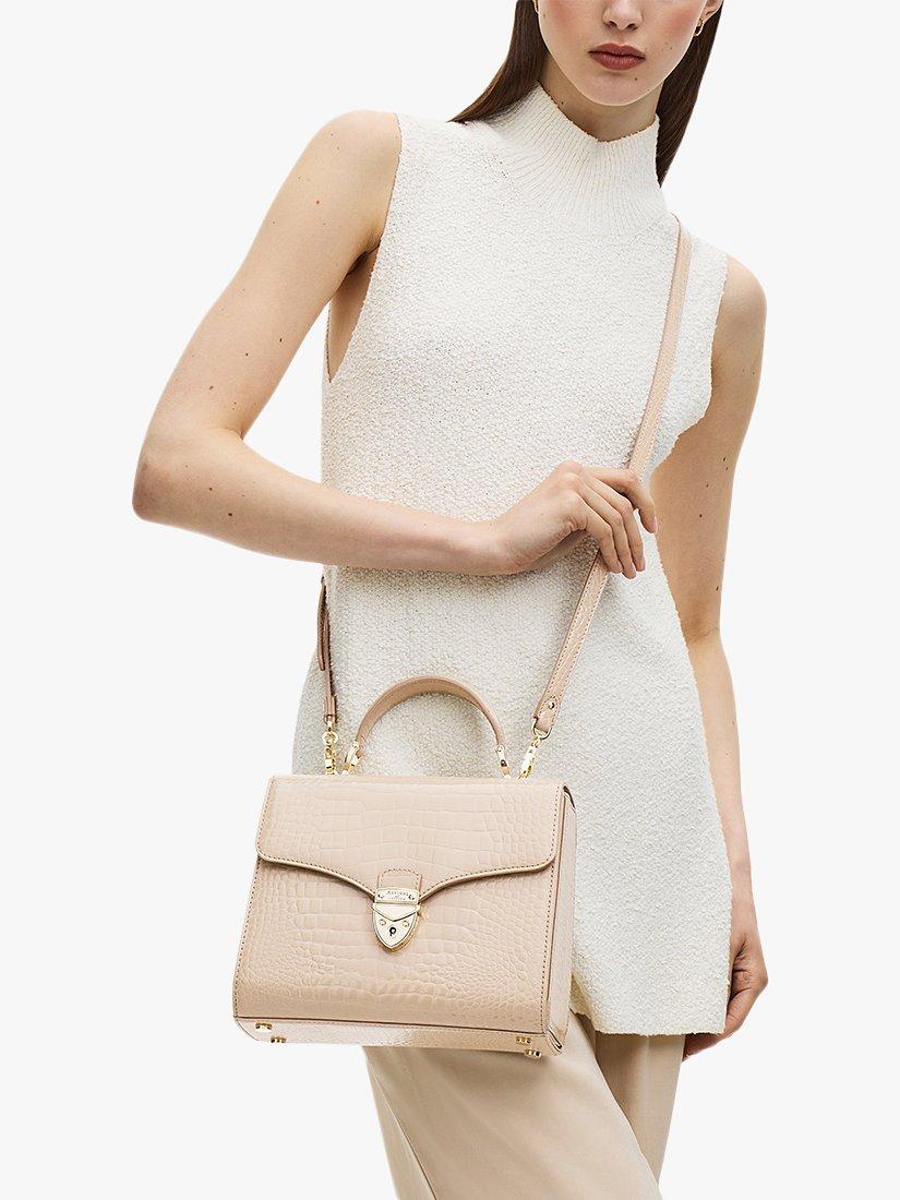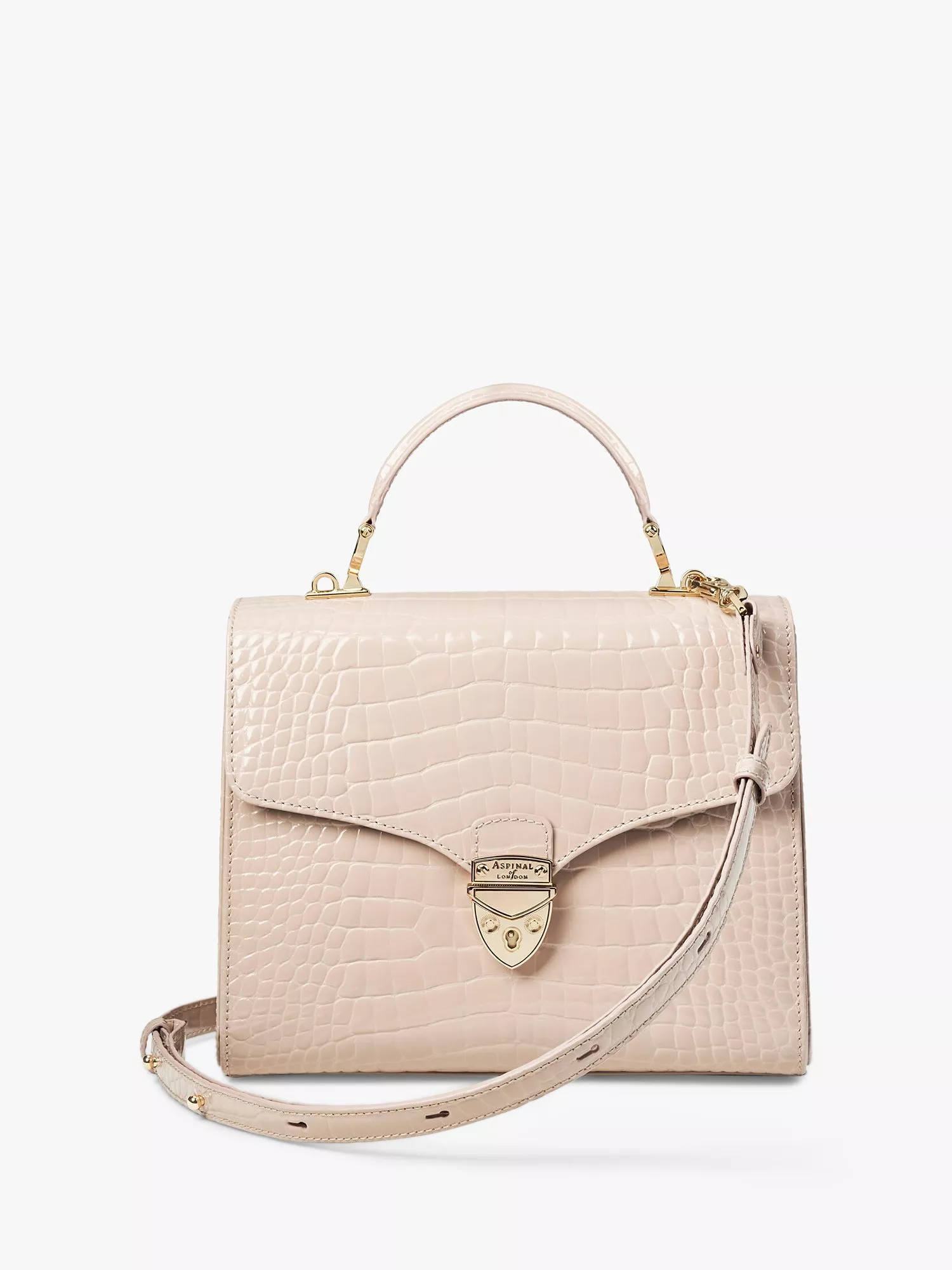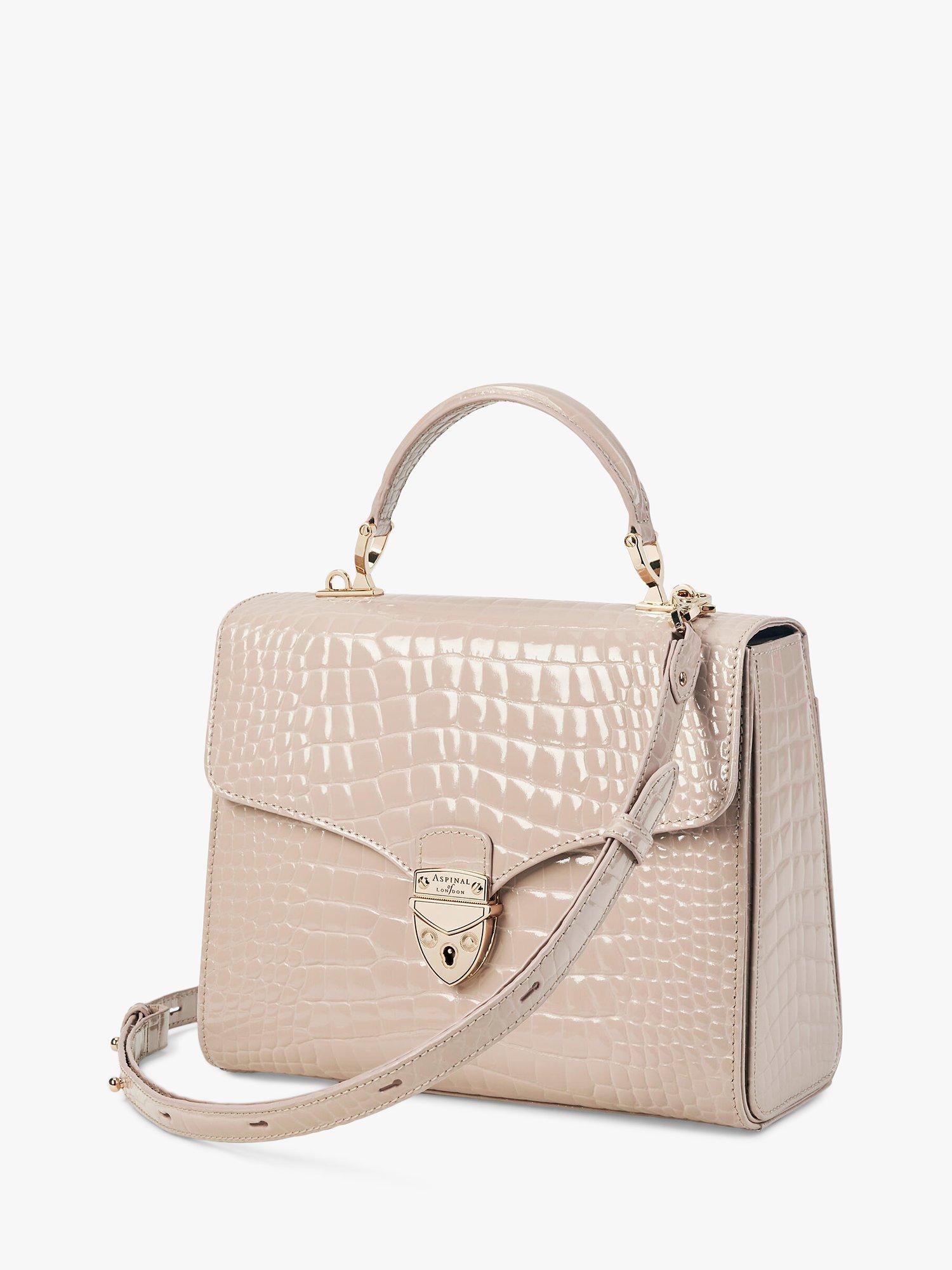 The largest size of this memorable collection, Aspinal's iconic Mayfair offers refined vintage styling with a contemporary flair. Hand-crafted from full-grain leather, it features the signature shield lock synonymous with the collection which opens to unveil a luxurious grosgrain lining with a central zipped compartment and open pockets to either side. Perfect to transition from weekday meetings to evening events, carry by the top handle or wear across the body using the detachable leather strap.
