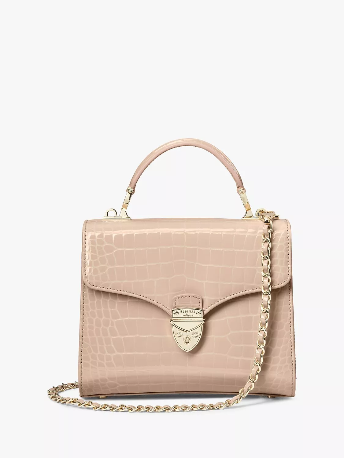 The iconic Midi Mayfair from Aspinal of London offers refined vintage styling with a contemporary flair, perfect for transitioning from weekday meetings to evening events. Hand-crafted from Italian leather, the compact design features the recognisable signature shield lock synonymous with this memorable collection, which opens to unveil a luxurious grosgrain lining with a central zipped compartment and open pockets to either side. Carry by the top handle, or wear across the body using the detachable chain strap.