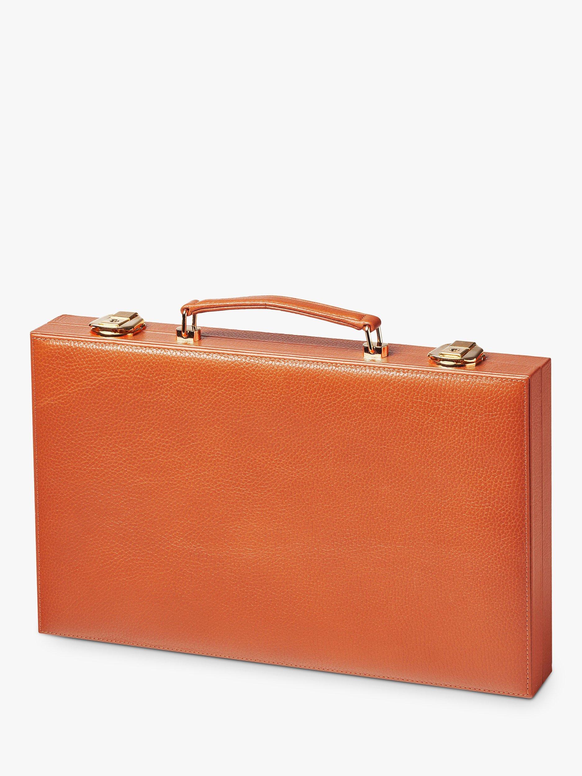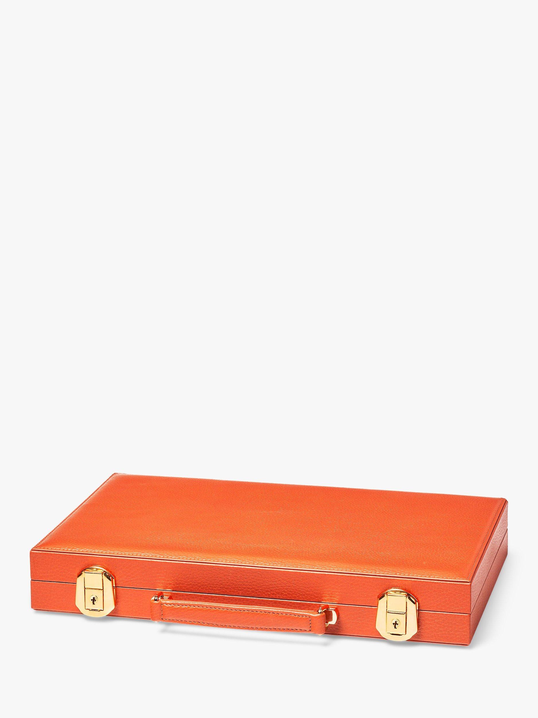Aspinal of London's 15-inch Backgammon Set celebrates one of the world's oldest board games with a contemporary twist. The compact briefcase-style wooden frame is hand-bound in full-grain leather, while the contrast playing points are created with over 50 pieces of inlaid leather to ensure a fast and smooth playing surface. Secured by lockable clasps, inside you will find everything you will need for this classic game - from smooth checkers to leather dice cups.