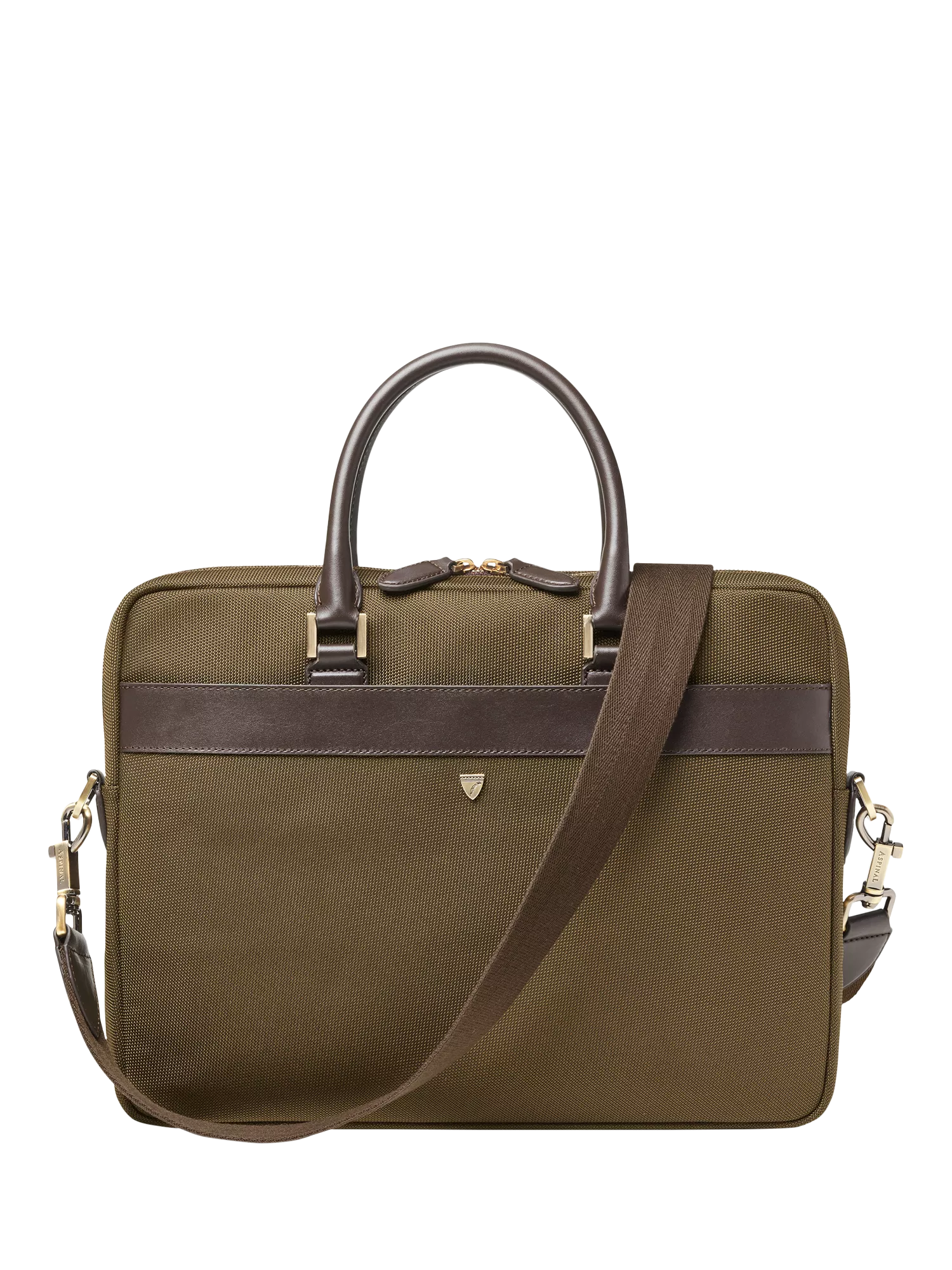 A zipped pocket keeps wallets and keys secure. Externally, a slip compartment allows for easy access to frequently reached-for items. Complete with numerous carrying options, the Slim Briefcase can be carried with the top handle or hands-free on the shoulder or sat atop a suitcase, securely attached to the handle via the trolley strap.
