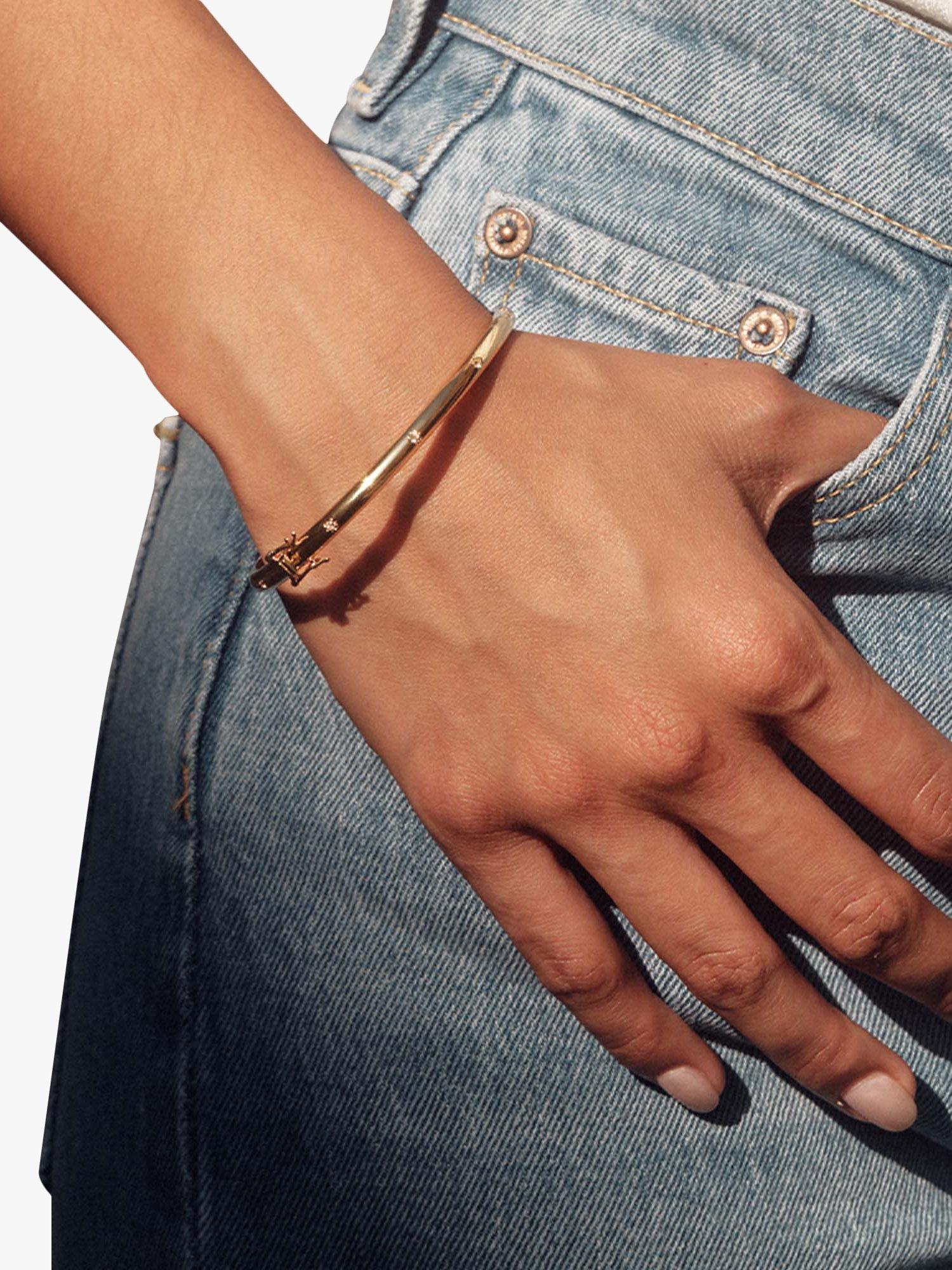 This delicate design is inspired by the constellations and scattered with White Sapphire stars. The hinged design complete with safety latch keeps it ultra-secure and its lightweight design means it's perfect for stacking with other bracelets, too.