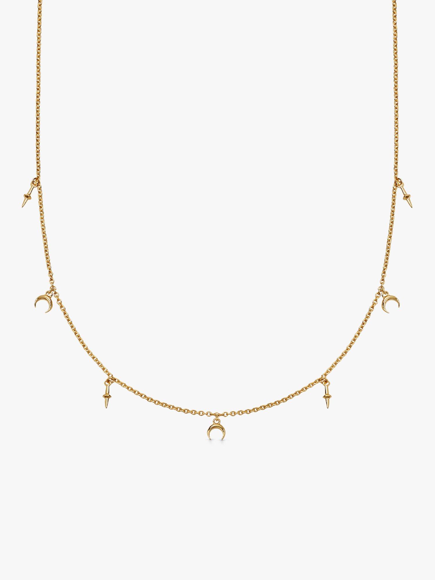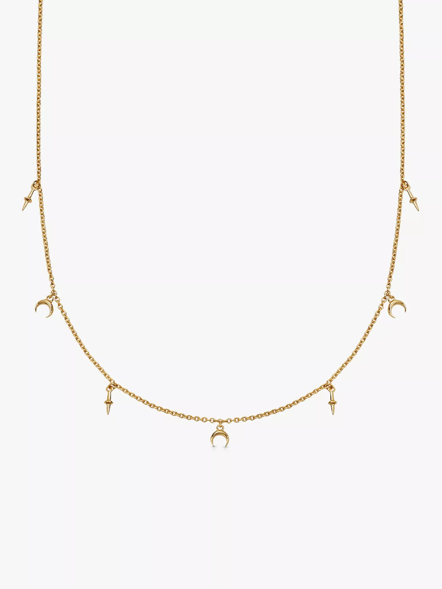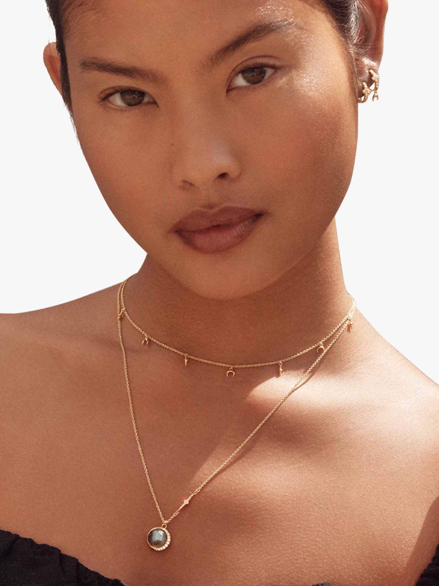 Suspending from a double layered chain, this crescent moon necklace from Astley Clark symbolises calm rejuvenation with its topaz stone.