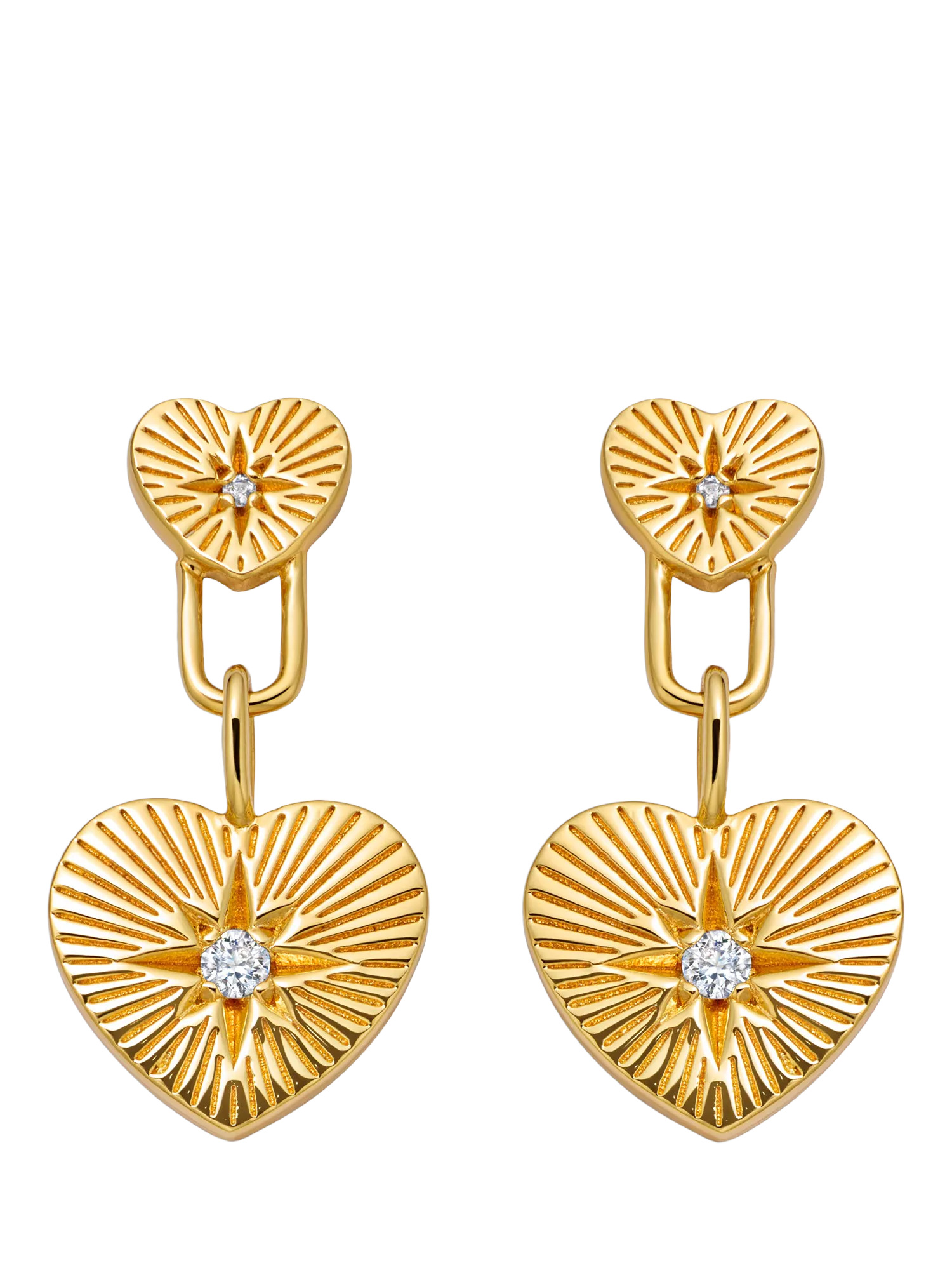 Fall for these double heart drop earrings, the perfect statement piece with an extra drop of passion. Timeless gold plated vermeil with glistening white sapphires.Suitable for pierced ears only.