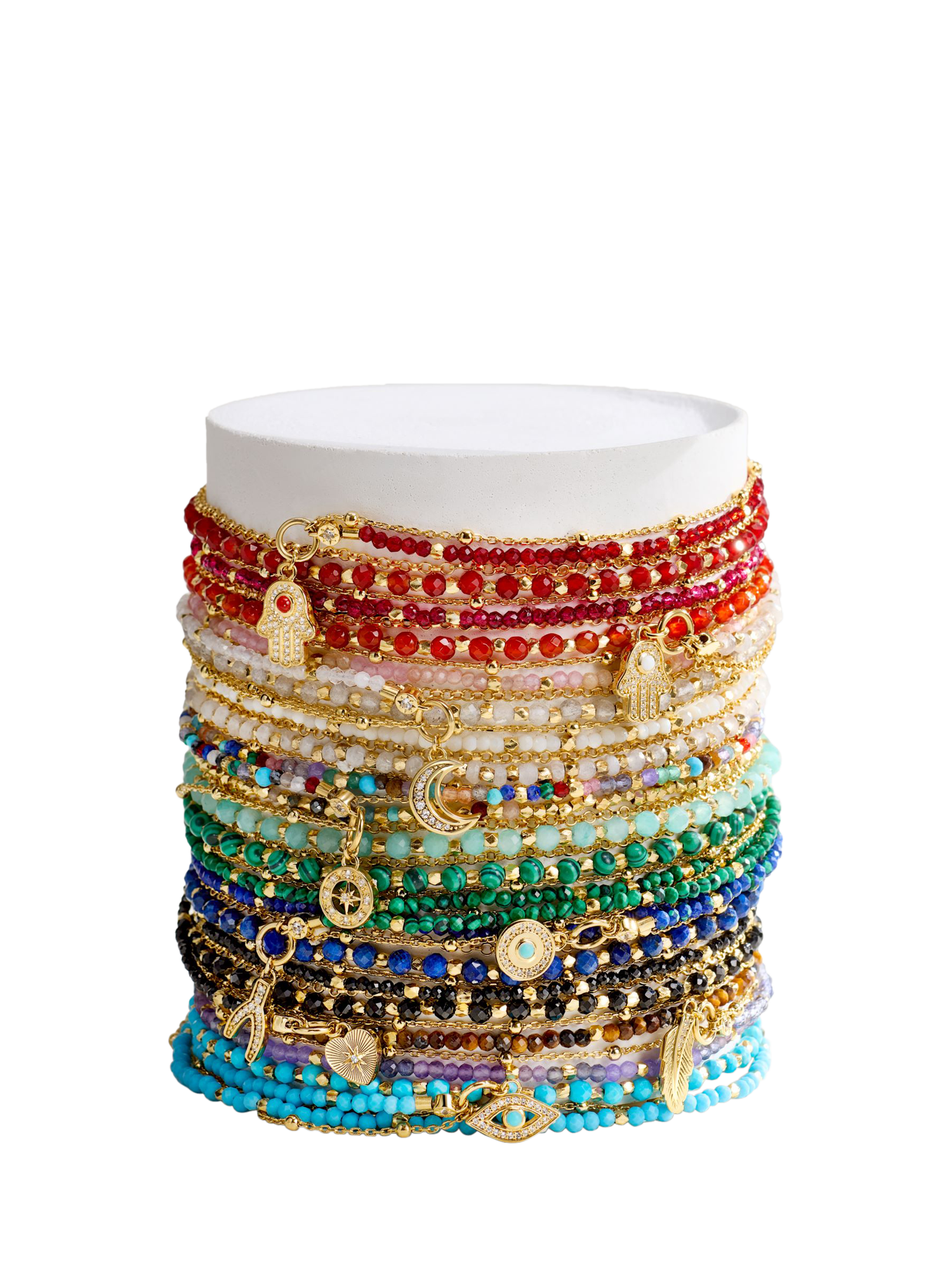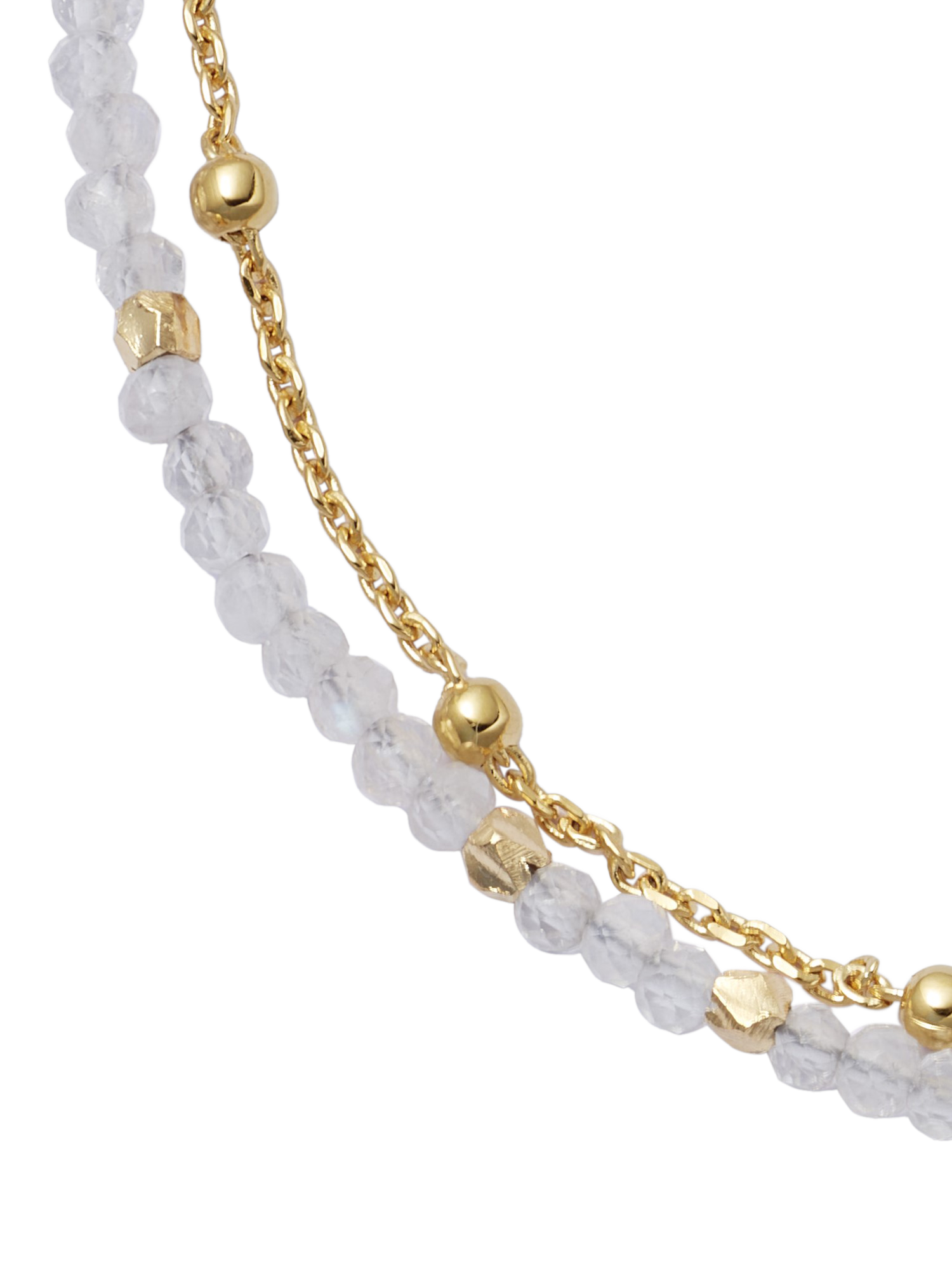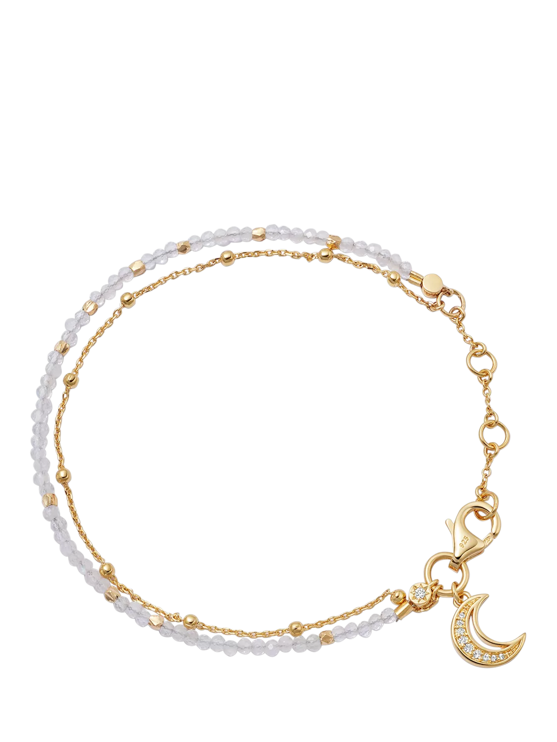 This double-strand bracelet features calming moonstone, interspersed with gold nuggets and spaced according to ancient lucky numbers. Layered with an on-trend beaded chain crafted in 18ct gold vermeil, this bracelet's moon charm will add a special meaning to your stack.