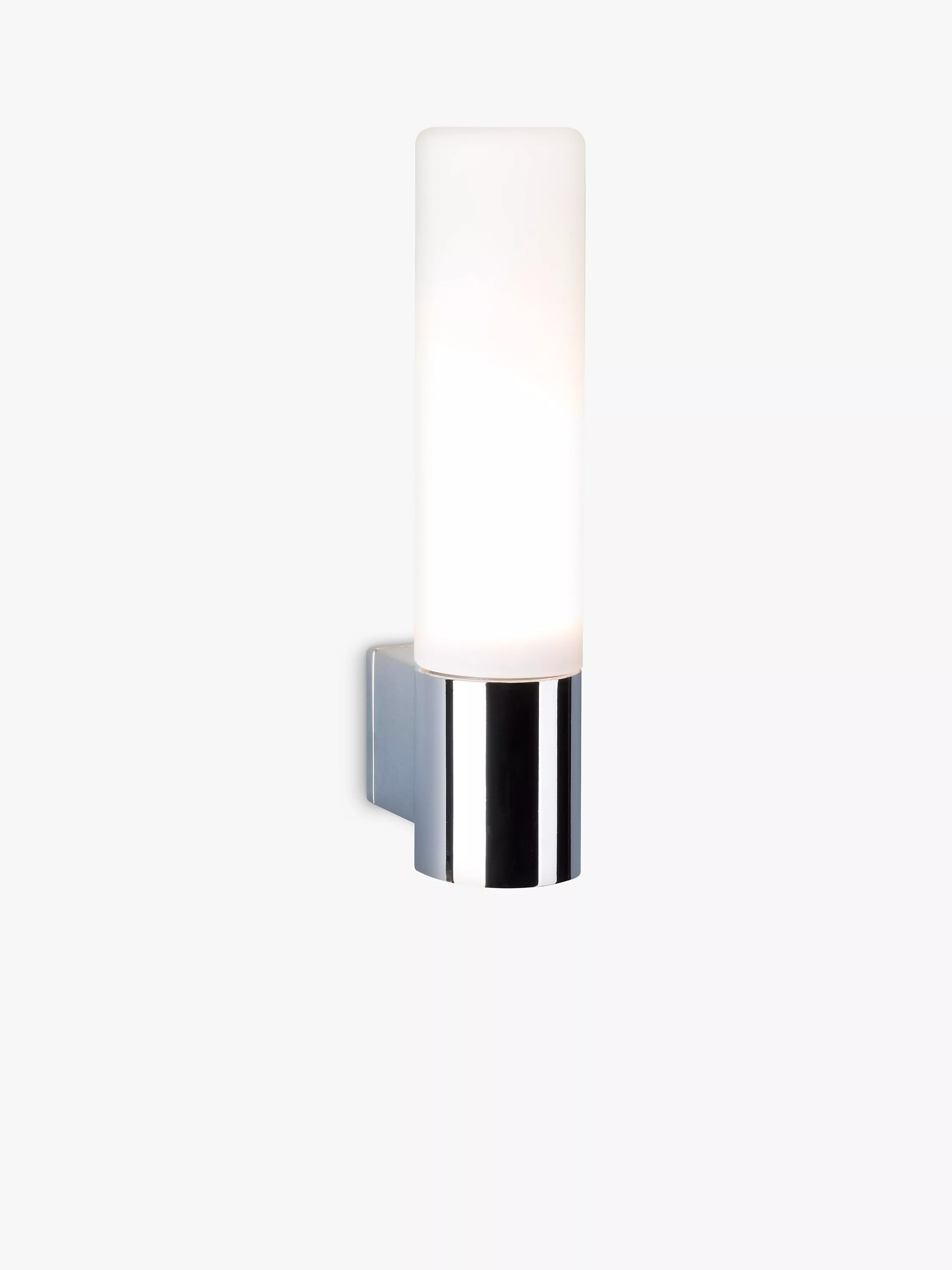 Made with an opal glass cylindrical shade mounted on a simple polished chrome fitting, the petite size of this wall light makes it especially well-suited to smaller rooms. Install one on either side of a mirror as a bright and comfortable task light. It's IP44 rated so it's safe to use in bathrooms but it also works well as an ambient lighting solution elsewhere in your home.