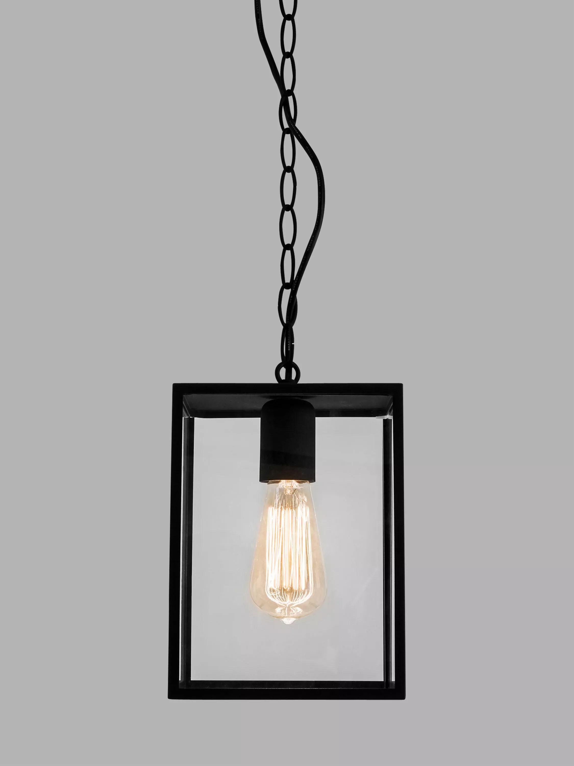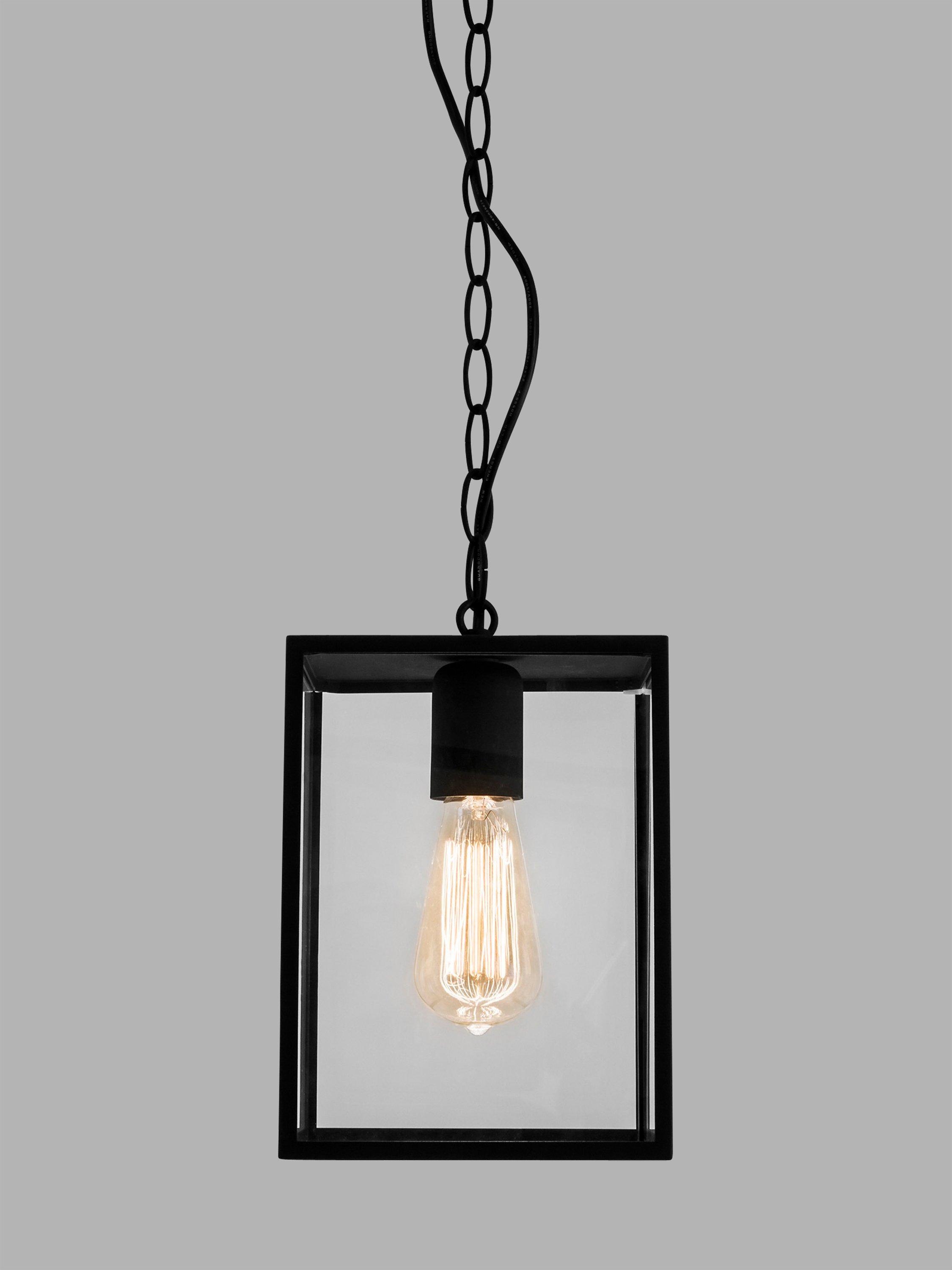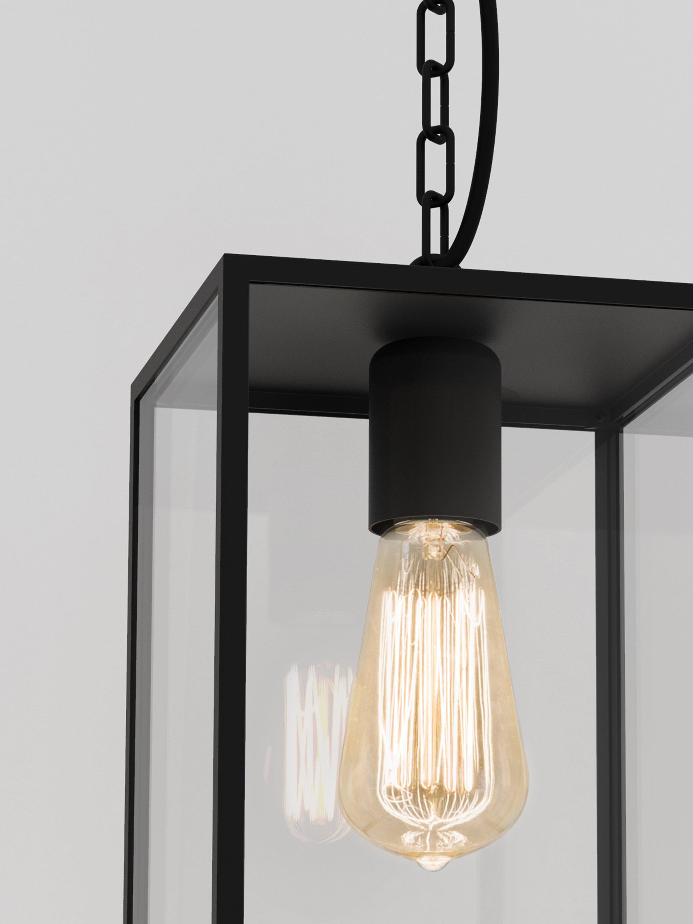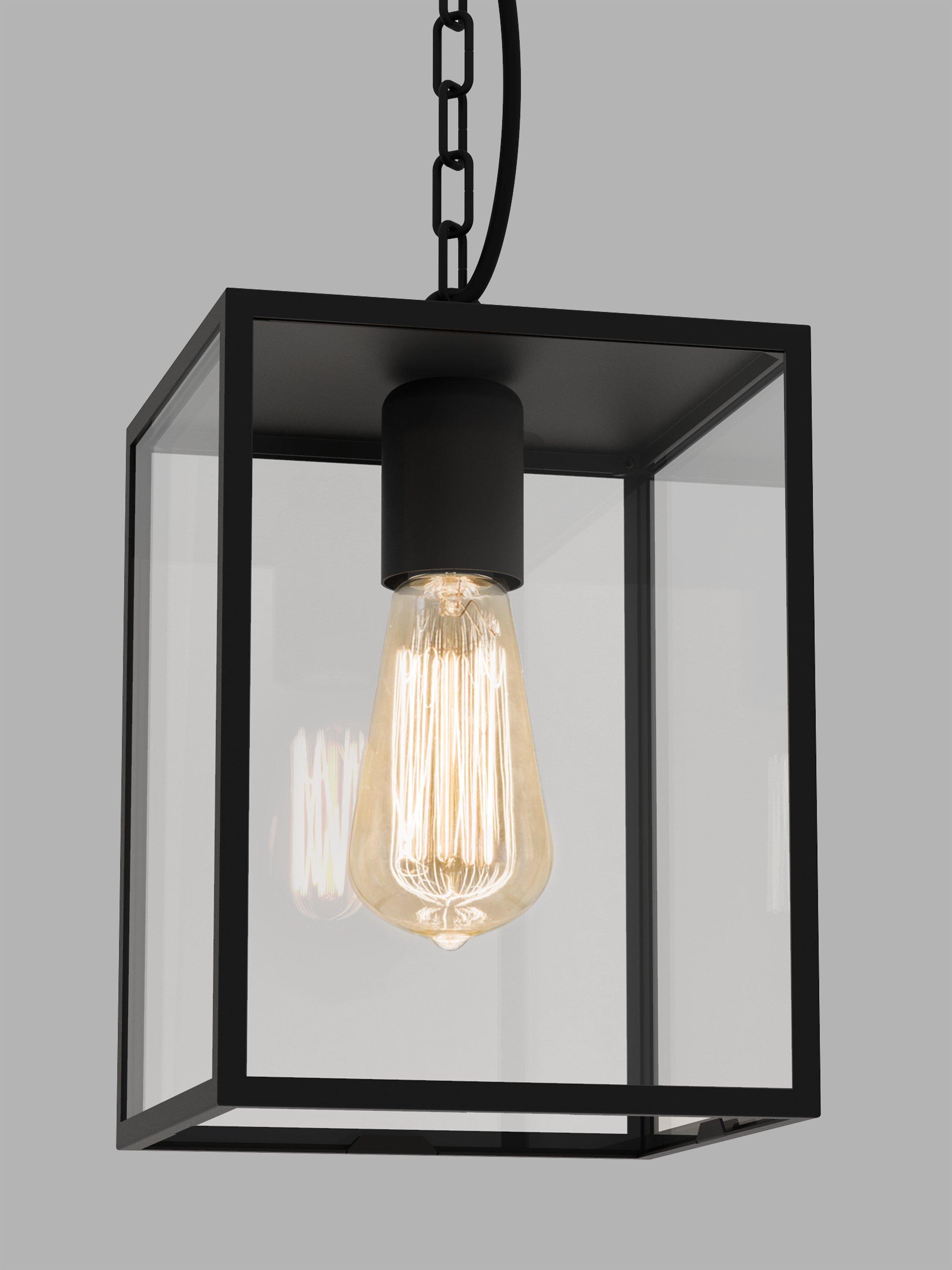 Based on a classic lantern look, this outdoor pendant suits both period and modern homes. Made with clear glass panels encased in a textured metal frame, it’s intended for use in porches, but also adds drama to interior spaces such as hallways and landings. The chain can also be adjusted to your desired height. Choose a filament LED bulb for a timeless look.