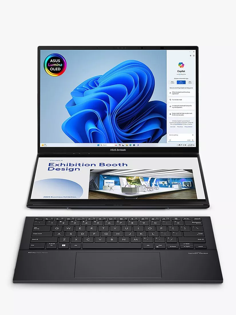 The ASUS Zenbook DUO is a revolutionary dual-screen laptop, with two OLED touchscreens, detachable full-size keyboard and built-in kickstand, expertly combining multitasking versatility with superb mobility. Using both 14” 3K OLED 120Hz displays, you can instantly expand your workspace to up to 19.8 inches. Outstanding performance is assured with an Intel Core Ultra 9 processor and 32GB of memory, plus a huge 2TB of SSD storage. With dedicated smart software, intuitive gesture control and a long-lasting battery, the easy-to-use Zenbook Duo maximizes productivity, with zero fuss. Now you can Duo it!