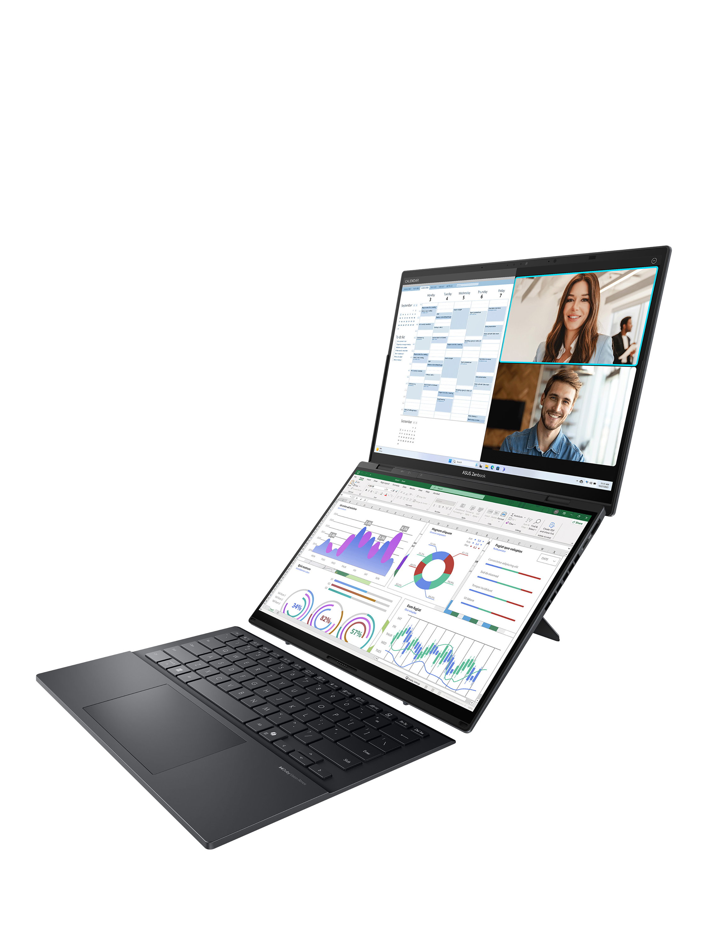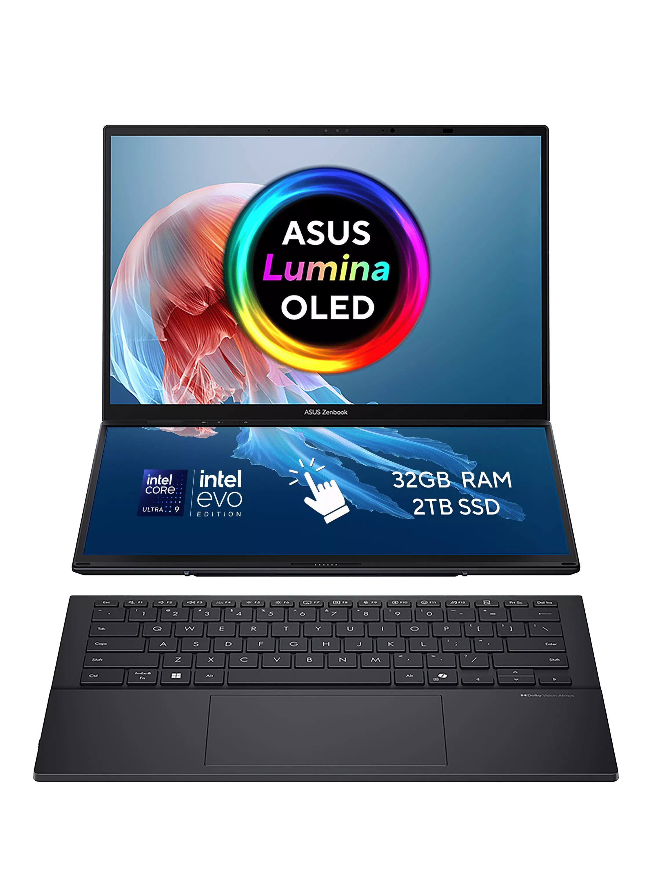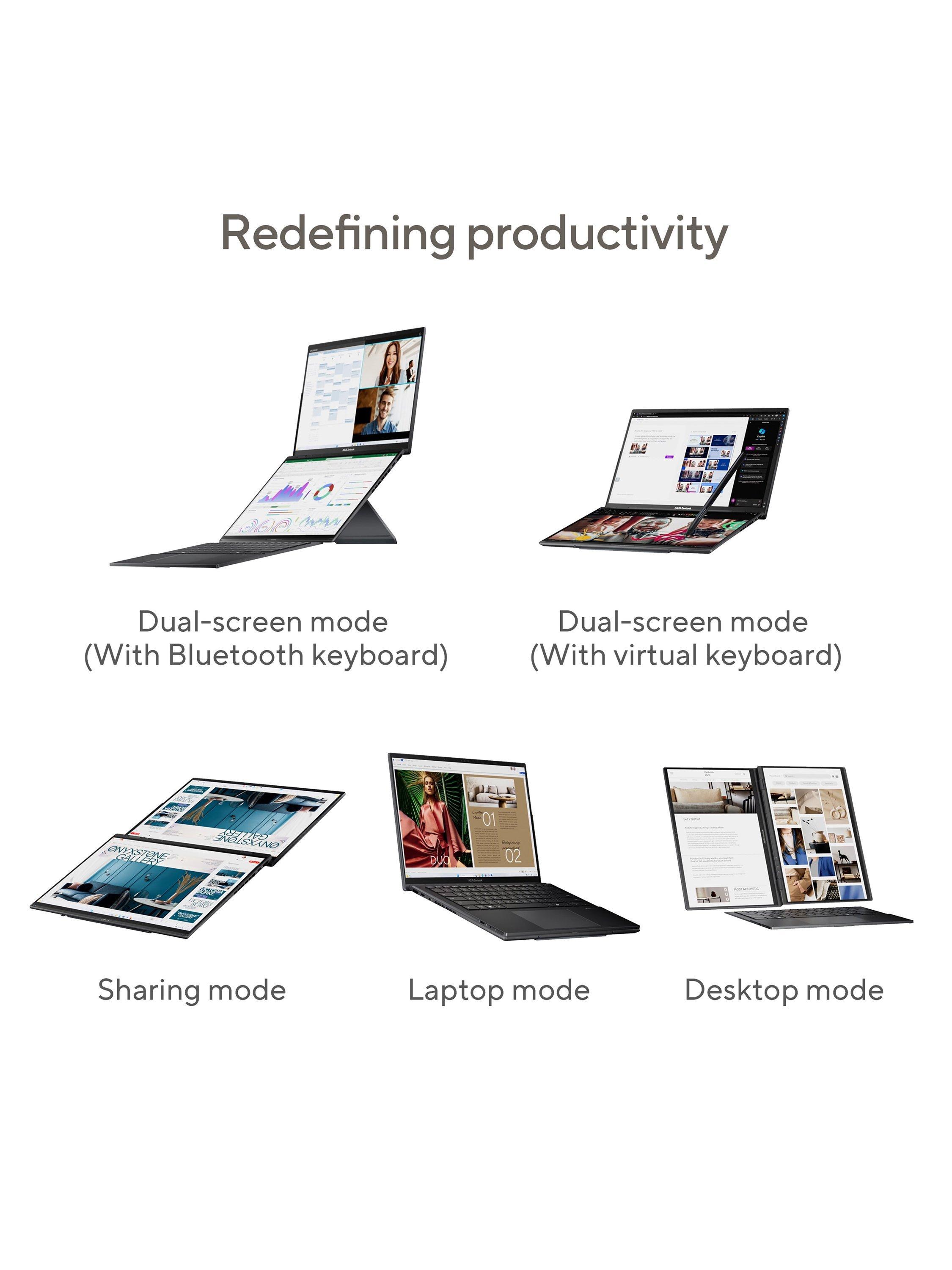 The ASUS Zenbook DUO is a revolutionary dual-screen laptop, with two OLED touchscreens, detachable full-size keyboard and built-in kickstand, expertly combining multitasking versatility with superb mobility. Using both 14” 3K OLED 120Hz displays, you can instantly expand your workspace to up to 19.8 inches. Outstanding performance is assured with an Intel Core Ultra 9 processor and 32GB of memory, plus a huge 2TB of SSD storage. With dedicated smart software, intuitive gesture control and a long-lasting battery, the easy-to-use Zenbook Duo maximizes productivity, with zero fuss. Now you can Duo it!