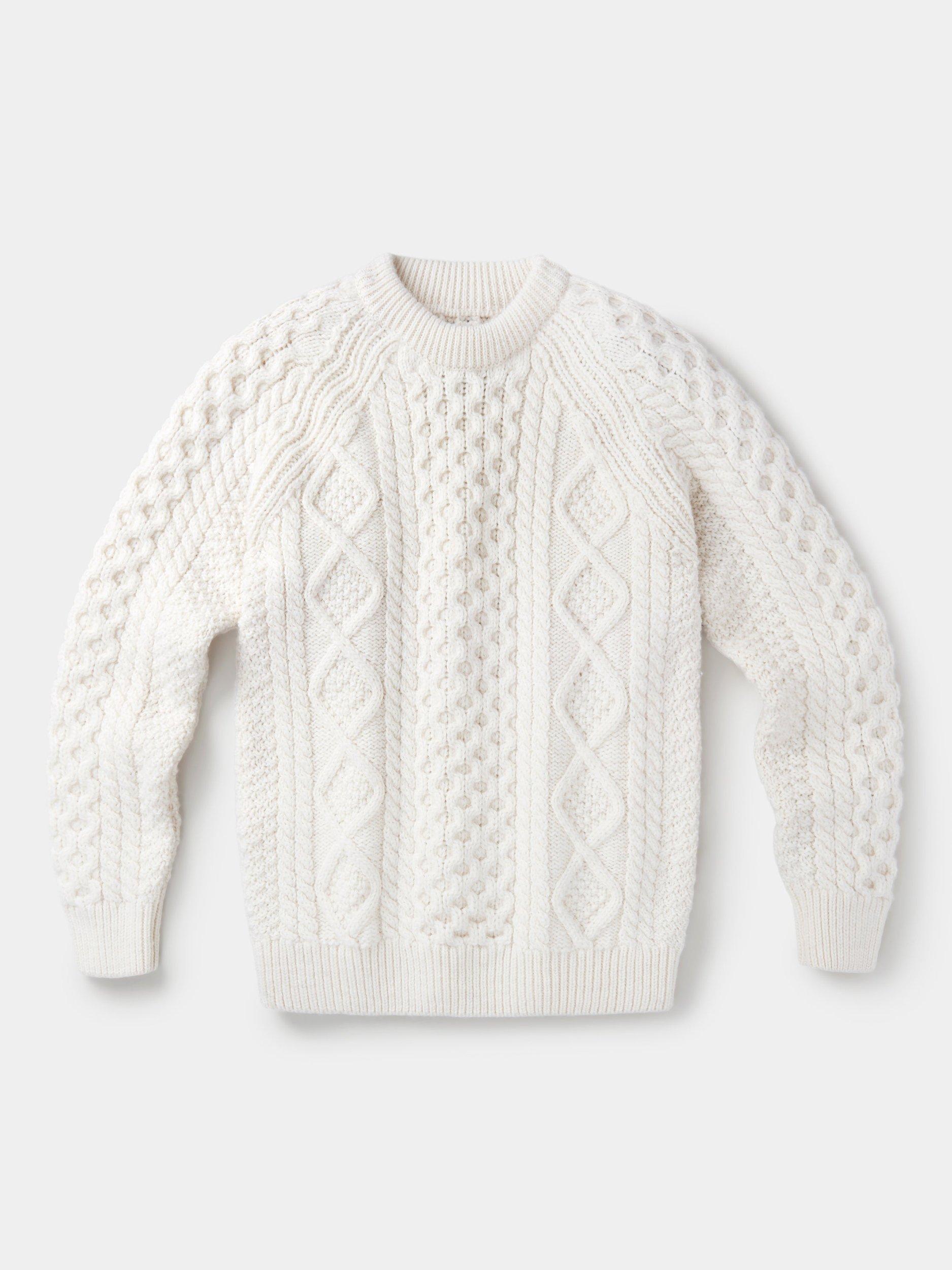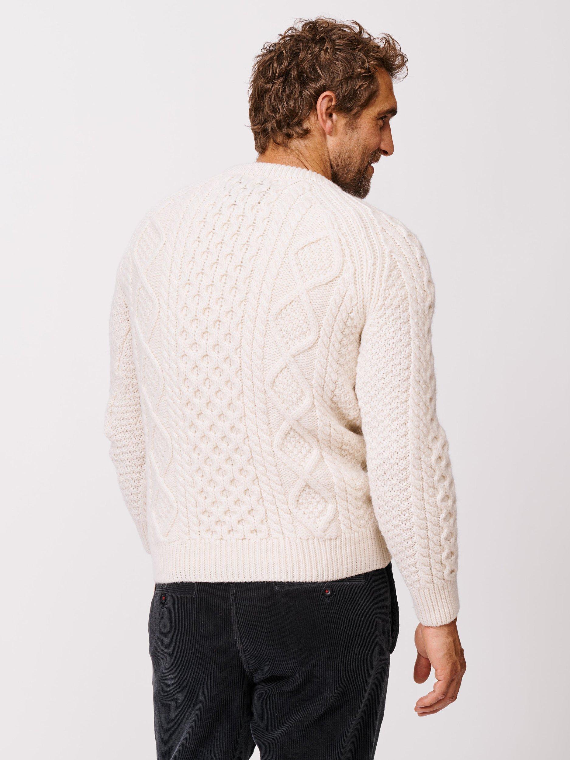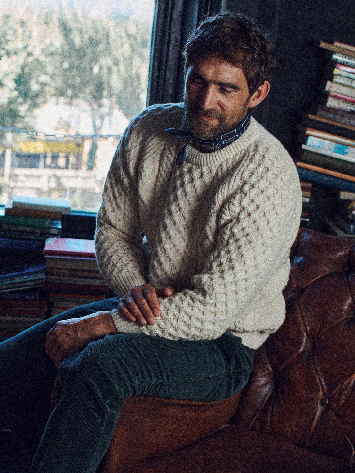 Inspired by the iconic Steve McQueen Aran, he wore it with a baseball cap and a big cigar, but we'll leave the styling to you. The Aran is knitted in the UK using high-quality British wool with a new softer hand feel.
