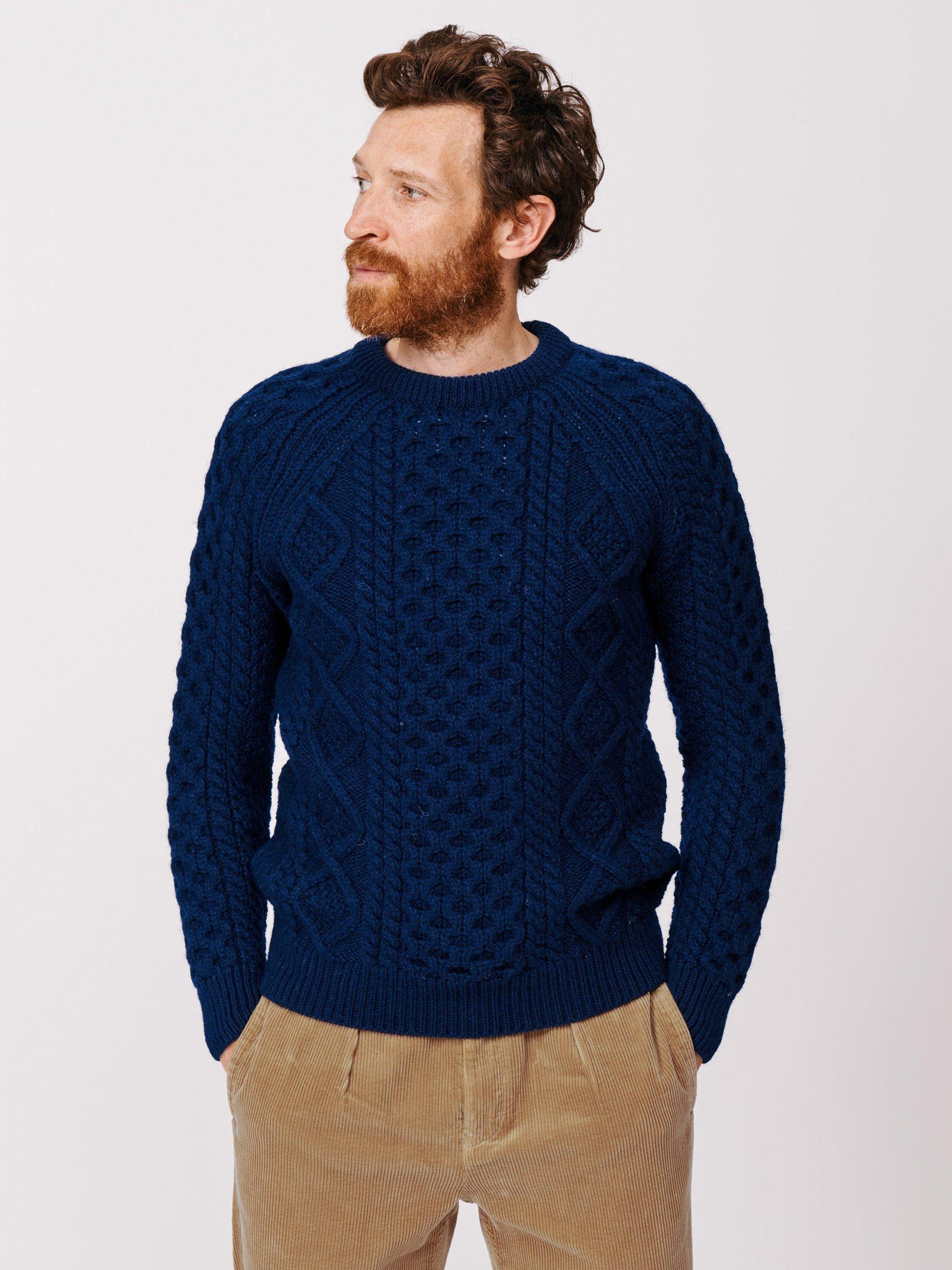 Inspired by the iconic Steve McQueen Aran, he wore it with a baseball cap and a big cigar, but we'll leave the styling to you. The Aran is knitted in the UK using high-quality British wool with a new softer hand feel.