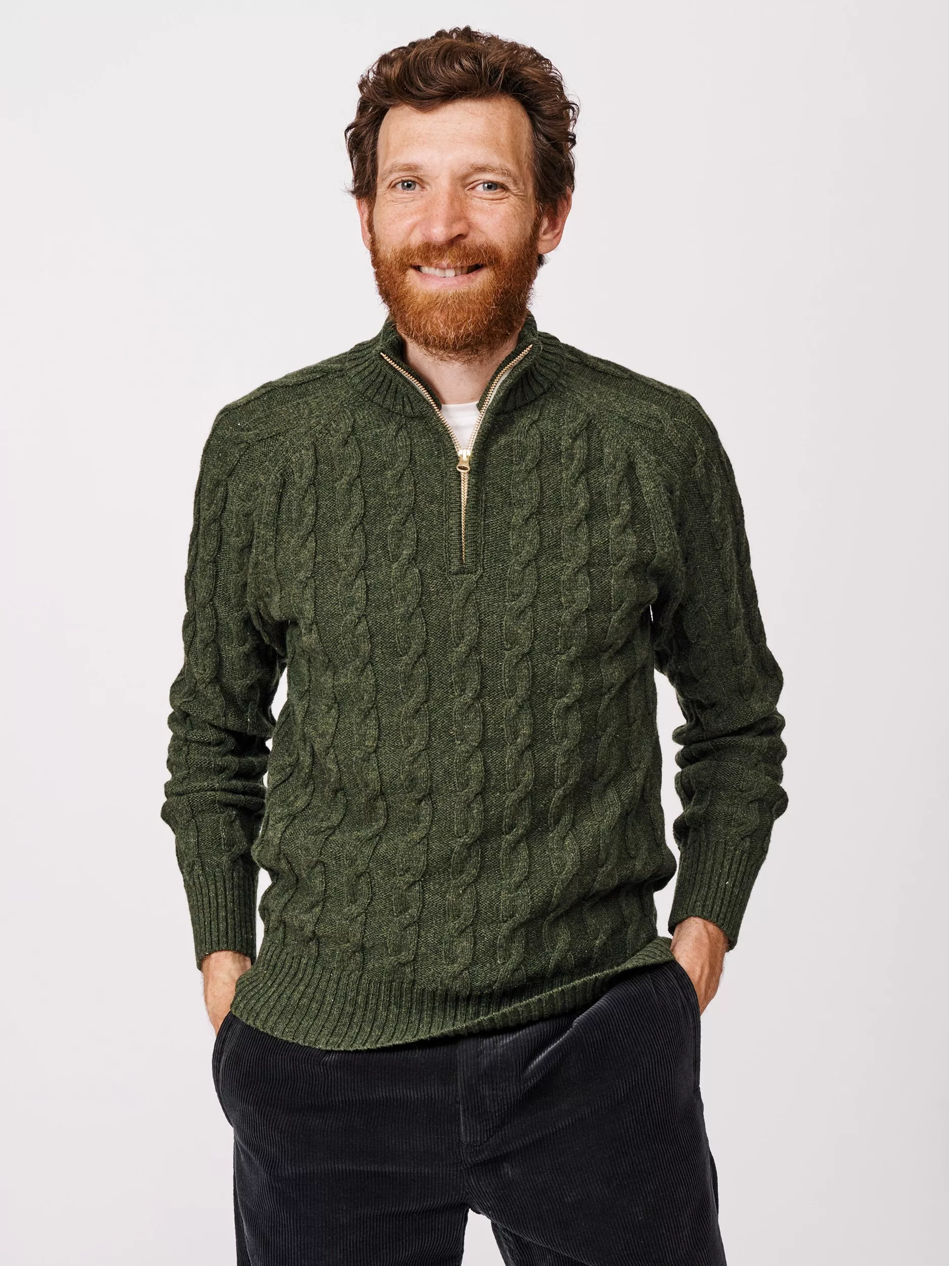 This half zip cable knit jumper is the perfect weekend layering piece. Made from 100% lambswool.