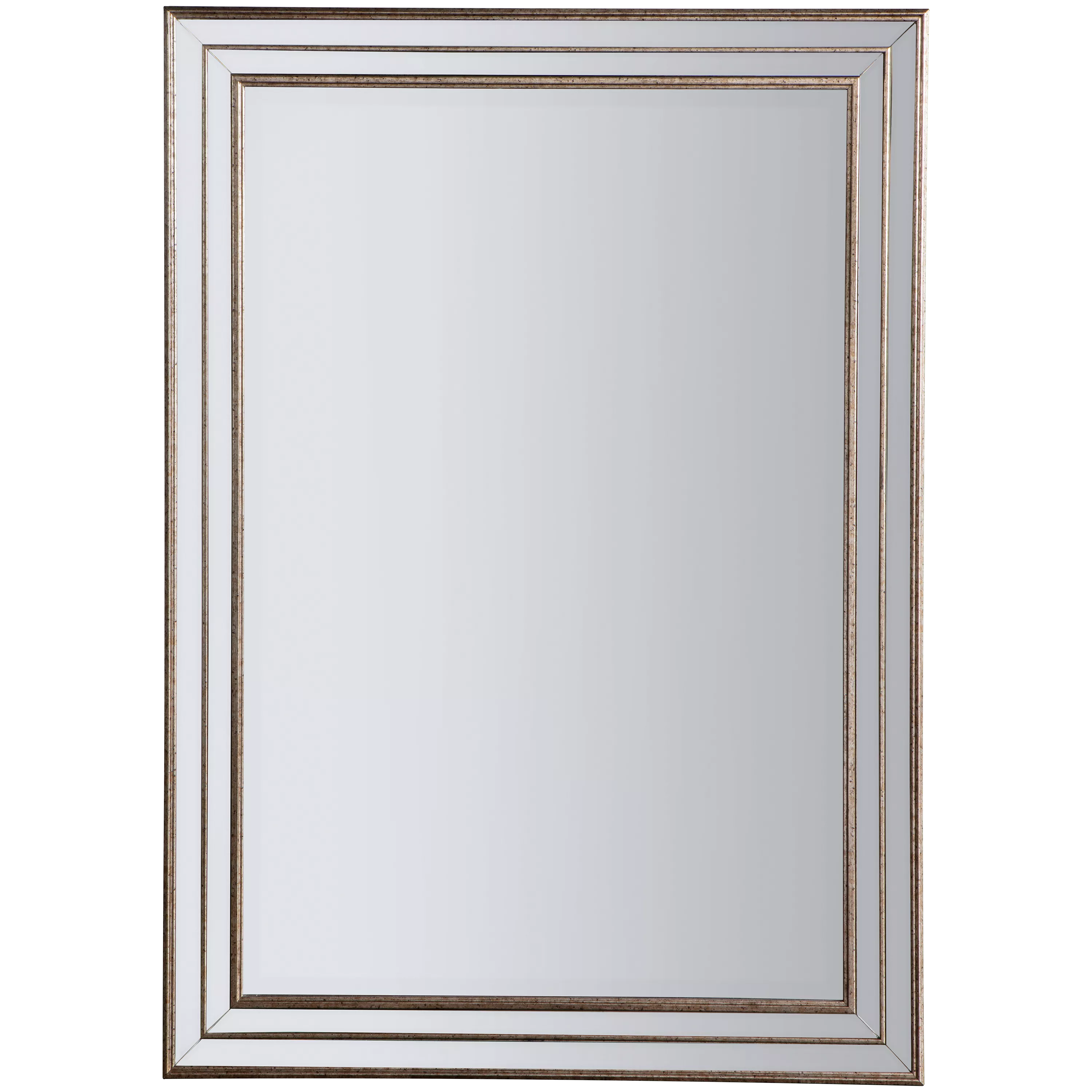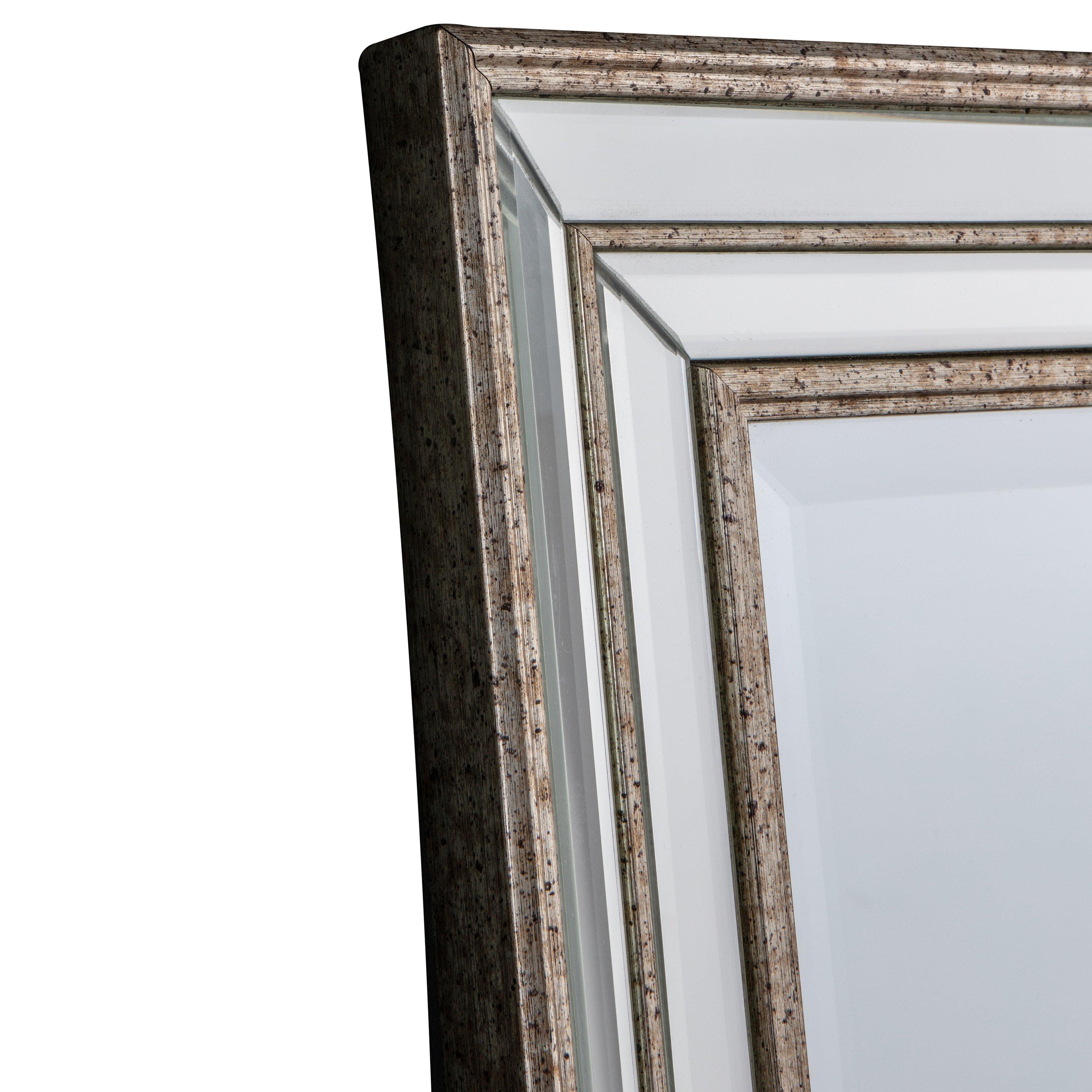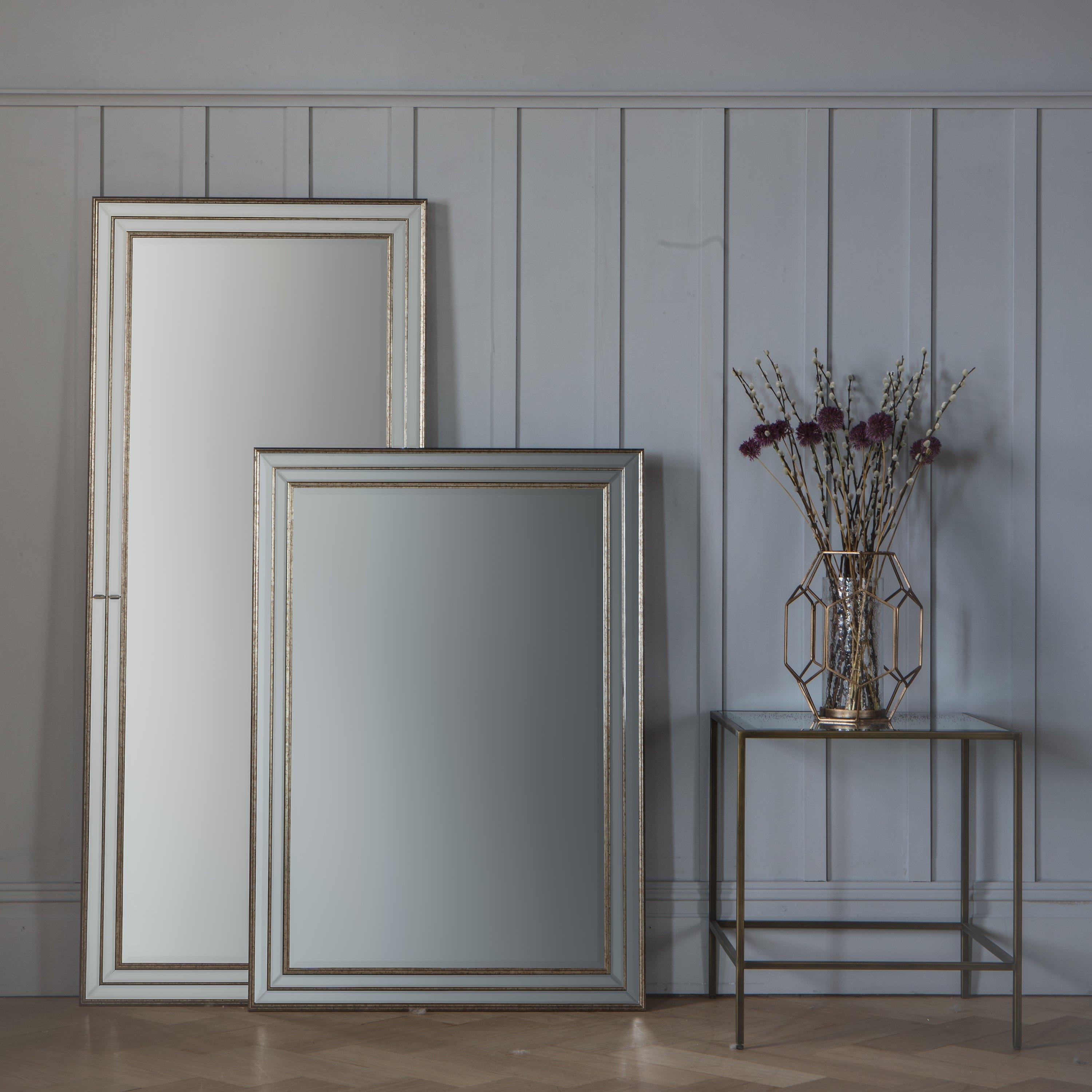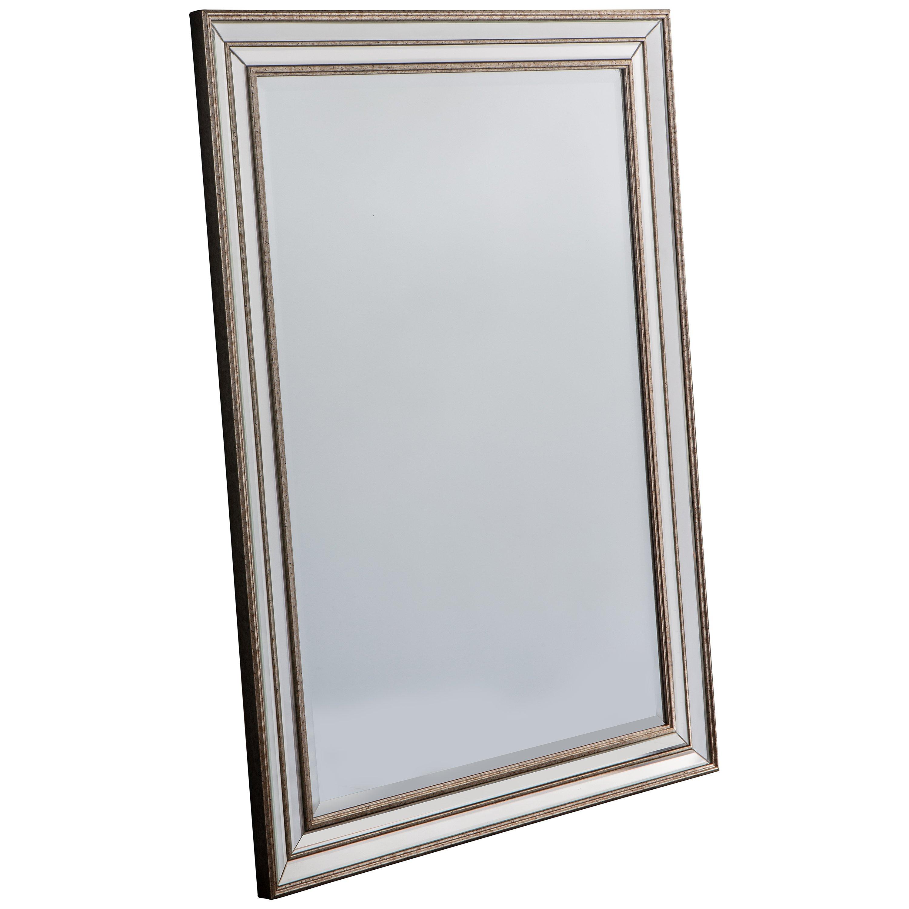 Designed with a glass frame and distressed metallic-effect bands in champagne, the Audrey mirror suits both contemporary and traditional-styled homes. This rectangular mirror is easy to wall mount, horizontally or vertically, by the hanging strap on the back.