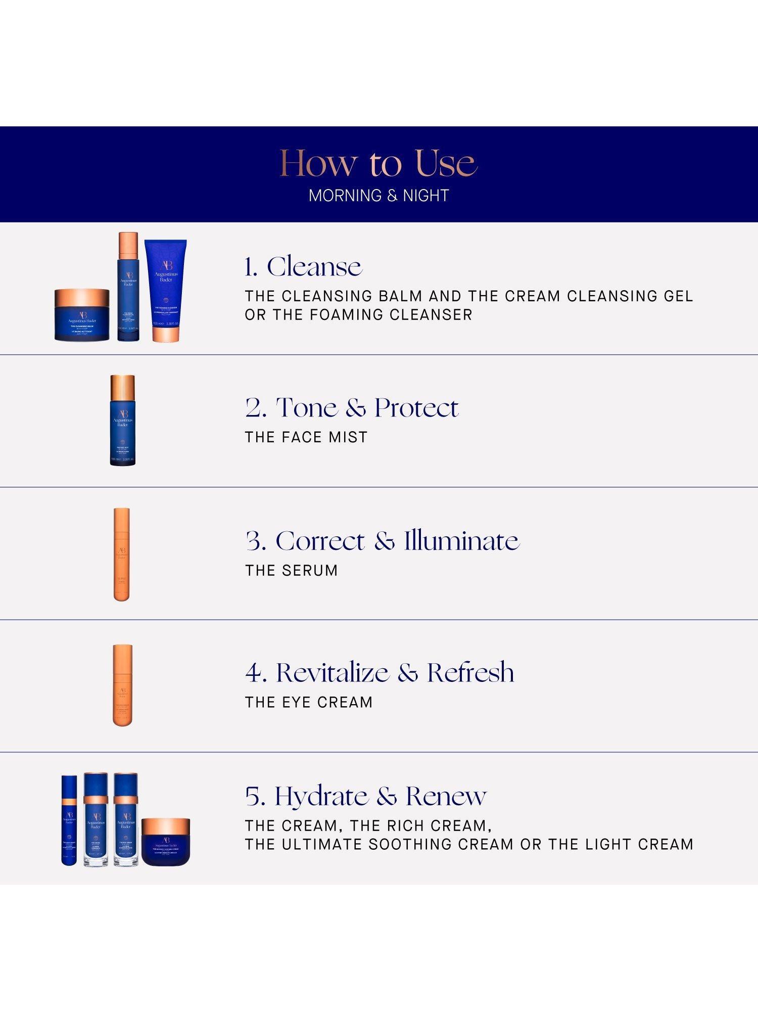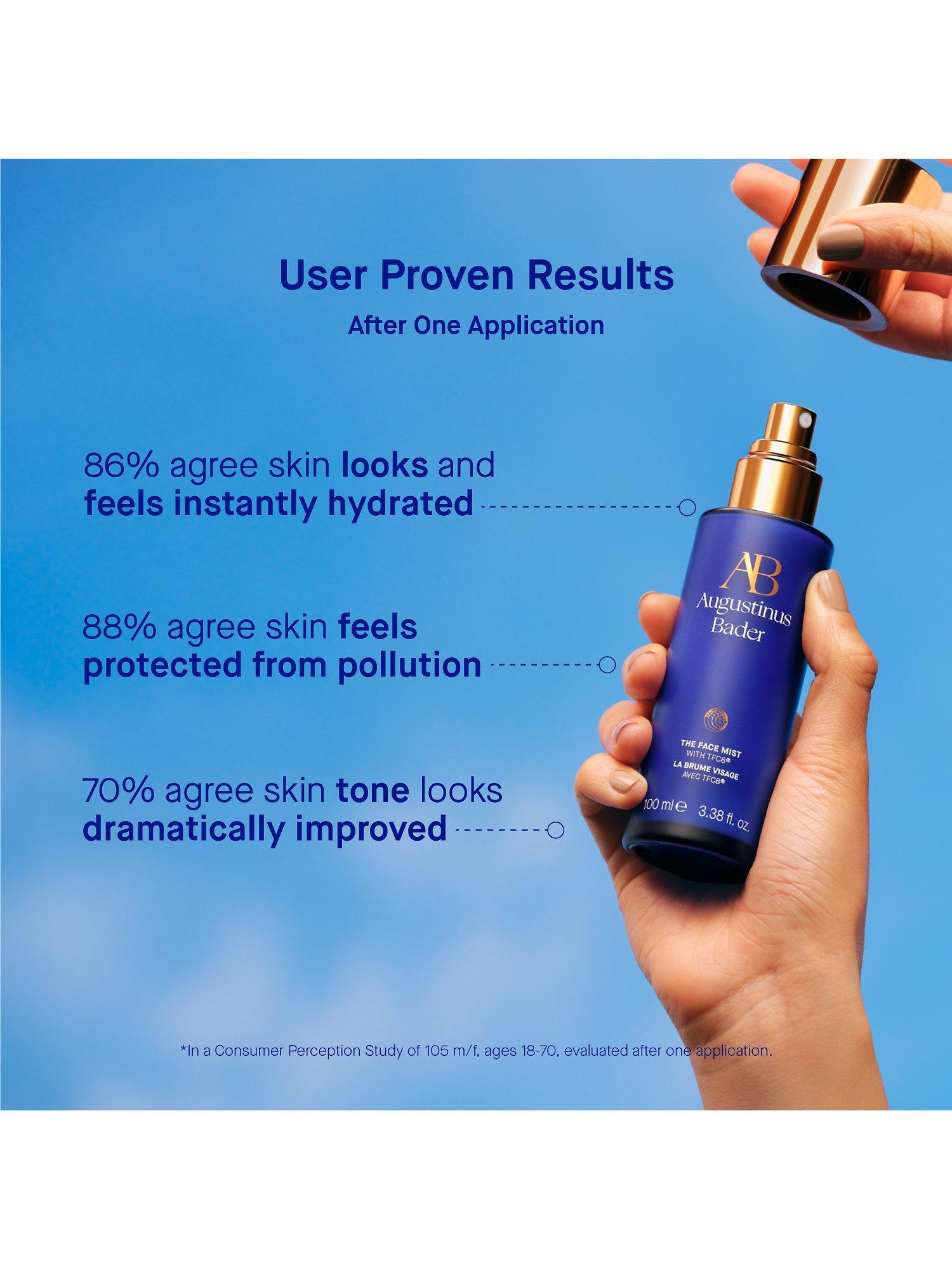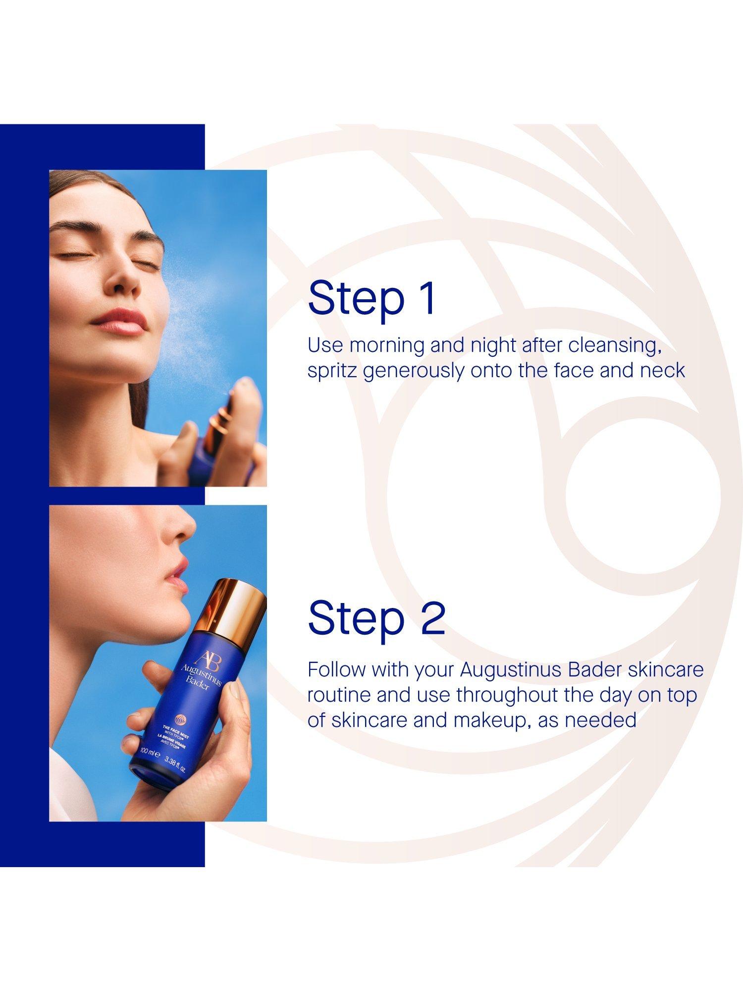 Spritz generously onto the face and neck Use morning and night after cleansing Follow with your Augustinus Bader skincare routine Use throughout the day on top of skincare and makeup, as needed