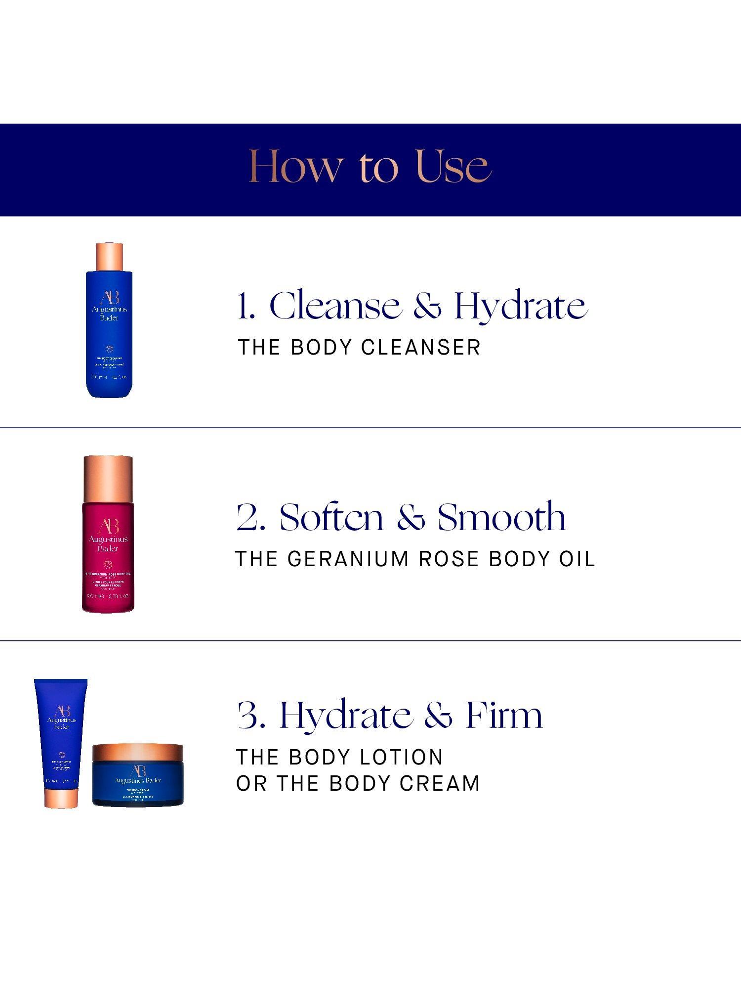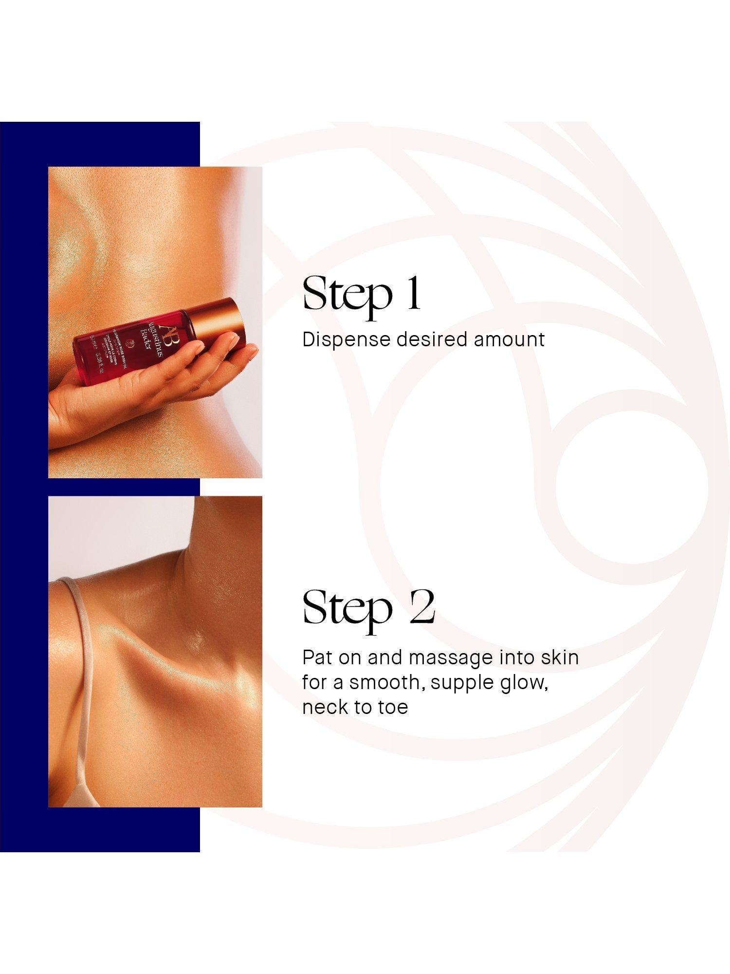 Pat on and massage into clean, dry skin as desired for a smooth, supple glow, neck to toe.