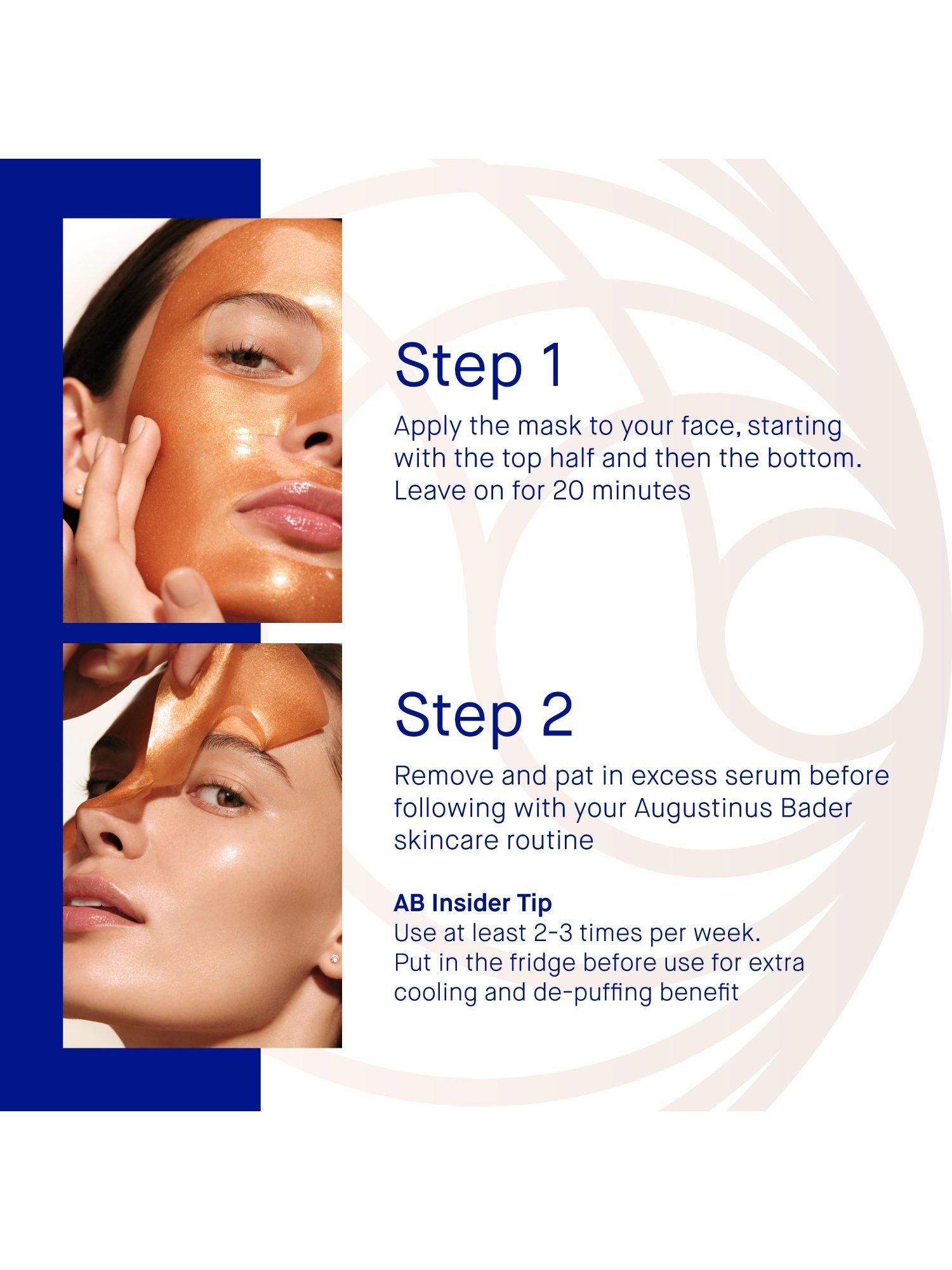 "Apply on clean, dry skin 2-3 times per week, or as desired. Apply the mask to your face, starting with the bottom half and then the top.Leave on for 20 minutes. Remove and pat in excess serum.Follow with your Augustinus Bader skincare routine. Ideal for pre-event skin prep"