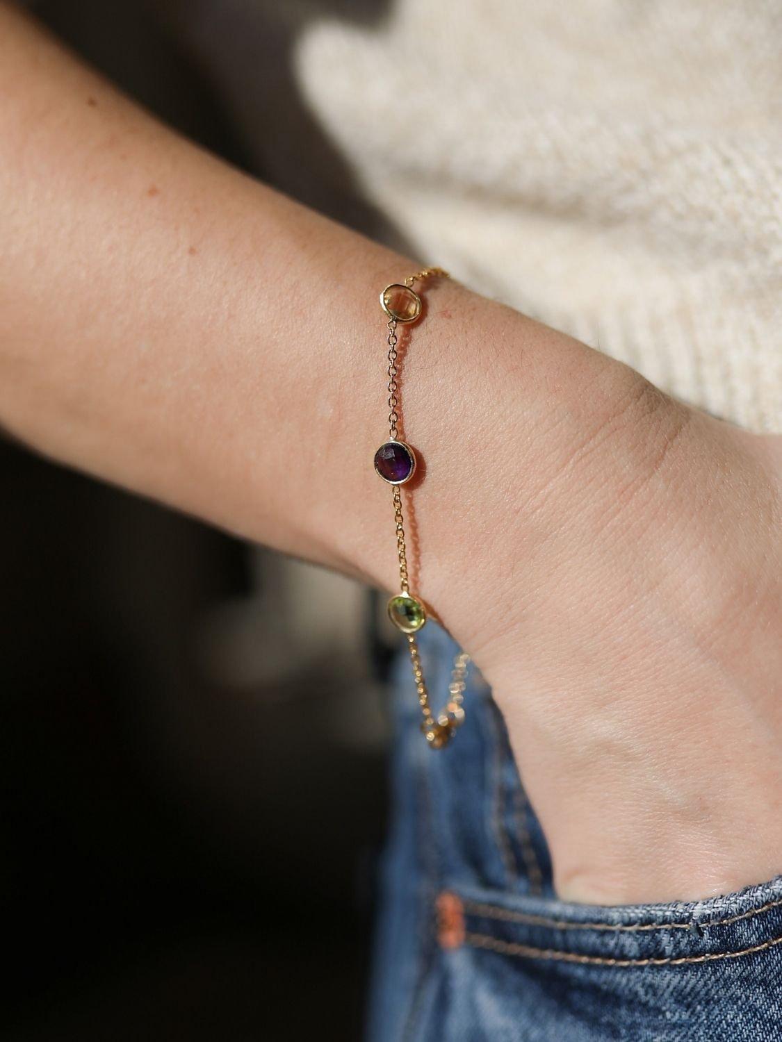 Inspired by the vibrant and colourful Indian city of Chennai. The most luxurious of gemstones have been chosen for this piece to create a truly beautiful bracelet. The five individual gemstones vary and are all rose-cut or round-cut stones and include Blue Topaz, Amethyst, Green Amethyst, Lemon Topaz and Peridot.