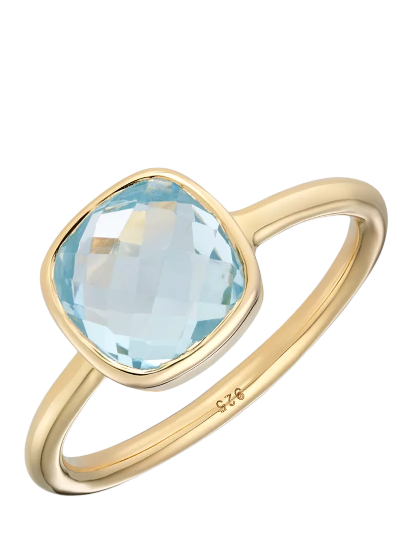 A cushion cut bright Blue Topaz gemstone is set on a polished band. Blue Topaz is believed to represent clarity and in ancient times was believed to encourage calmness and creativity.