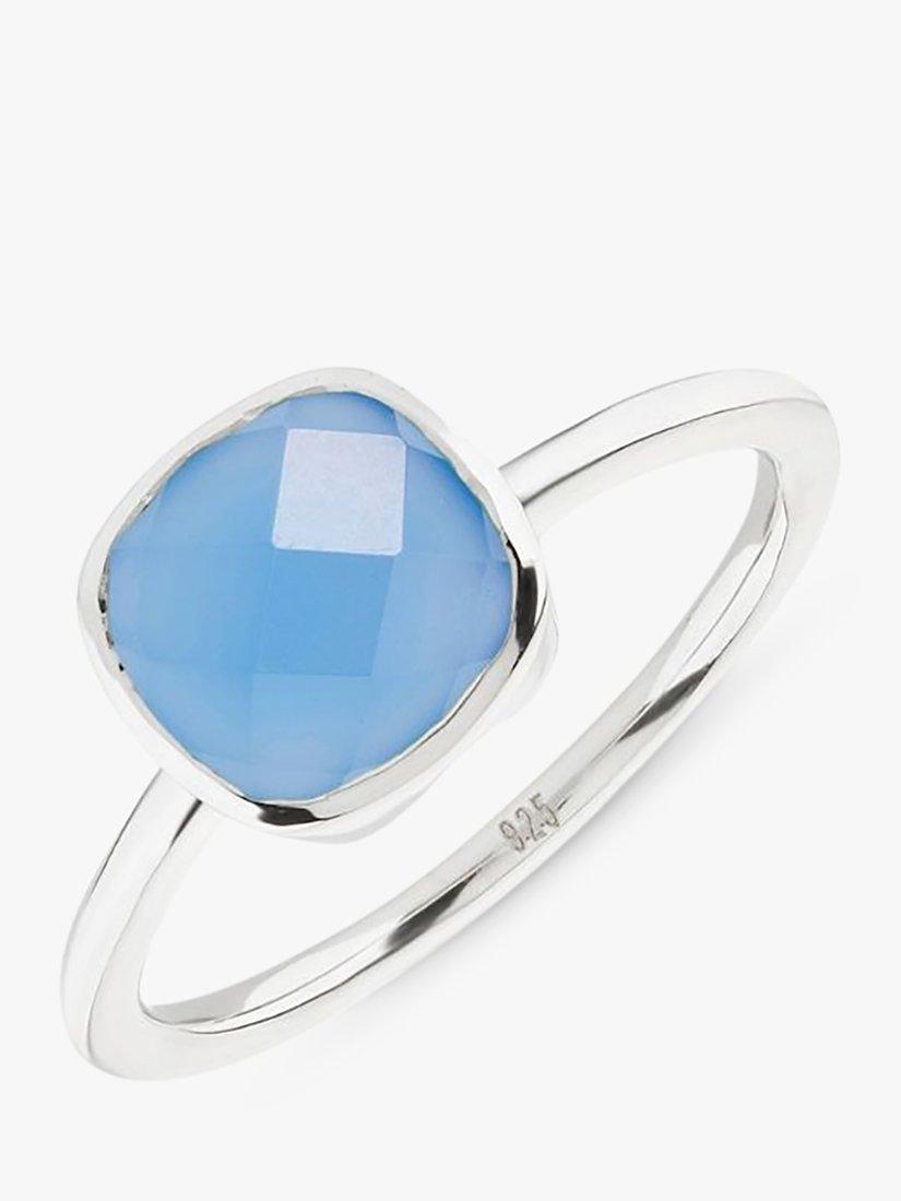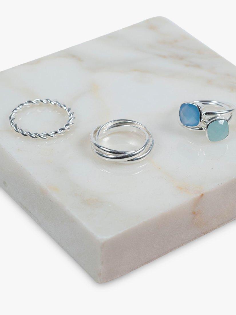 A cushion cut Blue Chalcedony gemstone set on a polished Sterling Silver Band. Why not wear all three of the Mondello rings together, they look beautiful all stacked.