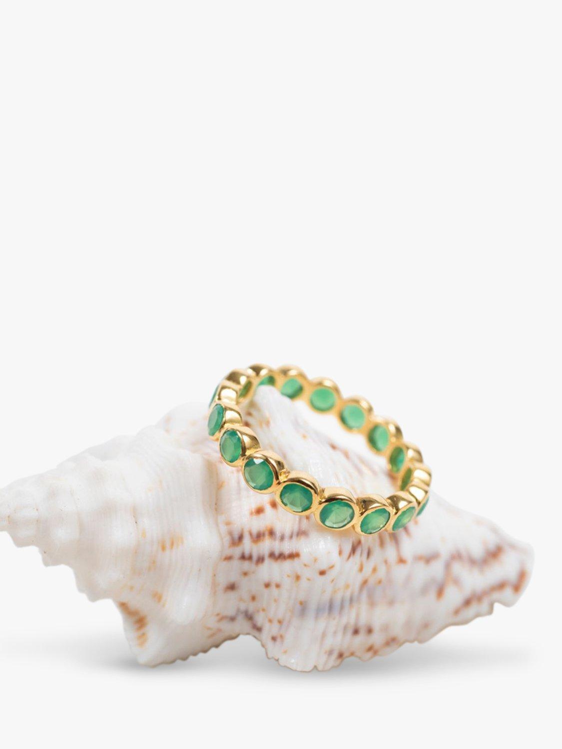 A full band of round vivid green Chrysoprase gemstones set in an 18ct Yellow Gold Vermeil scallop-shaped ring. Chrysoprase is known for its healing qualities as well as the green colour being the ultimate show stopper.