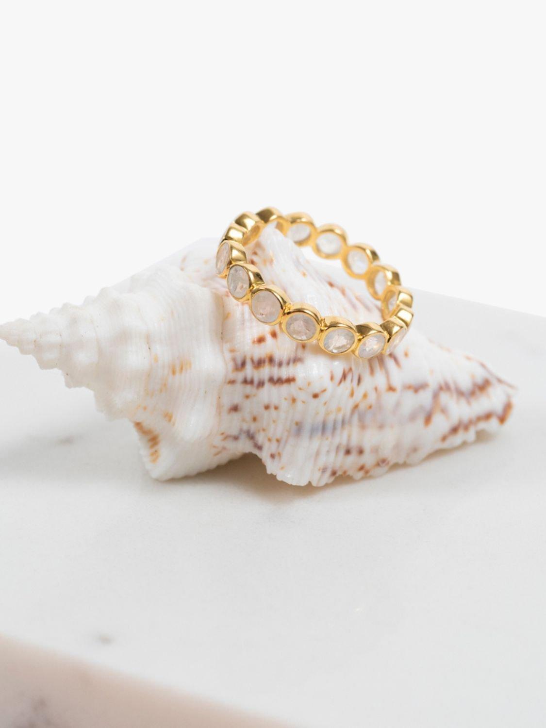 A full band of round Moonstones set in an 18ct Yellow Gold Vermeil scallop-shaped design. Moonstone is believed to bring clarity and balance to those that wear them.