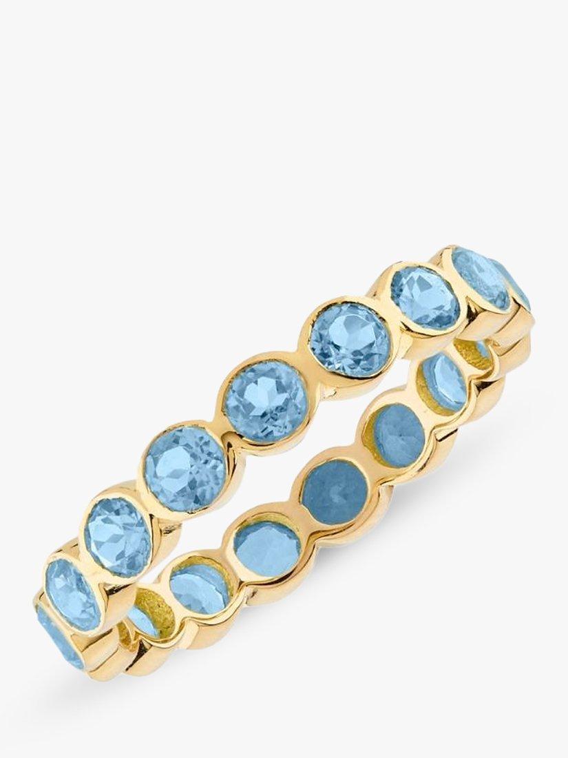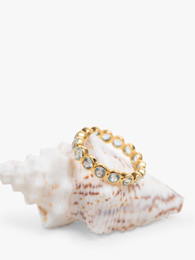 Beautiful bright Blue Topaz gemstones set in an 18ct Yellow Gold Vermeil scallop-shaped ring. Blue Topaz is associated with wisdom and opportunity.